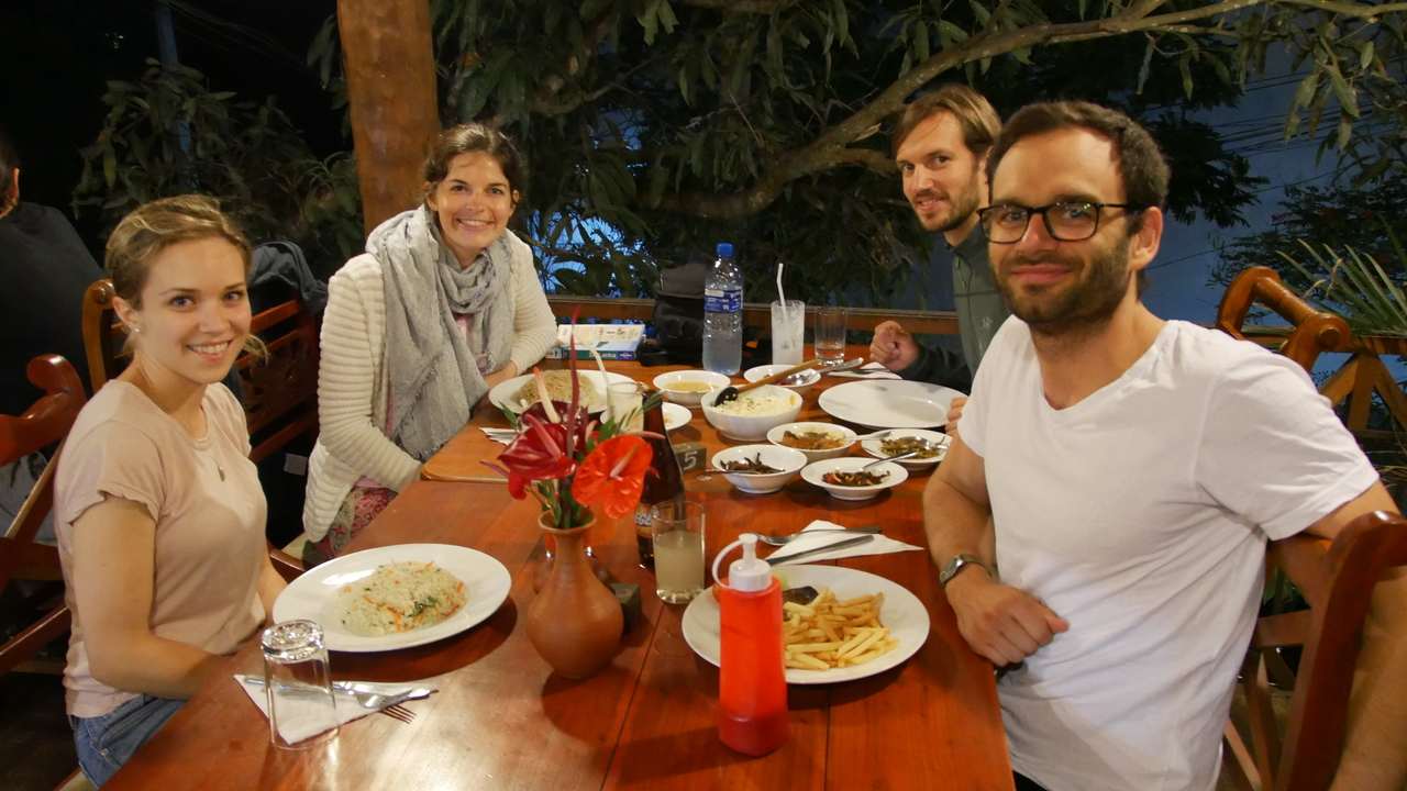 In Kandy angekommen, quetschen wir uns zu zweit samt Gepäck in ein Tuk Tuk, das uns in unsere erste Unterkunft bringt, die wir telefonisch aus dem Bus gebucht haben. Später treffen wir uns mit Marco und Nicole zum Abendessen auf der schönen Terrasse unseres Hotels Mango Garden und genießen zum frischen Mangosaft eine erste Kostprobe der leckeren sri lankischen Curries. Dank Marcos genialen Tipp, einfach einen Stift in die Steckdose zu stecken, können wir anschließend sogar unsere Handys laden. Trotz des Partylärms einiger Backpacker schlafen wir nach zwei Nächten à vier Stunden Schlaf wir die Murmeltiere.