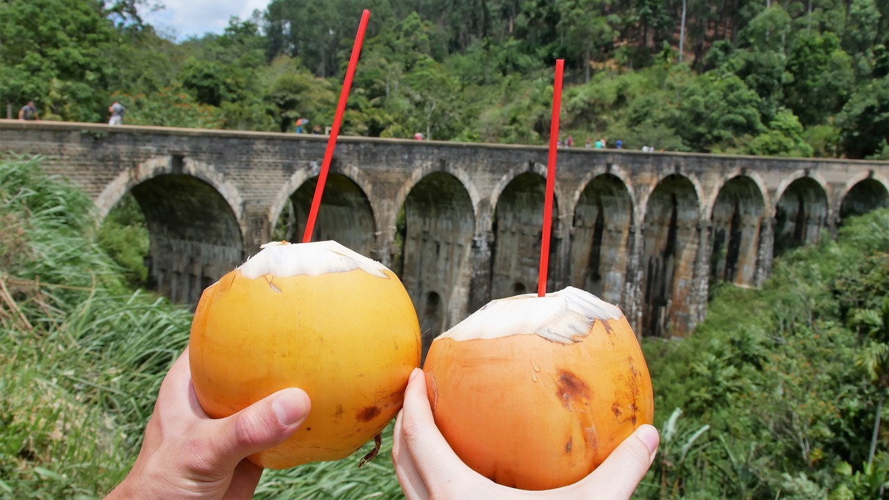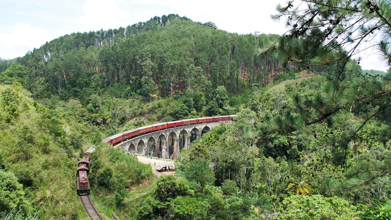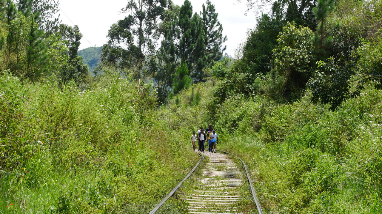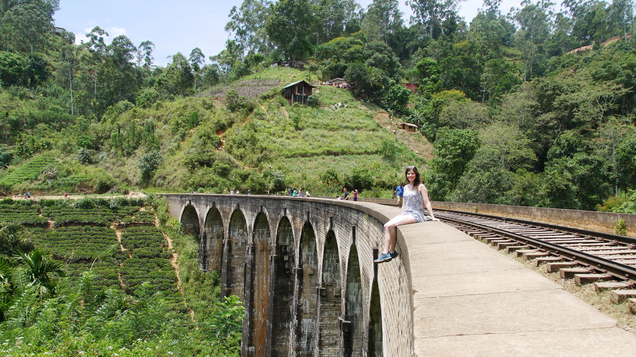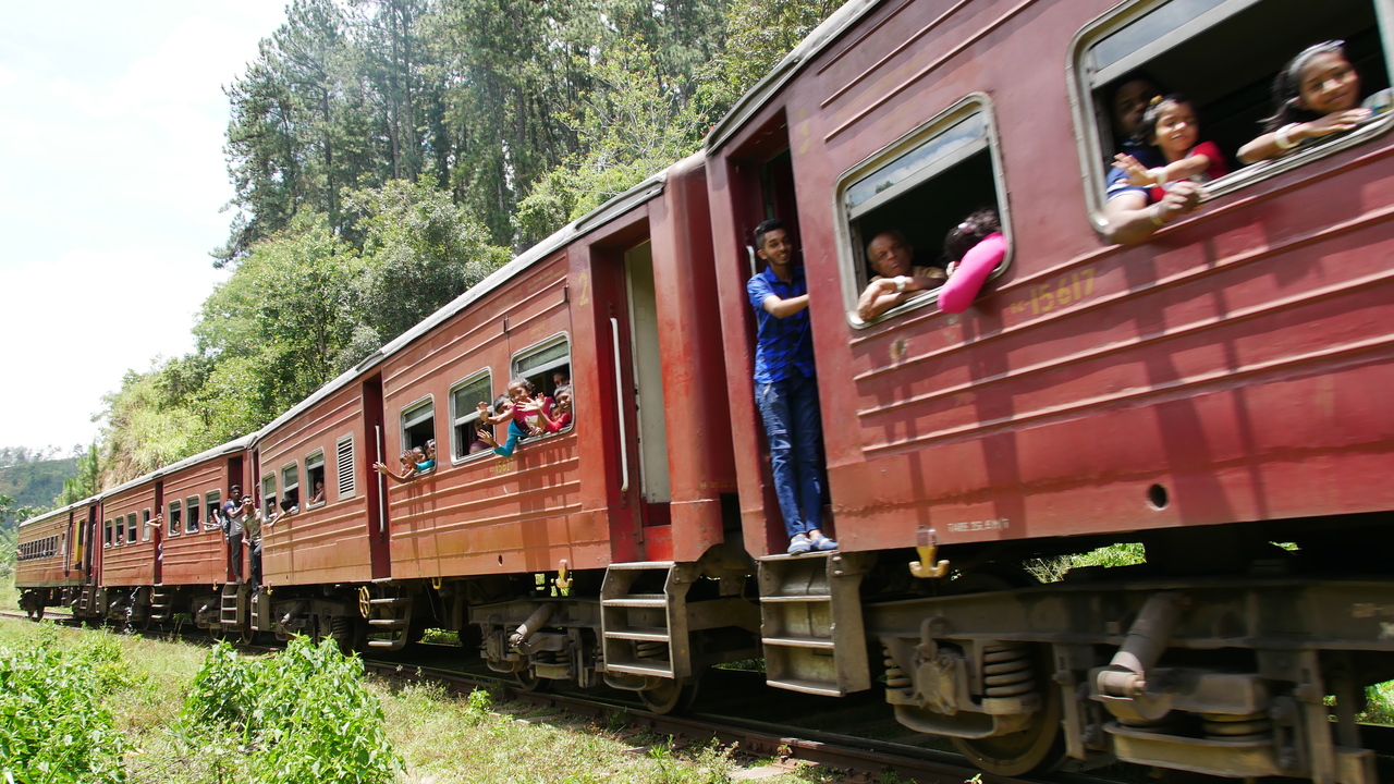 Weiter geht es vorbei an einer Teeplantage für grünen Tee über Trampelpfade zur Nine Arch Bridge, wo wir in einer tollen Regenwaldkulisse beobachten, wie einer der etwa zehn täglichen Züge zwischen Colombo und Badulla vorbeifährt. Von hier aus laufen wir auf den Bahngleisen zurück nach Ella - genau, auf den Gleisen! Das ist in Sri Lanka üblich und ungefährlich, da man die langsam dahintuckernden und pfeifenden Züge schon aus weiter Ferne hört. Es ist eine einzigartige Erfahrung und wir treffen viele nette Einheimische auf den Gleisen und als ein Zug vorbeifährt, winken uns die einheimischen Kinder aus den offenen Fenstern und Türen begeistert zu.