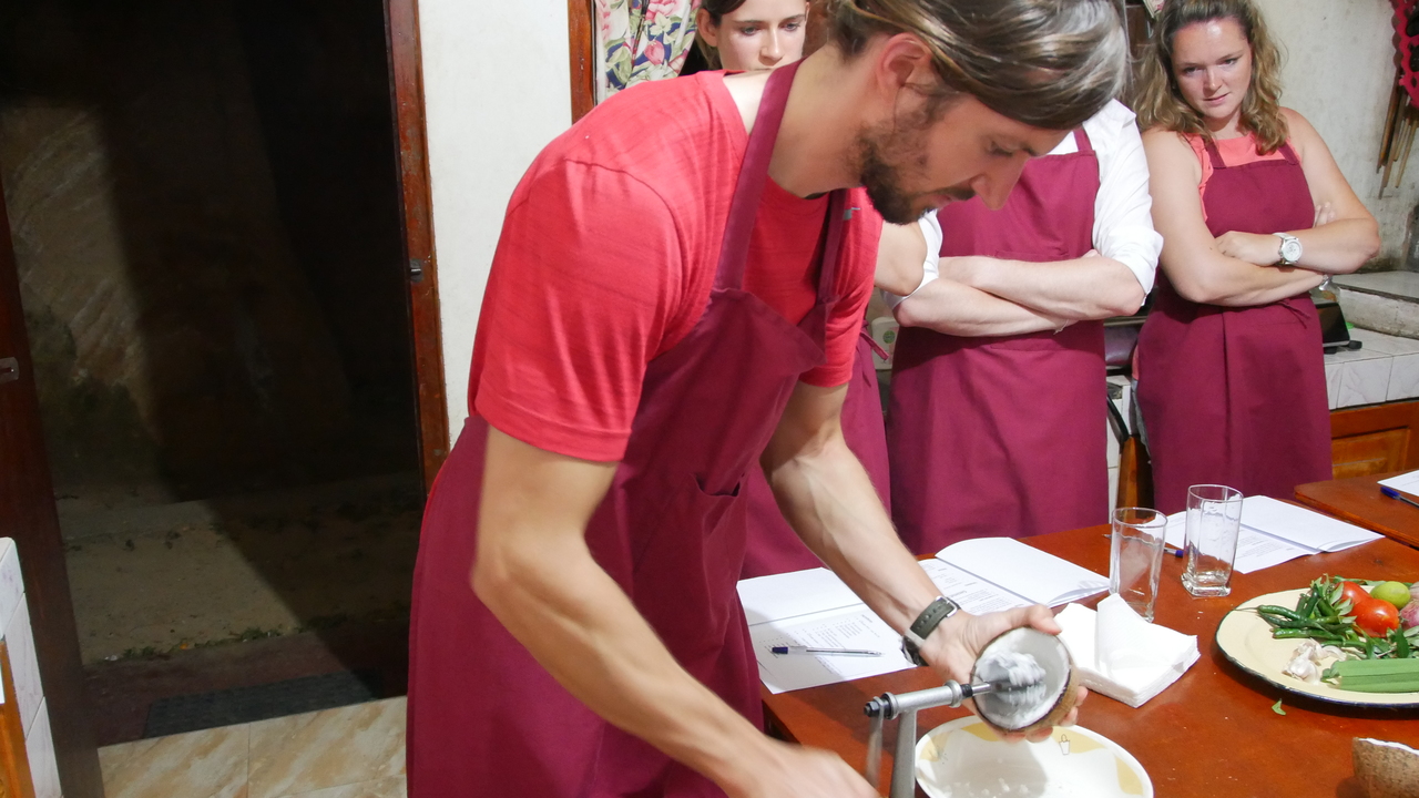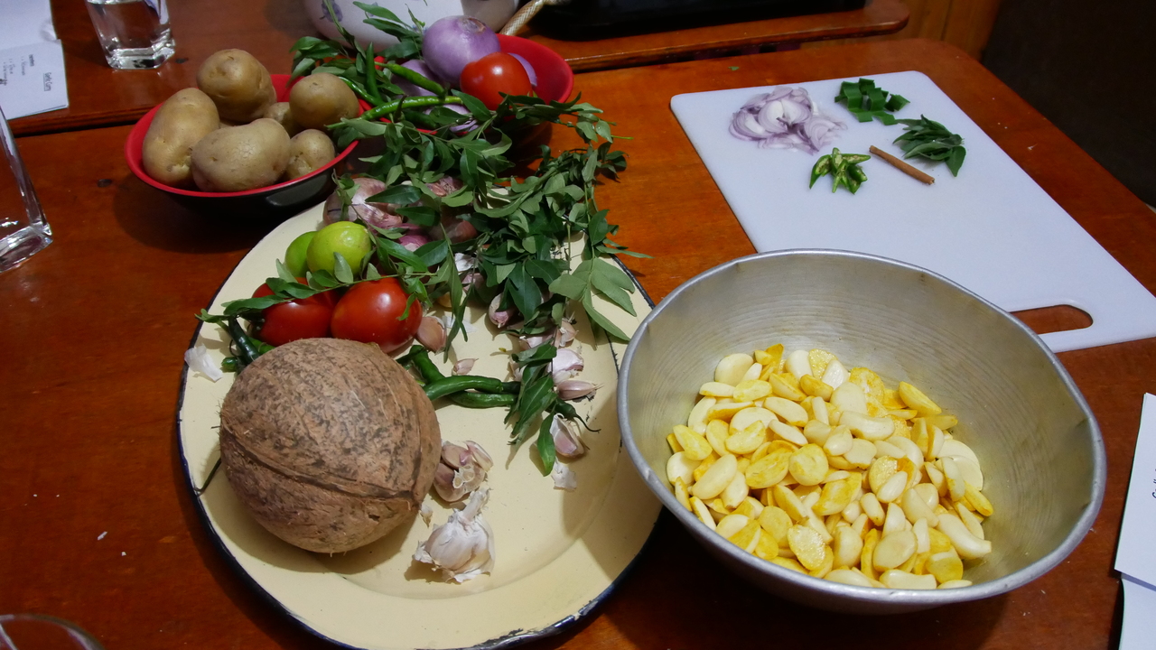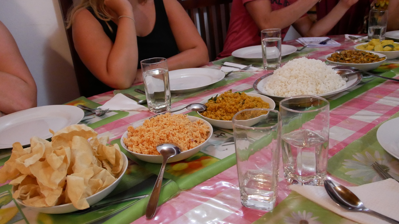 Außerdem machen wir im Ella Spice Garden einen tollen Kochkurs, bei dem wir die Zubereitung verschiedener Curries lernen: das sri-lankische Alltagsgericht Dhal (Linsen-Curry), außerdem Knoblauchcurry (mit 20 Knoblauchzehen pro Person!) und Kartoffelcurry. Daneben kochen wir als Beilagen Coconut Sambol, Reis und Papadams (frittierte Fladen aus Linsenmehl, die innerhalb weniger Sekunden in der Pfanne aufpoppen) und lernen einiges über die verwendeten Gewürze und exotischen Zutaten, von denen wir uns vorher im Gewürzgarten einen ersten Eindruck verschaffen konnten. Da wir nur acht Teilnehmer sind, ist der Kurs sehr persönlich und die entspannte und witzige Art unseres jungen Kochlehrers macht den Abend zu einem kurzweiligen Erlebnis. Im Anschluss lassen wir uns dann gemeinsam unser selbst gekochtes, köstliches Abendessen schmecken.
