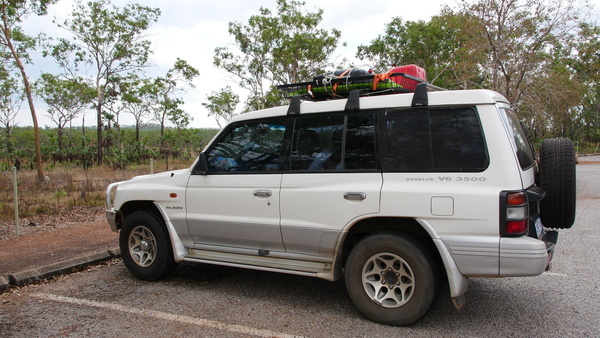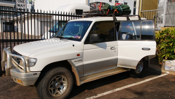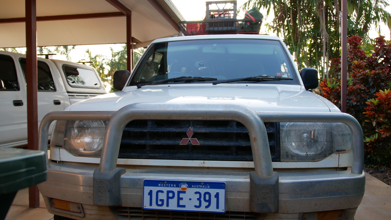 Bevor wir mit unserem frisch erstandenen Paji das Outback unsicher machen, bringen wir ihn auf Vordermann und komplettieren unsere Campingausstattung. Wir starten mit einer Grundreinigung, besorgen zwei neue Geländereifen und vereinbaren einen Termin zur Inspektion. Man weiß ja nie. Unser Plan ist es, das Fahrzeug zu einer ausklappbaren Wohnung umzufunktionieren – mit einem Dachzelt als Schlafzimmer und einer Markise als Wohnzimmer. Schließlich ist es unser erstes Eigenheim. Dachzelt und Markise bestellen wir telefonisch beim „4WD Supacenter“ von der Marke Adventure King, da die Ausrüstungsgeschäfte in Darwin nur die teuren Marken vorrätig haben und wir hunderte von Dollars sparen können. Ob sich die in Aussicht gestellte Lieferdauer von etwa einer Woche bewahrheiten wird, wird sich zeigen. Das aus Sydney gelieferte Dachzelt muss immerhin 4.400 Kilometer quer über den Kontinent in einem Road Train zurücklegen.