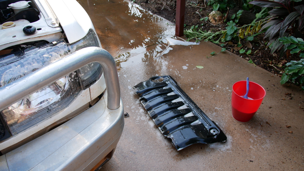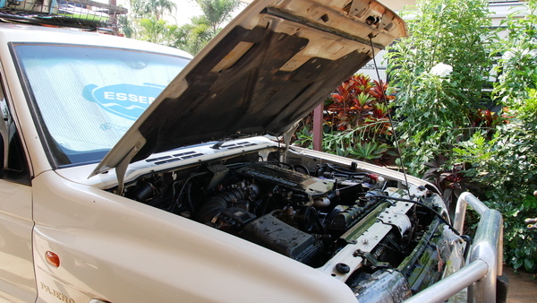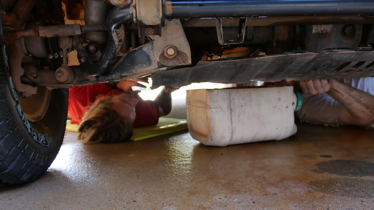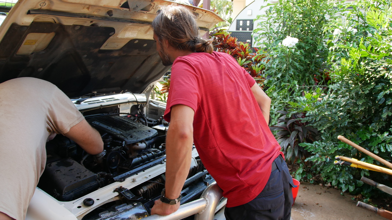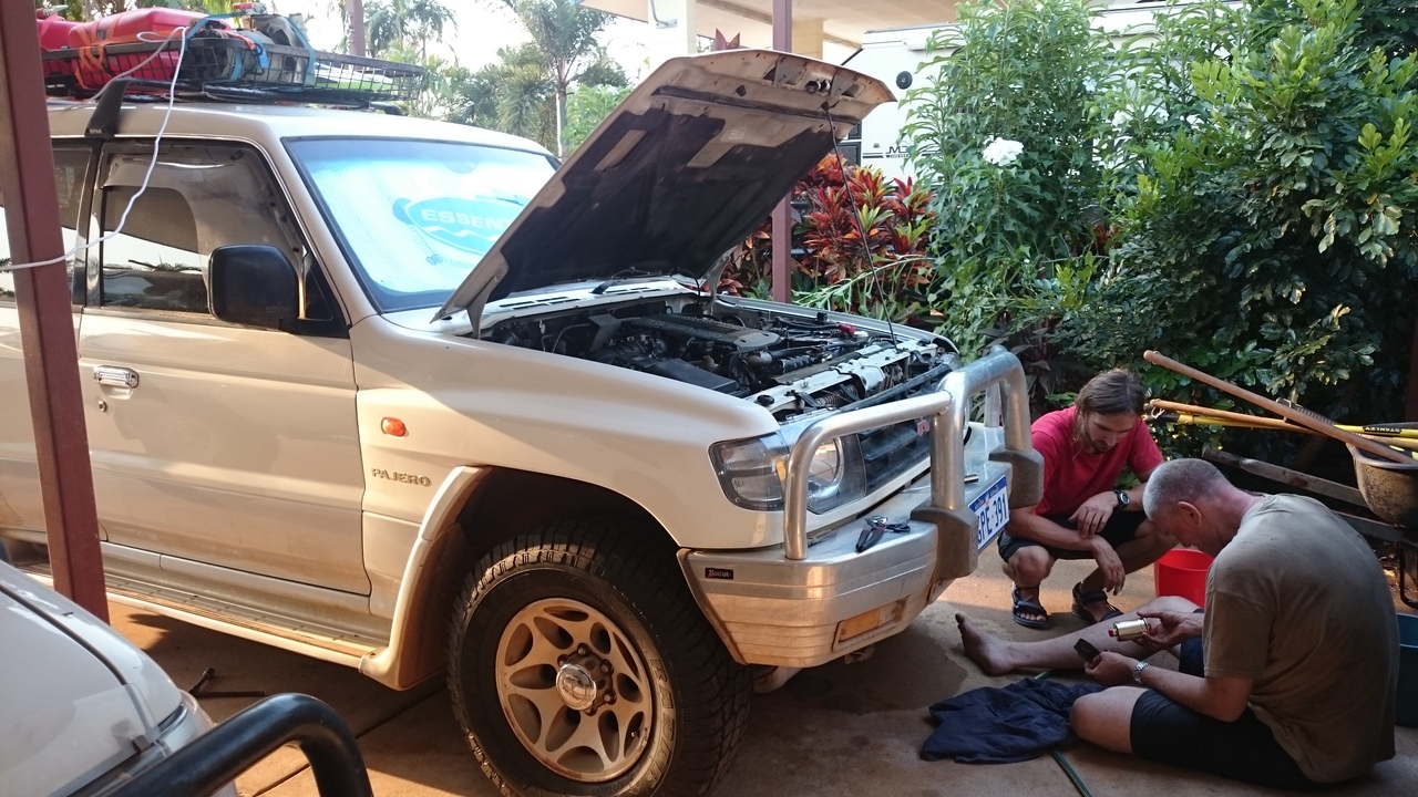 "Do you need a hand with the vehicle?“ Der nette Nachbar Tim, der die Fahrzeugsuche schon vorher interessiert verfolgt hat, begutachtet neugierig unser Fahrzeug. Nach kurzer Zeit stehen wir über den Motor gebeugt da und er gibt Tipps, was man alles machen könnte: Motorraum putzen, Öl wechseln, alle möglichen Flüssigkeiten überprüfen und austauschen… Unser Inspektionstermin ist allerdings erst in fünf Tagen und wir haben keine Ahnung von diesen Dingen. Tim scheint es geradezu in den Fingern zu jucken, unseren alten Paji auf Vordermann zu bringen und wir erfahren, dass er über 20 Jahre lang als Mechaniker für die australische Air Force gearbeitet hat. Kurz darauf putzen Anna und Tim den Motorraum, während Tims Bruder Dan und Max Motoröl und alle möglichen Flüssigkeiten besorgen: Getriebeöl, Verteilergetriebeöl, Vorder- und Hinterdifferentialöl, Ölfilter, Benzinfilter und Kühlerflüssigkeit. Die nächsten eineinhalb Tage verbringen Tim und Max die meiste Zeit unter dem Geländewagen (zum Glück bietet der Paji so viel Bodenfreiheit), wechseln Flüssigkeiten und Filter und dichten alle Schrauben mit Teflon-Band ab. Nun leckt auch die Getriebeschraube nicht mehr. Danach putzen wir das Auto noch gründlich von unten, um wie Tim sagt, mögliche Schäden oder Lecks aufzudecken. Wir haben das Gefühl, dass es ihm zudem einfach Spaß macht. Der Benzin-Geruch in Max Haaren wird uns noch ein paar Tage an die Schrauber-Aktion erinnern.