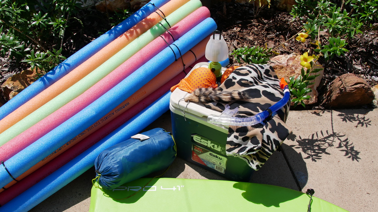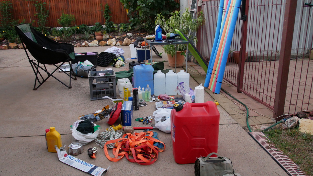 Bei der Inventur der vorhandenen Ausrüstung finden wir neben allerlei Nützlichem wie Wasserkanistern, Campingstühlen, Aufbewahrungsboxen und Werkzeug einige lustige Accessoires, die sich gut für eine Bad Taste Party eignen würden: witziger Fuchsschwanz, schrille Sonnenbrille und Klamotten mit Leopardenmuster. Außerdem stoßen wir auf ein paar Dinge, die man als Australienreisender gut gebrauchen kann wie ein Bodyboard, ein Floß aus Schwimmnudeln und einen Wasserkocher mit 12 Volt Anschluss.