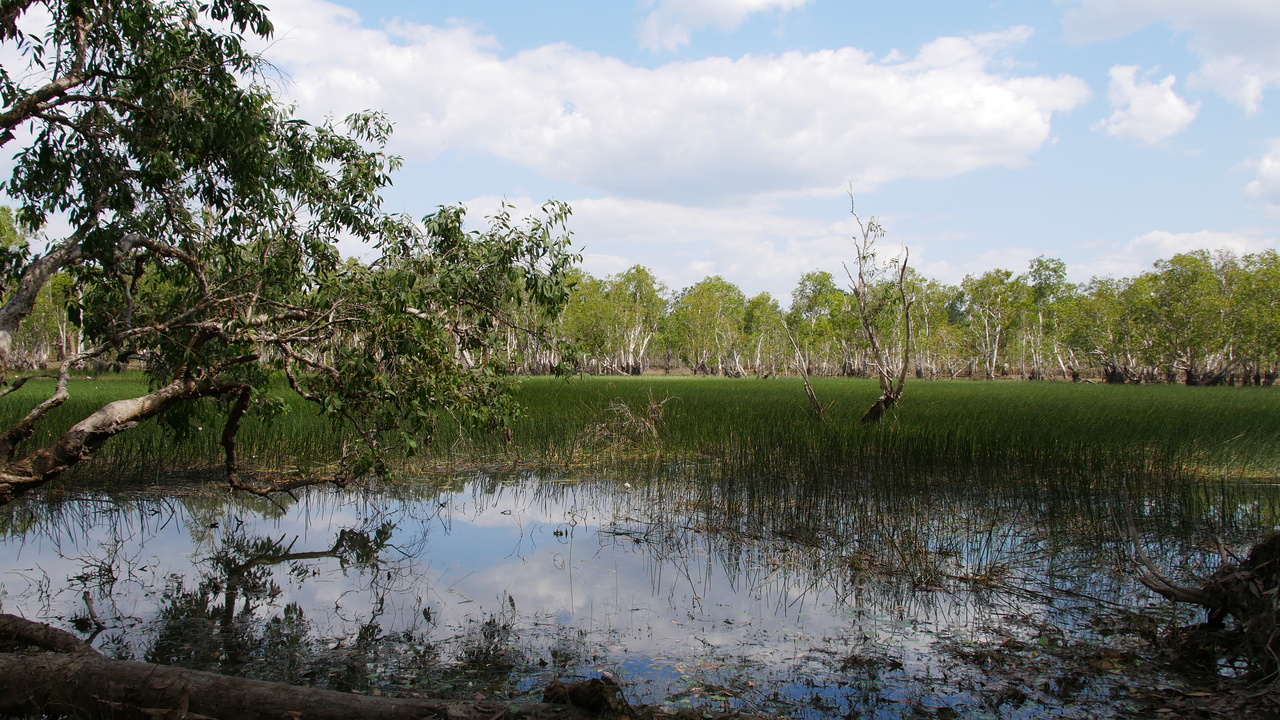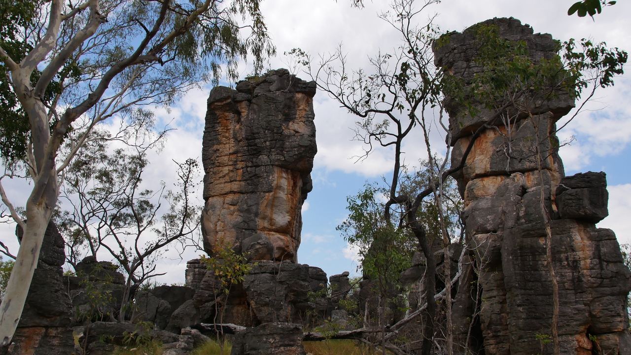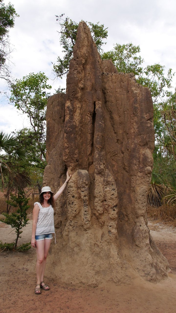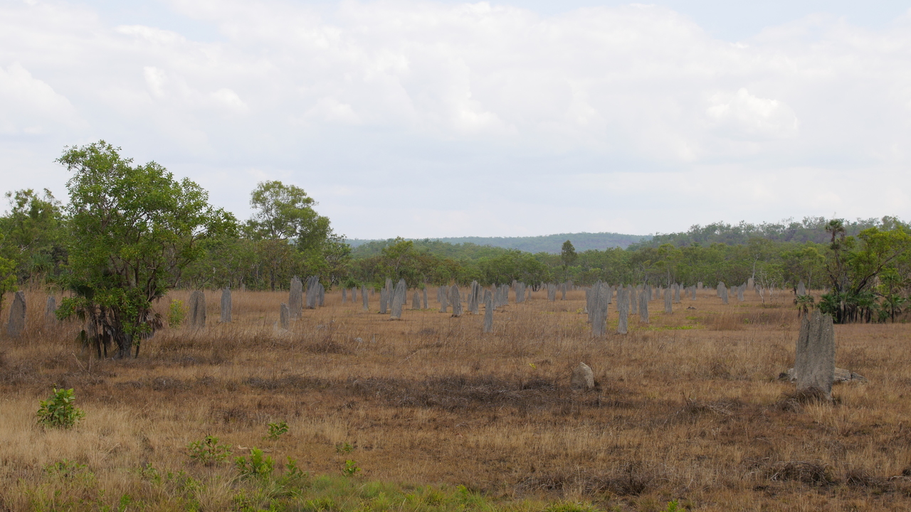 Was wie ein episches Schlachtfeld mit hunderten von grauen Grabsteinen anmutet, sind tatsächlich Termitenhügel, die wie Kompassnadeln in perfekter Nord-Süd-Richtung ausgerichtet sind, sodass die Temperaturen darin optimal geregelt sind. Das Naturphänomen wird daher hier im Litchfield Nationalpark als magnetischer Termitenhügel bezeichnet. Abgesehen davon fasziniert uns auch schon der Anblick der vielen, teils riesigen „normalen“ Termitenhügel, die hier im Norden Australiens überall zu finden sind.