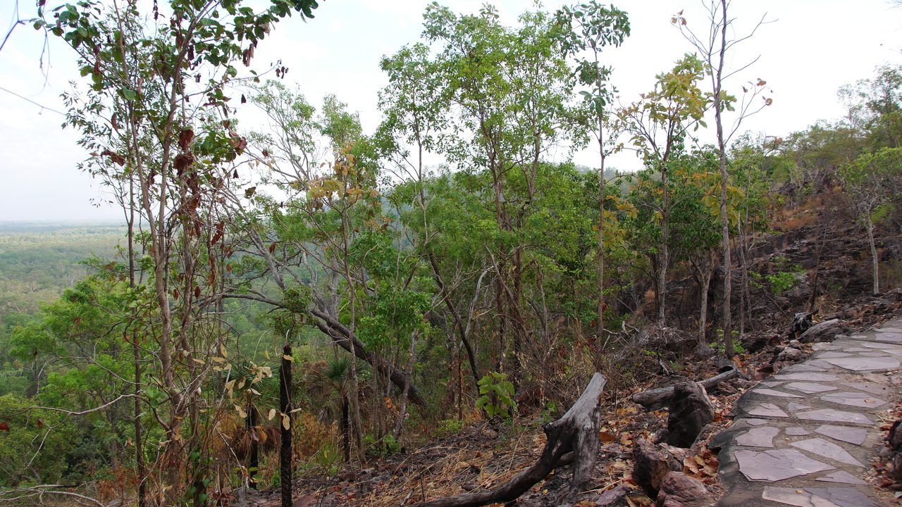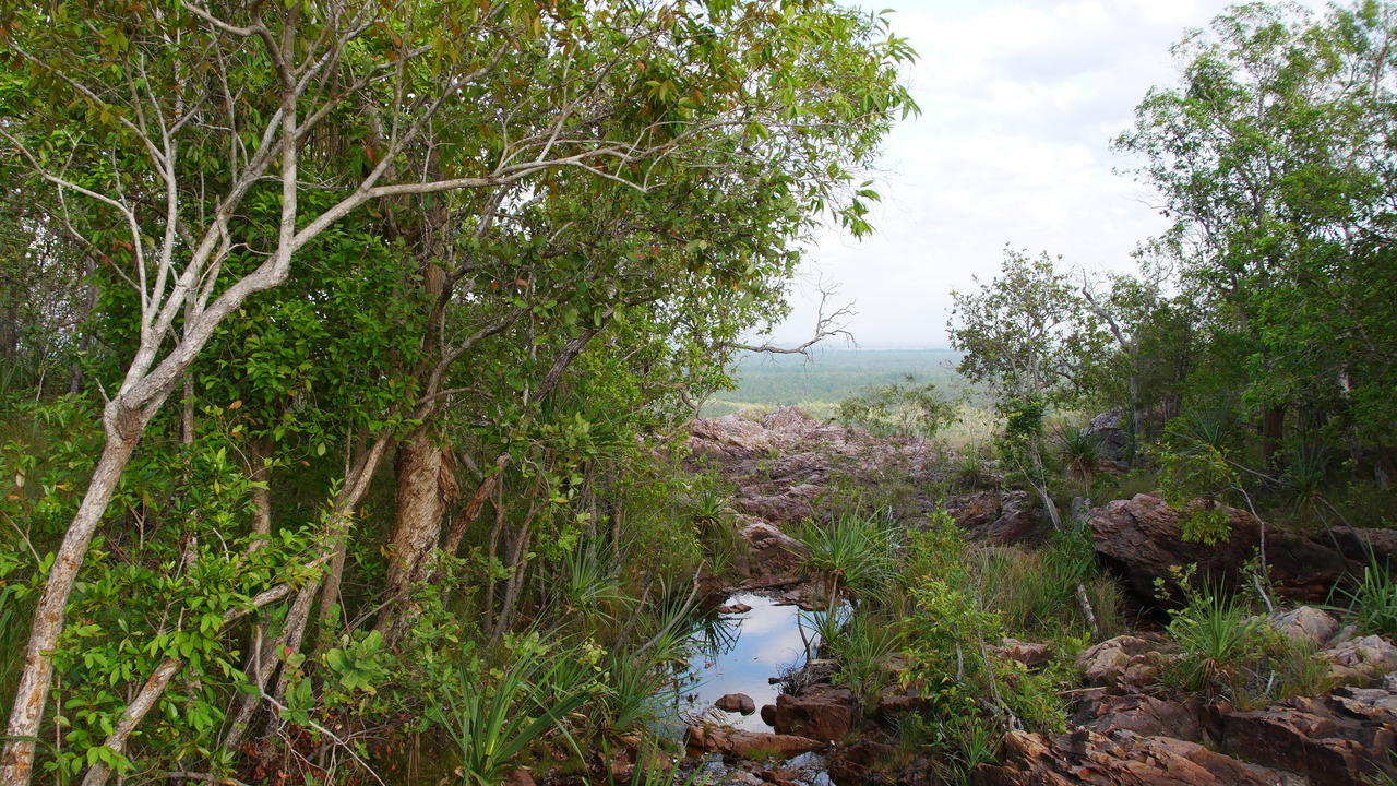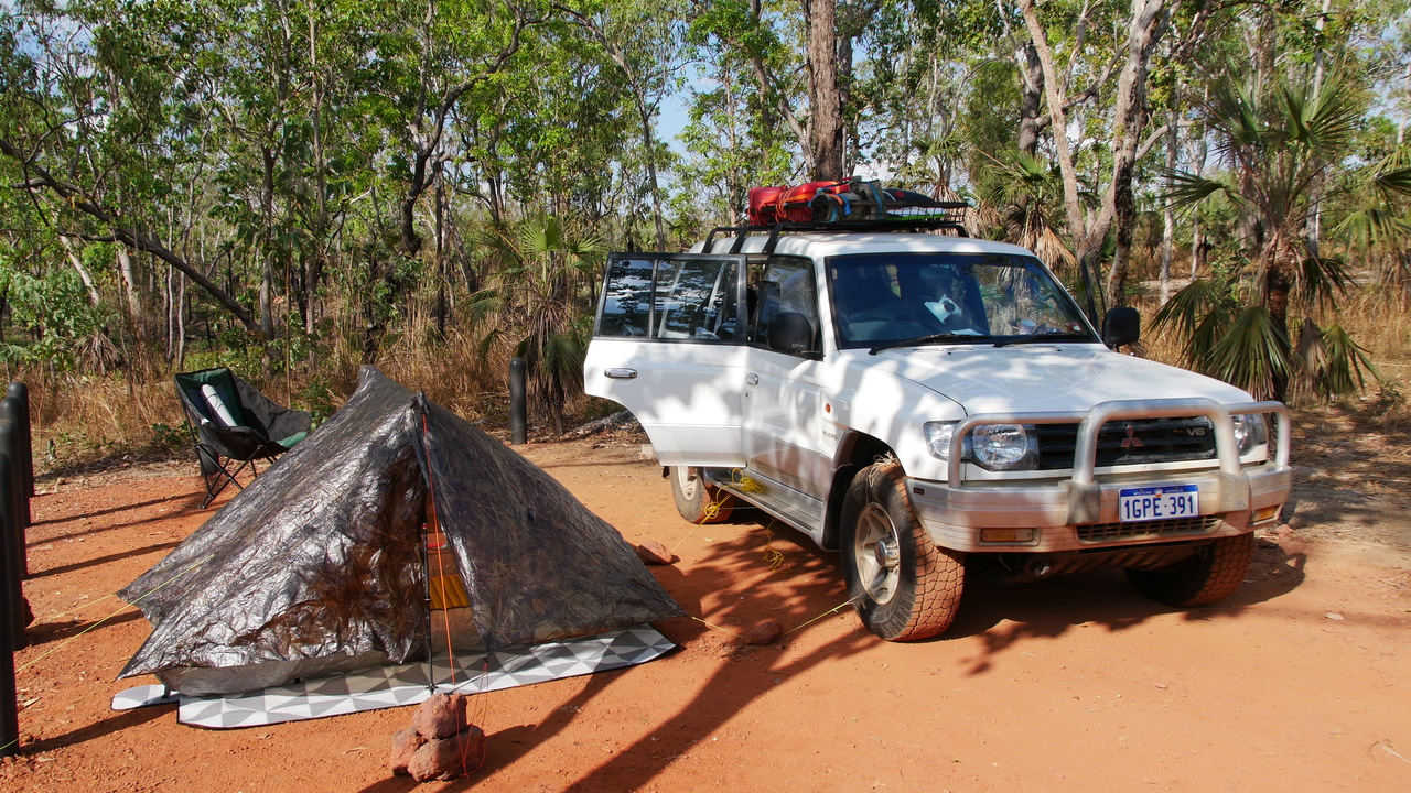 Unsere Premiere im australischen Bushcamping erleben wir im Florence Falls Old 4WD Campground. Weil unser Dachzelt noch auf dem Weg quer über den australischen Kontinent ist, müssen wir uns fürs erste mit unserem ultraleichten Trekking-Zelt begnügen. Da es ein Ding der Unmöglichkeit ist, das Zelt mit Heringen im roten, steinigen Boden zu fixieren, behelfen wir uns einiger Steinbrocken und unserem Paji zur Befestigung. Als das Camp steht, kühlen wir uns im idyllischen Naturpool der Florence Falls ab. Abends testen wir unsere ThermaCell zur Abwehr von Moskitos, in der von einer kleinen Flamme blaue, behandelte Plättchen geruchslos erwärmt werden. Sie scheint zu wirken, jedenfalls bleiben wir von Moskitos verschont und schlafen überraschend gut und gemütlich in unserm Zelt. Nervig sind tagsüber jedoch die Fliegen, die einen gerne mal umschwärmen und mit besonderer Vorliebe im Gesicht landen. Aber auch hierfür werden wir bald eine Abhilfe finden.