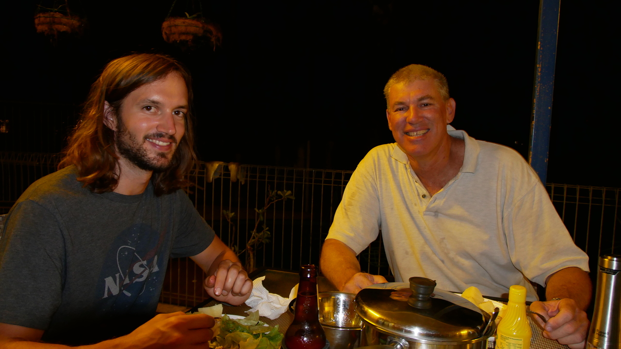 Sonntagnacht kommt Tim zurück, während Leanne noch für ein paar Tage auf Dienstreise im Süden Australiens unterwegs ist. Wir warten noch immer auf unser Dachzelt und verbringen auf Tims Einladung hin ein paar sehr vergnügliche Schlemmerabende mit ihm. Wir bekochen ihn mit ursprünglich vegetarischen Gerichten wie Buchweizen mit Tofustreifen und gerösteten Süßkartoffeln mit Kirchererbsen und Sesamsauce, die er mit gegrilltem Barramundi abrundet. Zum Nachtisch gibt es von Anna gebackenen Blaubeerkuchen, von Tim besorgte Donuts und eine Kostprobe seines „self-blended“ Portweins. Als wir mit einem Thick Chocolate Smoothie mit Avocado und Blattspinat aufwarten, ruft Tim prompt bei Dörte gegenüber an und fragt, ob sie uns dazu angestiftet hat, ihm einen „tree hugger“ Smoothie aufzutischen. Erst als die Gläser leer sind, erfahren wir, dass er den Smoothie auch sehr lecker fand. Tims Lebensmotto ist übrigens „Life is not a dress rehearsal“ - Das Leben ist keine Generalprobe.