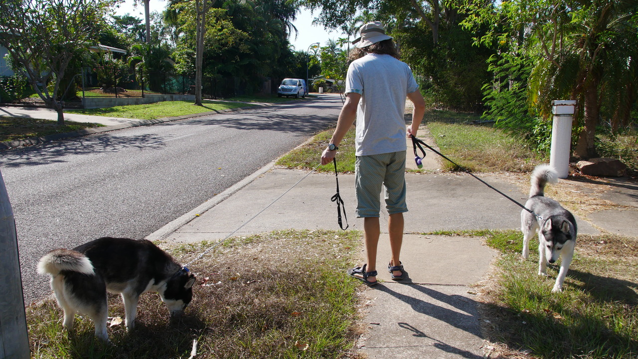 Am Abend zeigen uns Tim und Leanne ihr Heim und wie die Tiere gefüttert werden. Dann sitzen wir mit ihnen und einem Anglerfreund aus den USA zusammen, der zurzeit in Darwin stationiert ist und sich übers Wochenende Tims Boot ausleiht. Der Abend wird randvoll mit lustigen Angelanekdoten gefüllt. Später fährt der Anglerfreund die beiden zum Flughafen und wir haben das Haus für uns alleine. Wir nutzen das Wochenende, um unseren Blog live zu schalten und mit Artikeln zu füttern. Zwischendurch schwimmen wir eine Runde im Pool, verwöhnen die verschmuste Katze Misha und gehen mit den beiden Huskys Gassi. Iuki und Tiko sind davon so begeistert, dass sie uns wie Schlittenhunde in einem Affentempo durch die Straßen ziehen, vorbei an Zäunen, hinter denen uns gefühlte Horden von Hunden hinterher bellen und kläffen. Wie wir feststellen, hat fast jeder in der Nachbarschaft mindestens einen Hund. Vielleicht auch, um Autoknacker abzuschrecken?