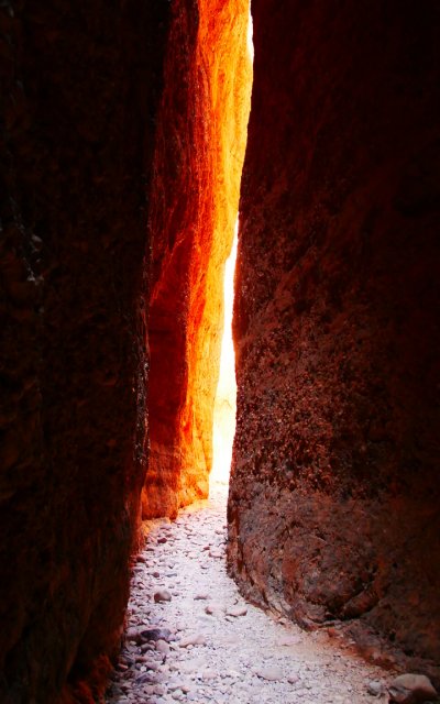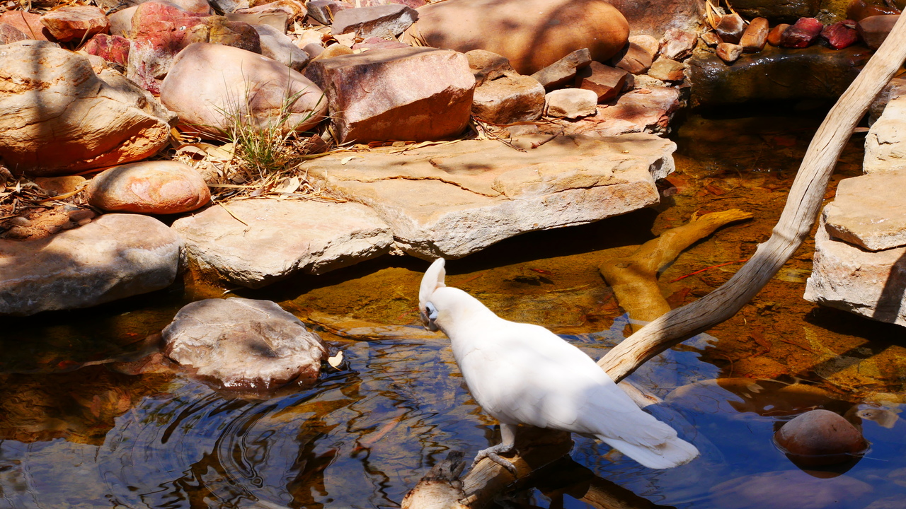 „Holy Moly!“ ruft ein kleiner Junge staunend. Die Echidna Chasm ist wirklich beeindruckend, wie sie sich als immer enger werdende Felsspalte durch den Sandstein zieht. Gegen 11 Uhr steht die Sonne im perfekten Winkel und bringt die rötlichen Wände der Schlucht zum Leuchten. Auch hier hat ein Bower Bird ein Nest errichtet aus allerlei hellen Materialien, die die Schlucht so hergibt.