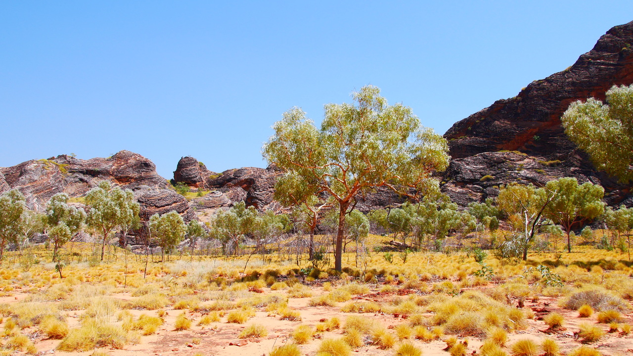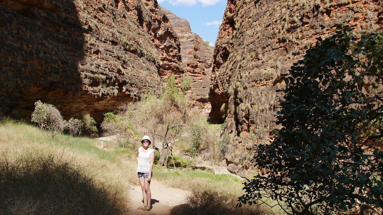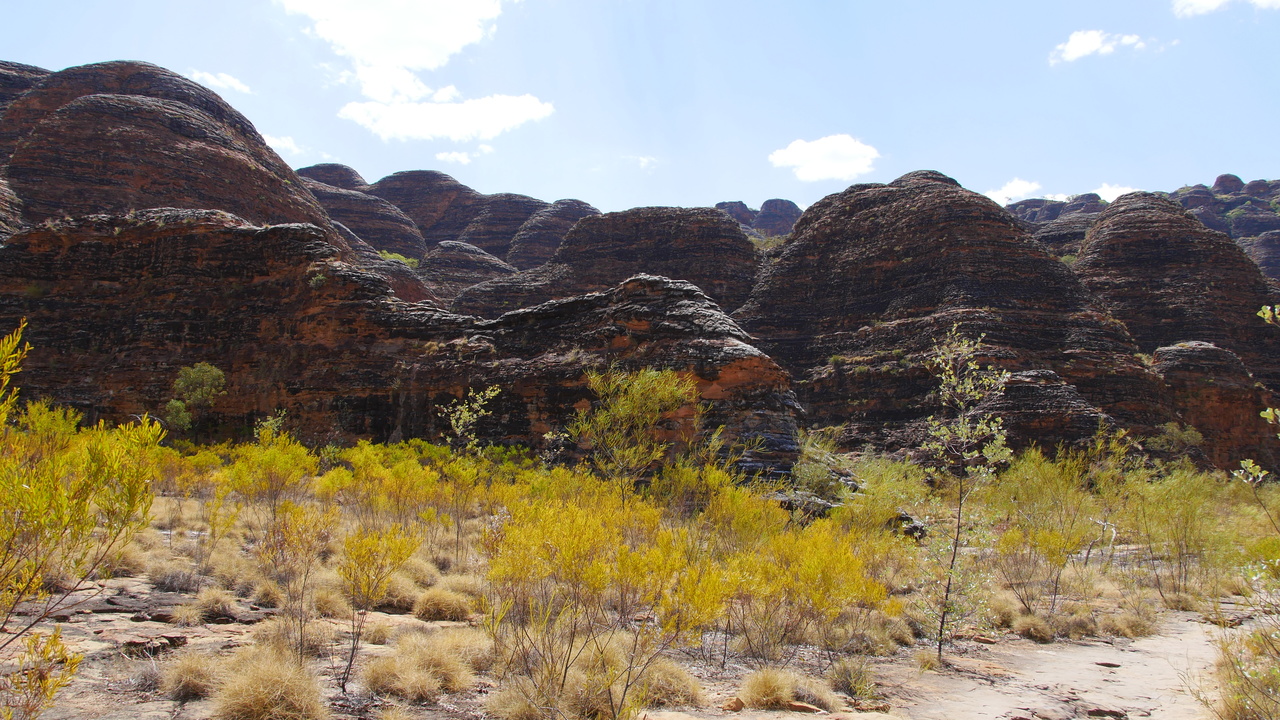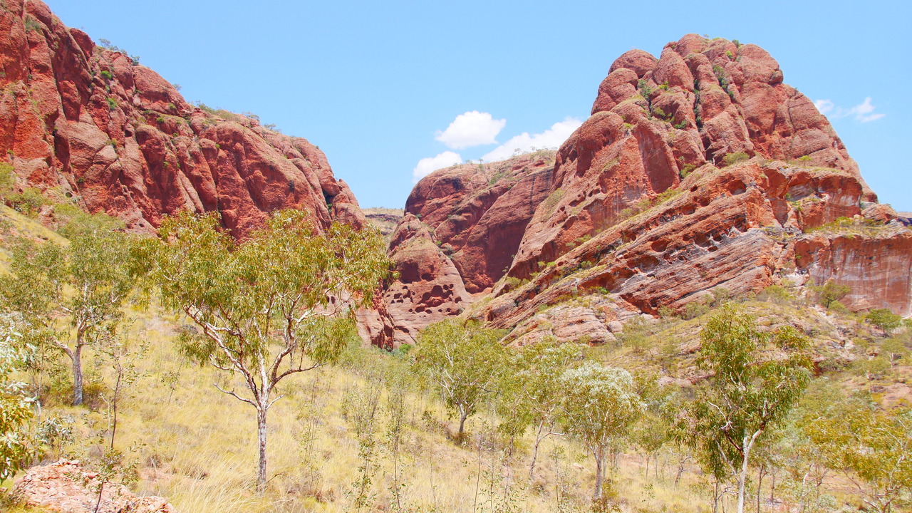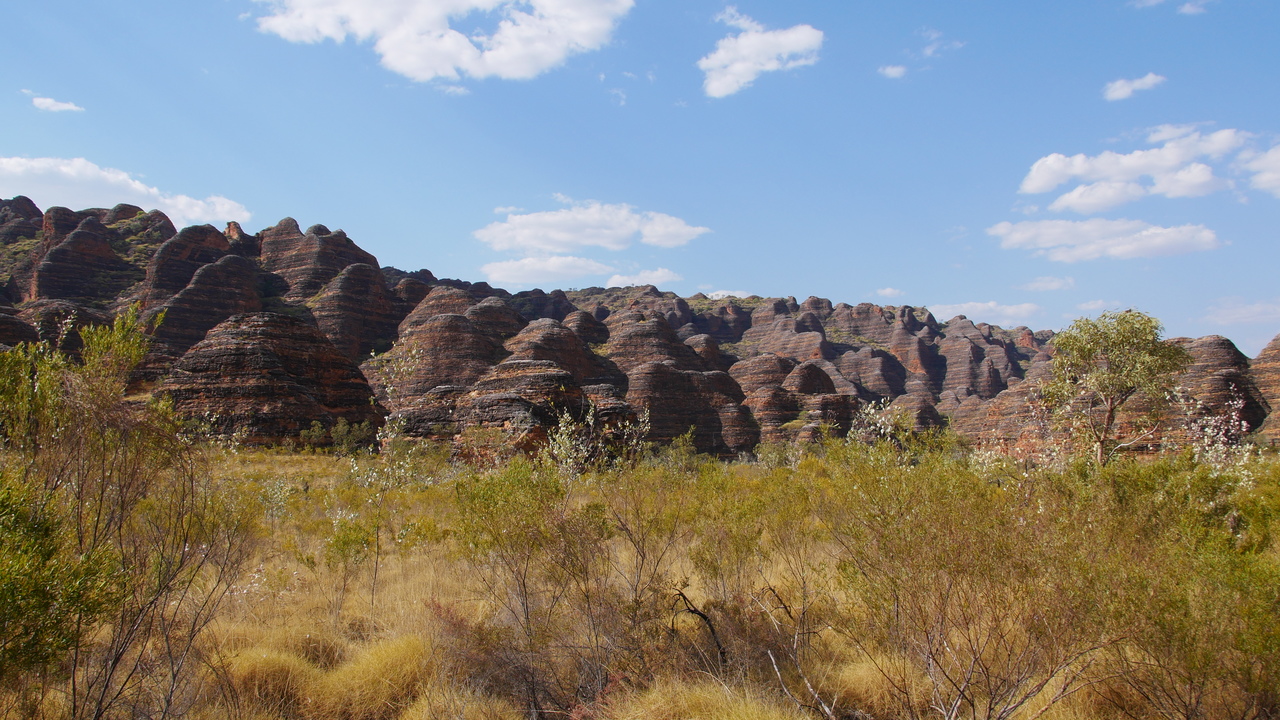 An ocker-schwarz-gestreifte Bienenstöcke erinnern die runden Kuppen der Sandsteinformationen, die den Süden des Nationalparks übersäen. Die Felsen der Bungle Bungle Range, deren orangene Farbe durch Eisenoxid-Ablagerungen verursacht wird, sind bis zu 200 Meter hoch. Die ausgetrockneten Flussbetten mit feinstem weißen Sand geben uns das Gefühl, geradewegs zum Strand zu laufen - dabei ist das Meer über 200 Kilometer entfernt. In der Cathedral Gorge weht eine angenehme kühle Brise und das riesige Amphitheater am Ende der Schlucht bietet ein tolles Echo, das die Flügelschläge einer Krähe wie magisch verstärkt.