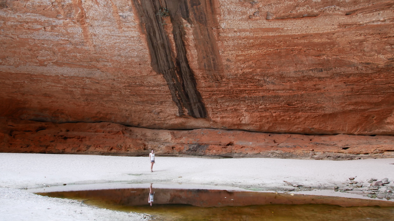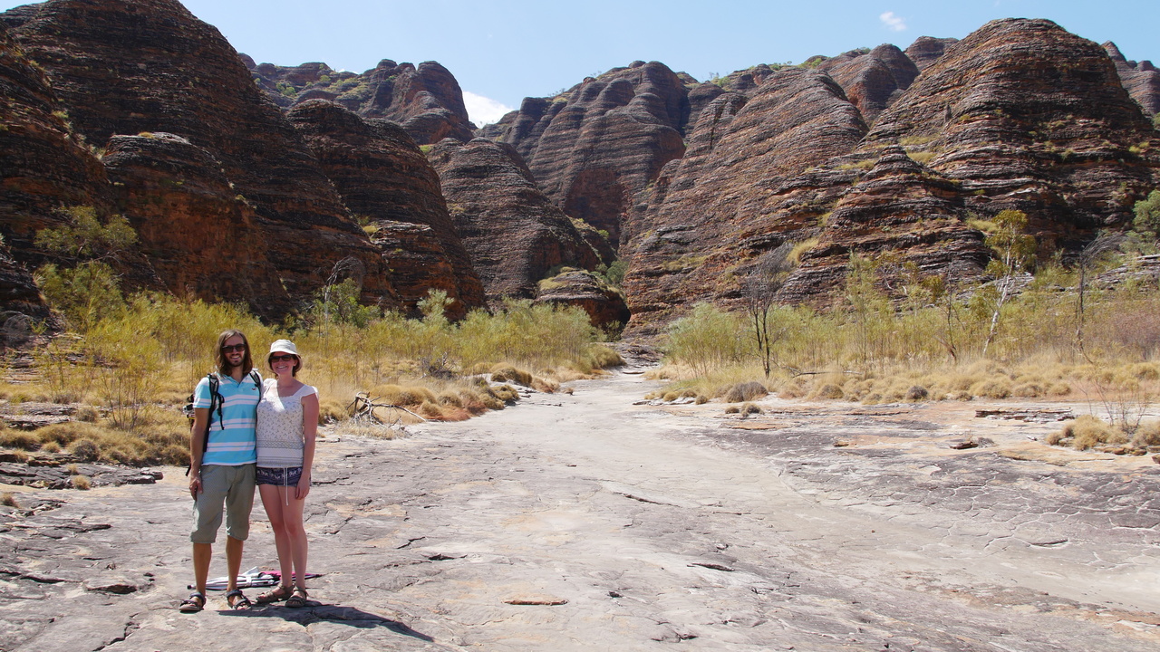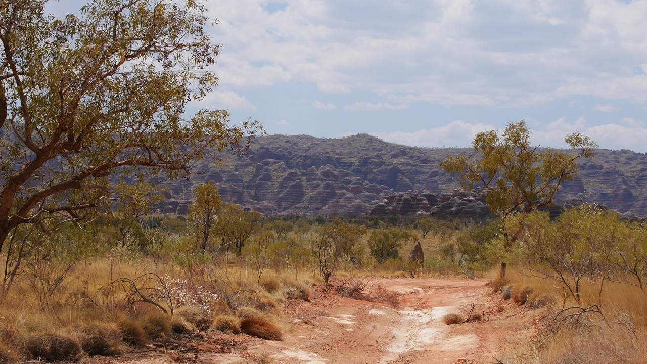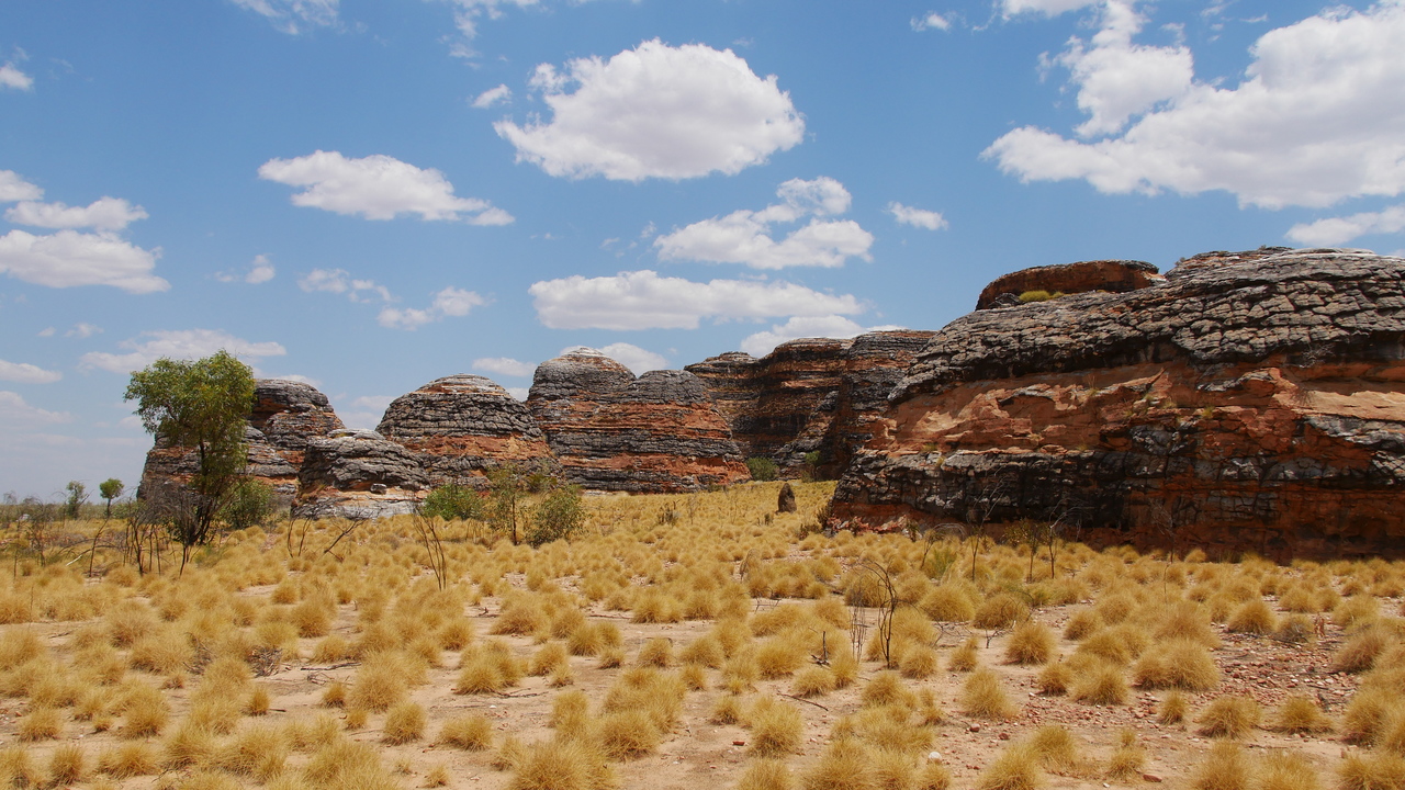 An ocker-schwarz-gestreifte Bienenstöcke erinnern die runden Kuppen der Sandsteinformationen, die den Süden des Nationalparks übersäen. Die Felsen der Bungle Bungle Range, deren orangene Farbe durch Eisenoxid-Ablagerungen verursacht wird, sind bis zu 200 Meter hoch. Die ausgetrockneten Flussbetten mit feinstem weißen Sand geben uns das Gefühl, geradewegs zum Strand zu laufen - dabei ist das Meer über 200 Kilometer entfernt. In der Cathedral Gorge weht eine angenehme kühle Brise und das riesige Amphitheater am Ende der Schlucht bietet ein tolles Echo, das die Flügelschläge einer Krähe wie magisch verstärkt.