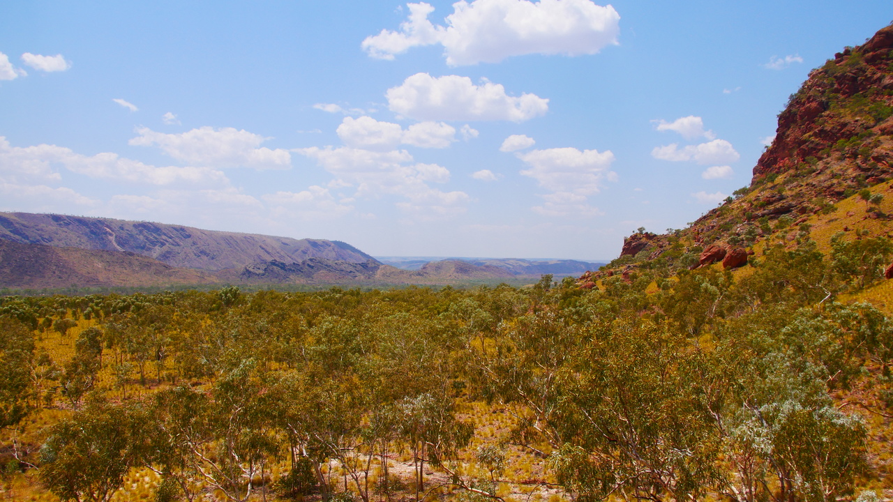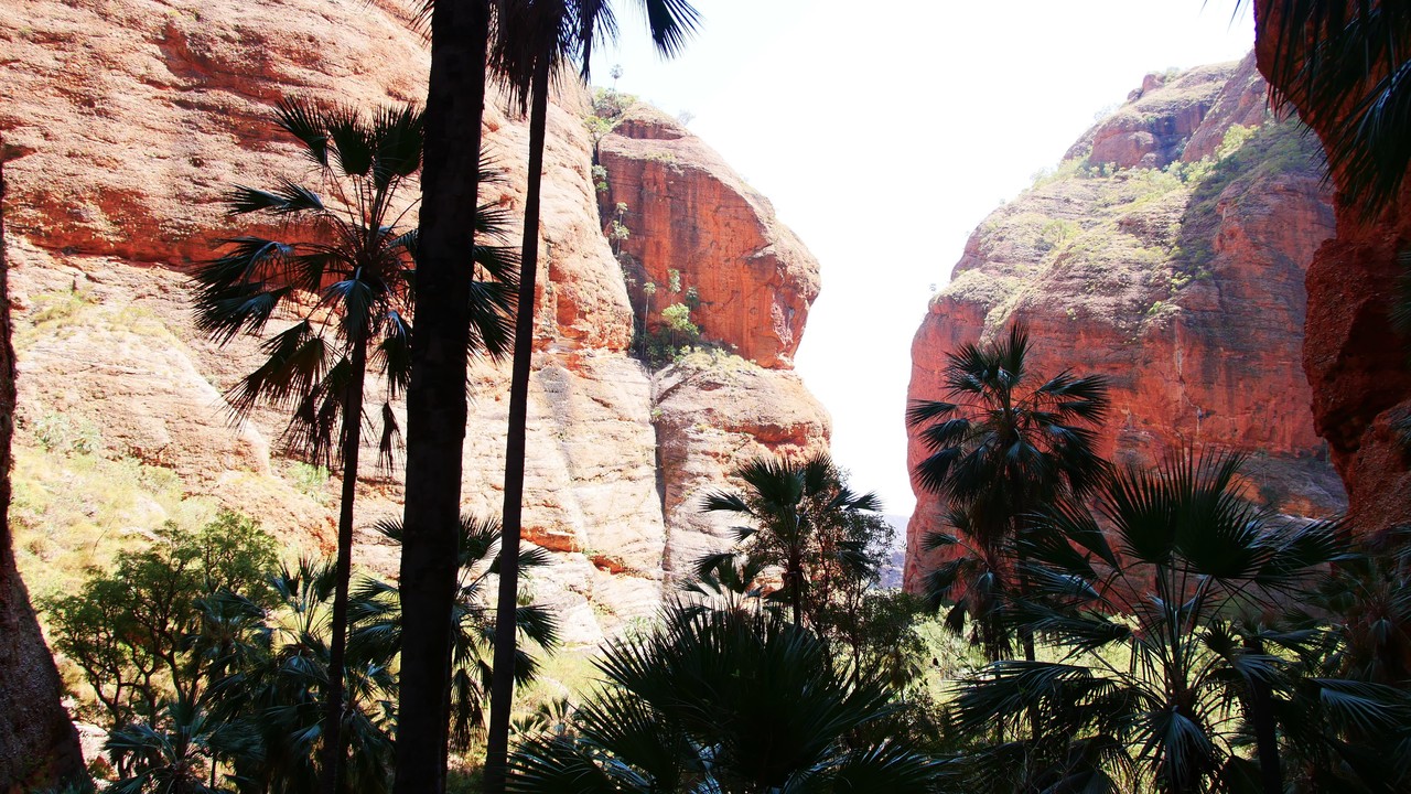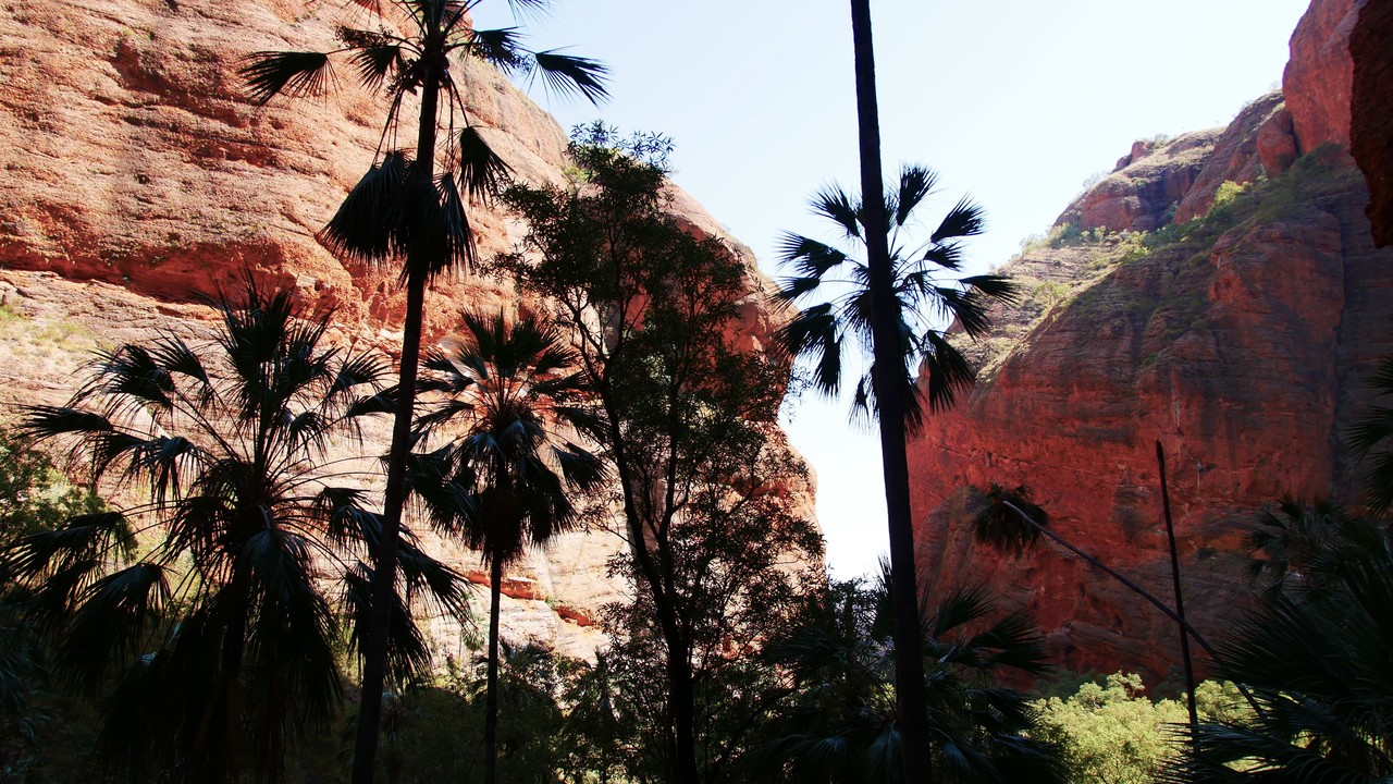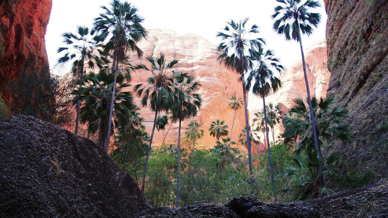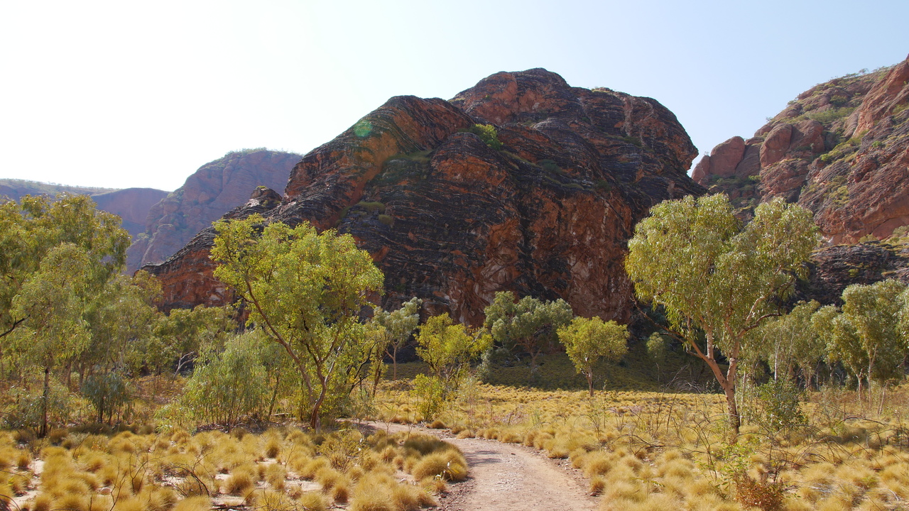 An ocker-schwarz-gestreifte Bienenstöcke erinnern die runden Kuppen der Sandsteinformationen, die den Süden des Nationalparks übersäen. Die Felsen der Bungle Bungle Range, deren orangene Farbe durch Eisenoxid-Ablagerungen verursacht wird, sind bis zu 200 Meter hoch. Die ausgetrockneten Flussbetten mit feinstem weißen Sand geben uns das Gefühl, geradewegs zum Strand zu laufen - dabei ist das Meer über 200 Kilometer entfernt. In der Cathedral Gorge weht eine angenehme kühle Brise und das riesige Amphitheater am Ende der Schlucht bietet ein tolles Echo, das die Flügelschläge einer Krähe wie magisch verstärkt.