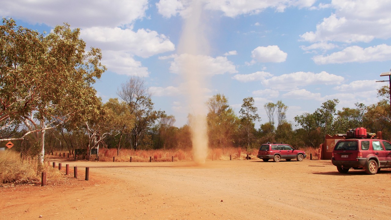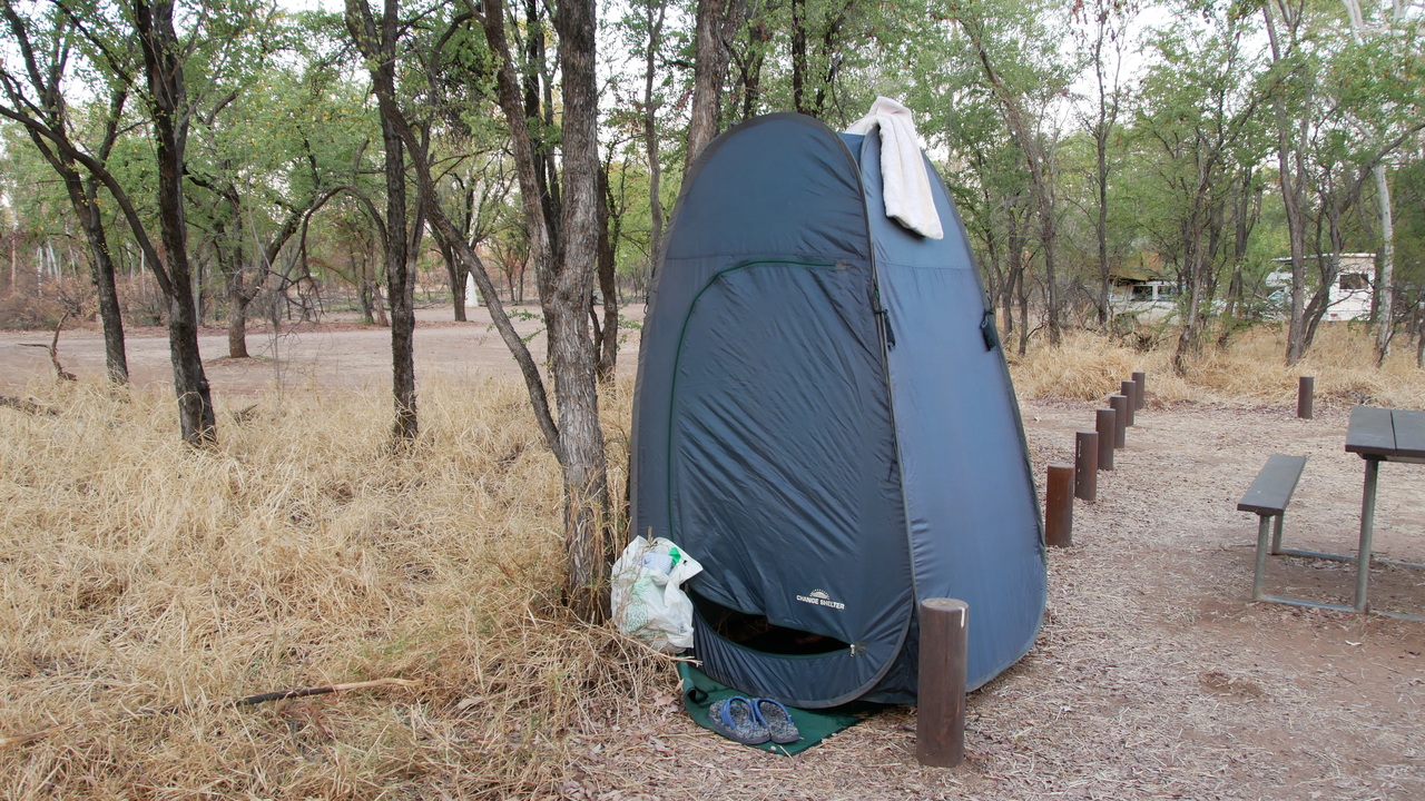 Auch beim Bushcamping sammeln wir neue Erfahrungen. Auf dem Warandi Campingplatz gibt es zwar unbehandeltes Wasser, aber keine Duschen und so kommt erstmals unsere Campingdusche und das Privacy Tent zum Einsatz. Wir sind begeistert. Schon um 4:30 Uhr klingelt der Wecker, da wir die frühen Morgenstunden zum Wandern nutzen und so der Gluthitze zumindest ansatzweise entrinnen wollen. Am Visitor Center zieht eine riesige Windhose nur wenige Meter entfernt von uns vorbei, die sich in Luft auflöst, sobald sie die ersten Büsche berührt.