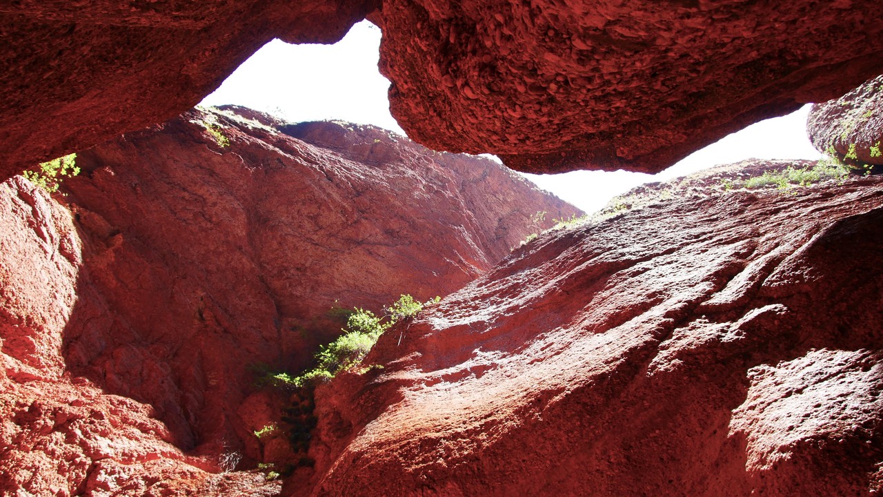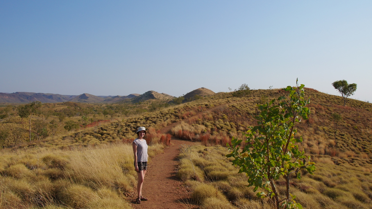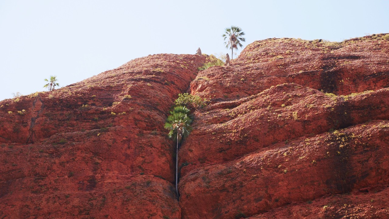 Je tiefer wir in die Mini Palms Gorge wandern, desto grüner wird es – immer mehr Palmen und Eukalyptusbäume säumen die Ränder der Schlucht. Am Ende des Wegs gibt ein Aussichtspunkt den Blick auf einen Höhleneingang frei. Hier lernen wir ein deutsch-spanisches Paar kennen, die gerade – trotz ausdrücklichem Verbot – aus der Höhle geklettert kommen und uns begeistert ihre Fotos von dort zeigen, nachdem sie erleichtert festgestellt haben, dass wir auch Backpacker sind. Die beiden haben sich auf der Reise kennen gelernt, sind deshalb witzigerweise mit zwei Fahrzeugen unterwegs und wollen dauerhaft nach Australien auswandern. Da wir gegen Ende der Saison unterwegs sind und wenig los ist im Nationalpark, treffen wir immer wieder dieselben Backpacker in den verschiedenen Schluchten. So den zähen Israeli, der keine Wanderung auslässt und selbst mittags stundenlang durch die sengende Hitze marschiert, den Deutschen mit australischem Akzent, der die Himmelsfärbung nach dem Sonnenuntergang viel spannender findet als den Sonnenuntergang selbst und ein quirliges französisches Paar, die sich nicht ohne ihre Fliegennetze aus dem Zelt trauen.