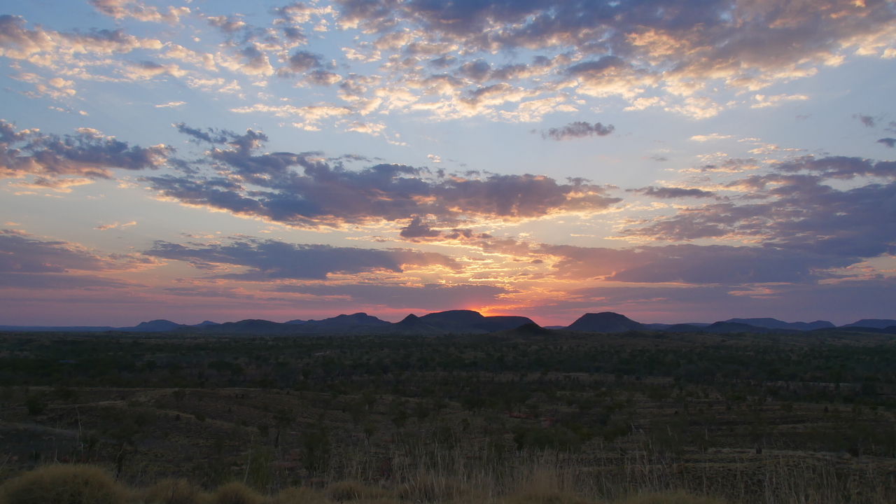 Zum krönenden Abschluss beobachten wir vom Kunkalanayi Lookout aus einen spektakulären Sonnenuntergang, während hinter uns die Bungle Bungles in dunkelrotes Licht getaucht werden.