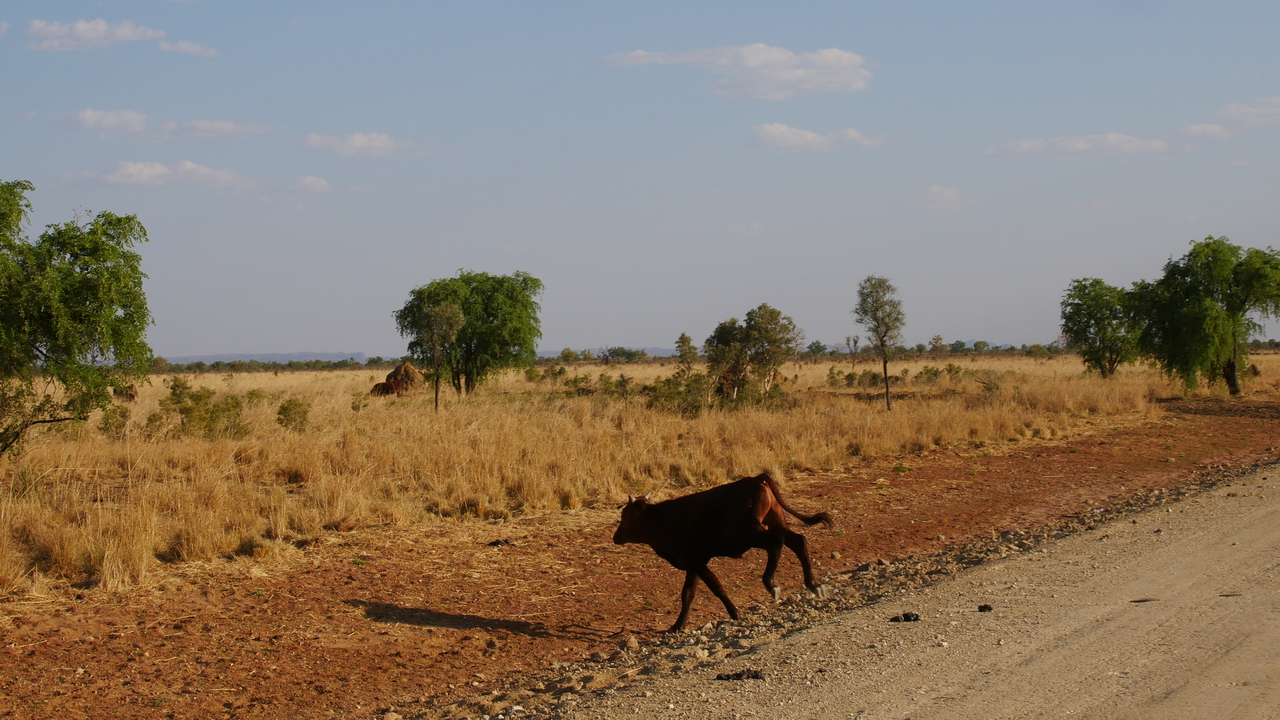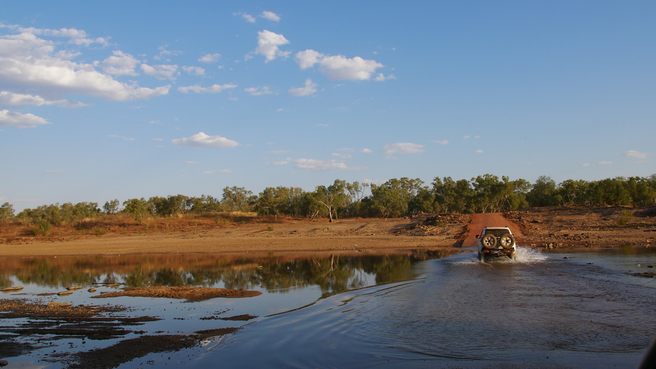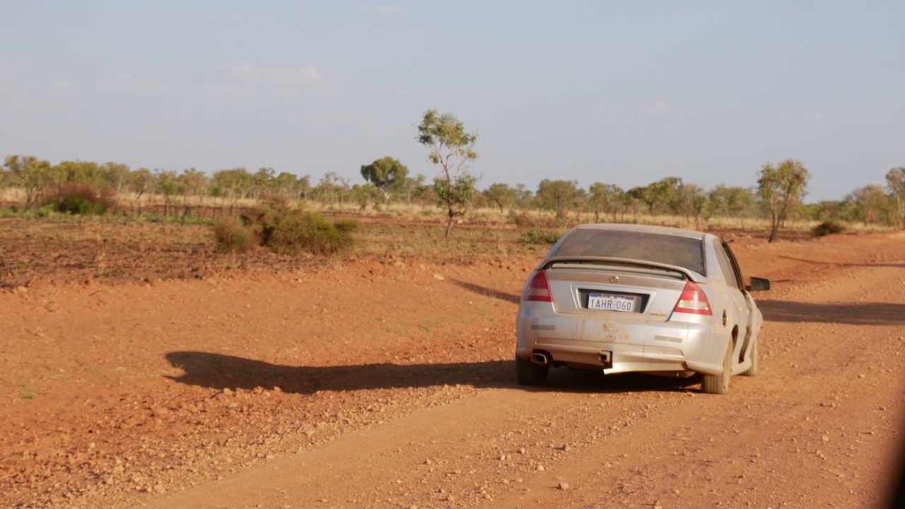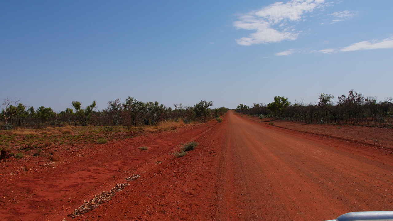 90 Kilometer hinter Fitzroy Crossing verlassen wir den Highway. Von hier aus sind es weitere 120 Schotterpiste. Immer wieder glotzen uns Rinder überrascht an, um dann kurz vor unserem Paji über die Straße zu galoppieren. Ab und zu passieren wir Schrottlauben, die neben der Schotterpiste im Busch vor sich hinrosten. Wie wir später erfahren, sind die Fahrzeuge nicht immer kaputt, sondern werden oft abgestellt, weil der Sprit leer ist. Woraufhin das Auto nach und nach ausgeschlachtet wird, bis nur noch die Karosserie übrig ist.