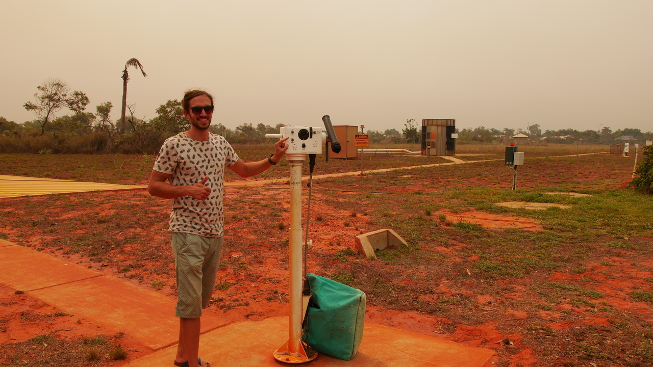 Auf Max‘ Knopfdruck hin startet der Wetterballon seine Reise Richtung Sonne. „Er hat jetzt einen Durchmesser von 2,5 Metern. Wenn er in der Stratosphäre eine Höhe von 40 Kilometern erreicht, hat er 14 Meter Durchmesser. Dann würde unser Radarturm hineinpassen.“ Vor Energie sprühend erklärt uns Wetterfrosch David, wie sie im Bureau of Meteorology Wetterdaten erfassen und auswerten, wie Radar funktioniert und vieles mehr. Wir erfahren auch, warum die Lichtverhältnisse heute so seltsam sind: 140 Kilometer entfernt brennt ein Waldstück und räuchert großflächig das Land ein. Sogar der Highway ist wegen der schlechten Sicht gesperrt. David meldet regelmäßig die Sichtverhältnisse an den Flughafen, damit die Flugzeuge, die in Broome landen wollen, mehr Kerosin mitführen. Wir hätten nicht erwartet, dass man hier einfach so in den Wetterdienst spazieren, sich alles erklären lassen und sogar Wetterballons starten kann – und sind begeistert.