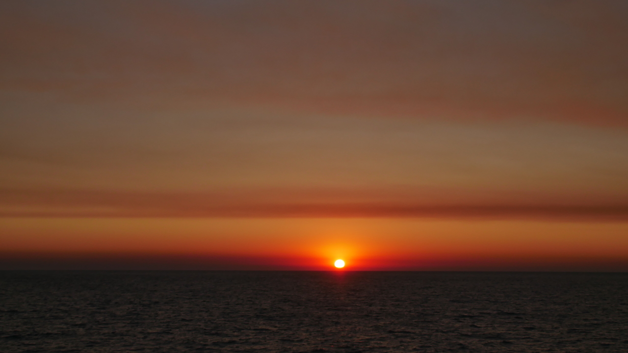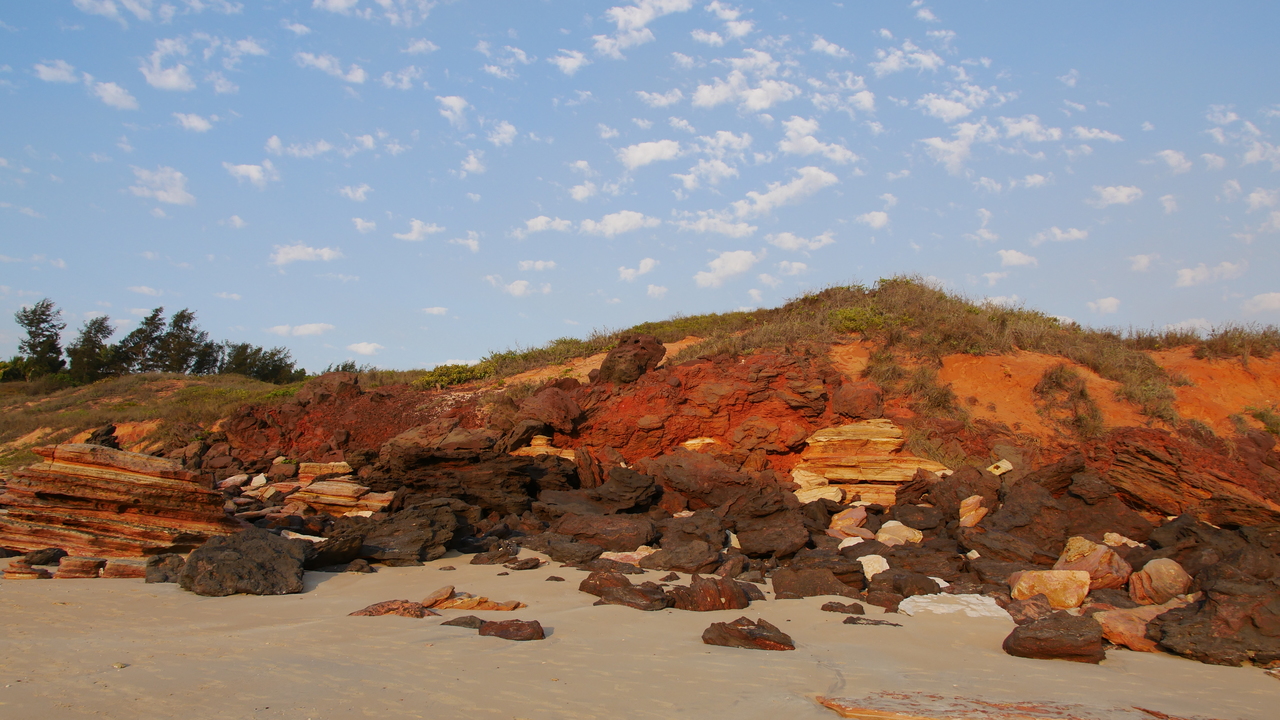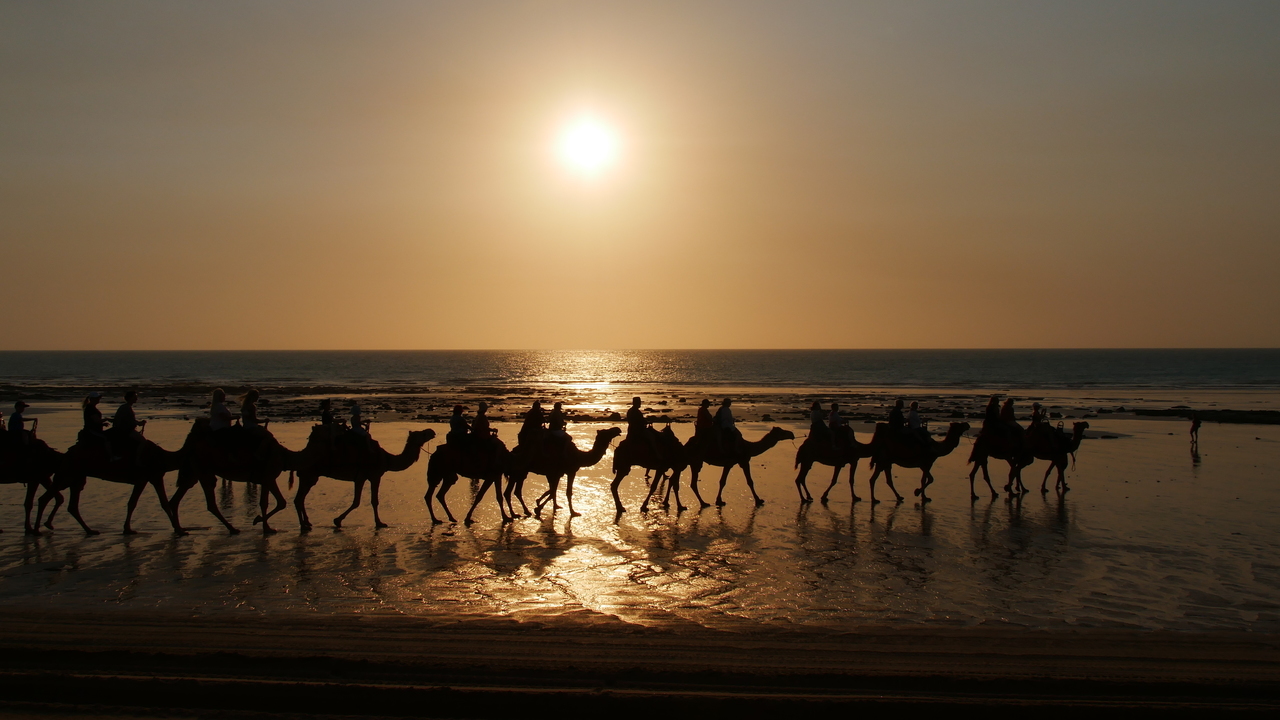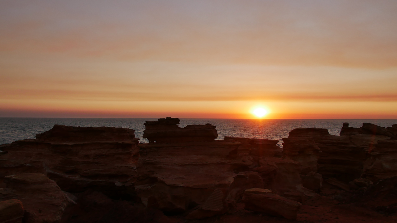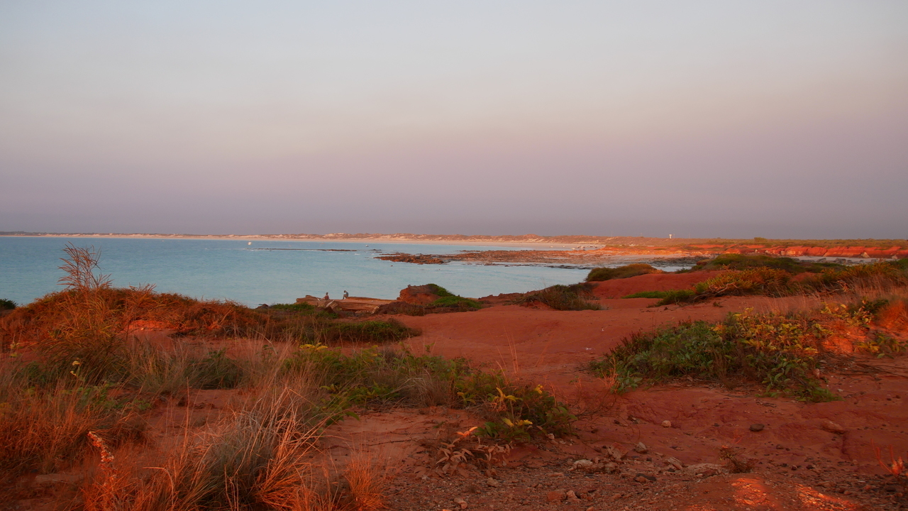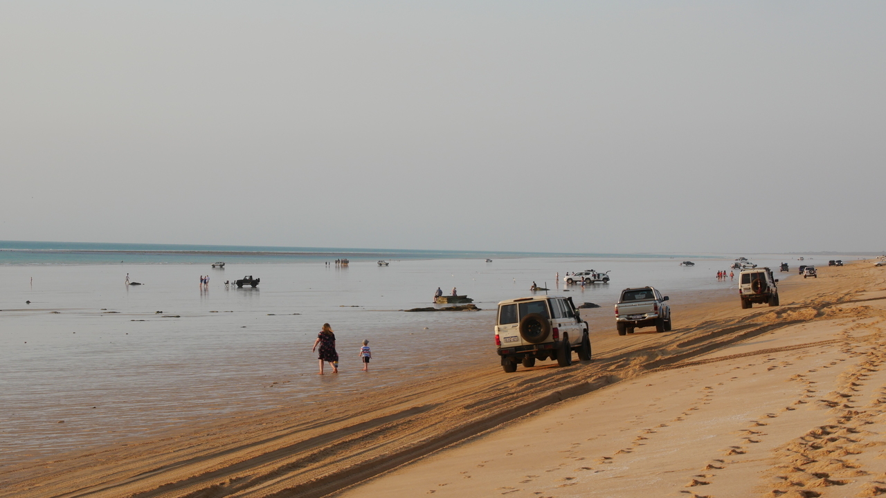 Einen besonders farbintensiven Sonnenuntergang bescheren uns die Rauchpartikel am Gantheome Point: vor uns Rot-Orange-Töne und hinter uns eine dunkelgraue Rauchwand, die wie eine bedrohliche Regenfront aussieht. Bei Ebbe kann man hier die Fußabdrücke von Dinosauriern sehen. Bekannt ist Broome für den Sonnenuntergang am Cable Beach, wo sich Wüste und Meer treffen. Hier trotten Karawanen von Kamelen durch den Sand und viele Aussies machen es sich in ihren Geländewagen gemütlich. Autokino am Strand sozusagen.