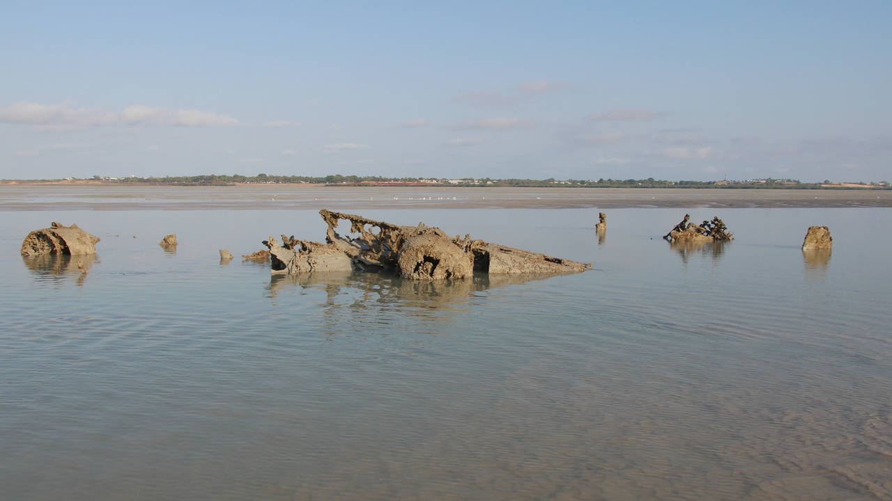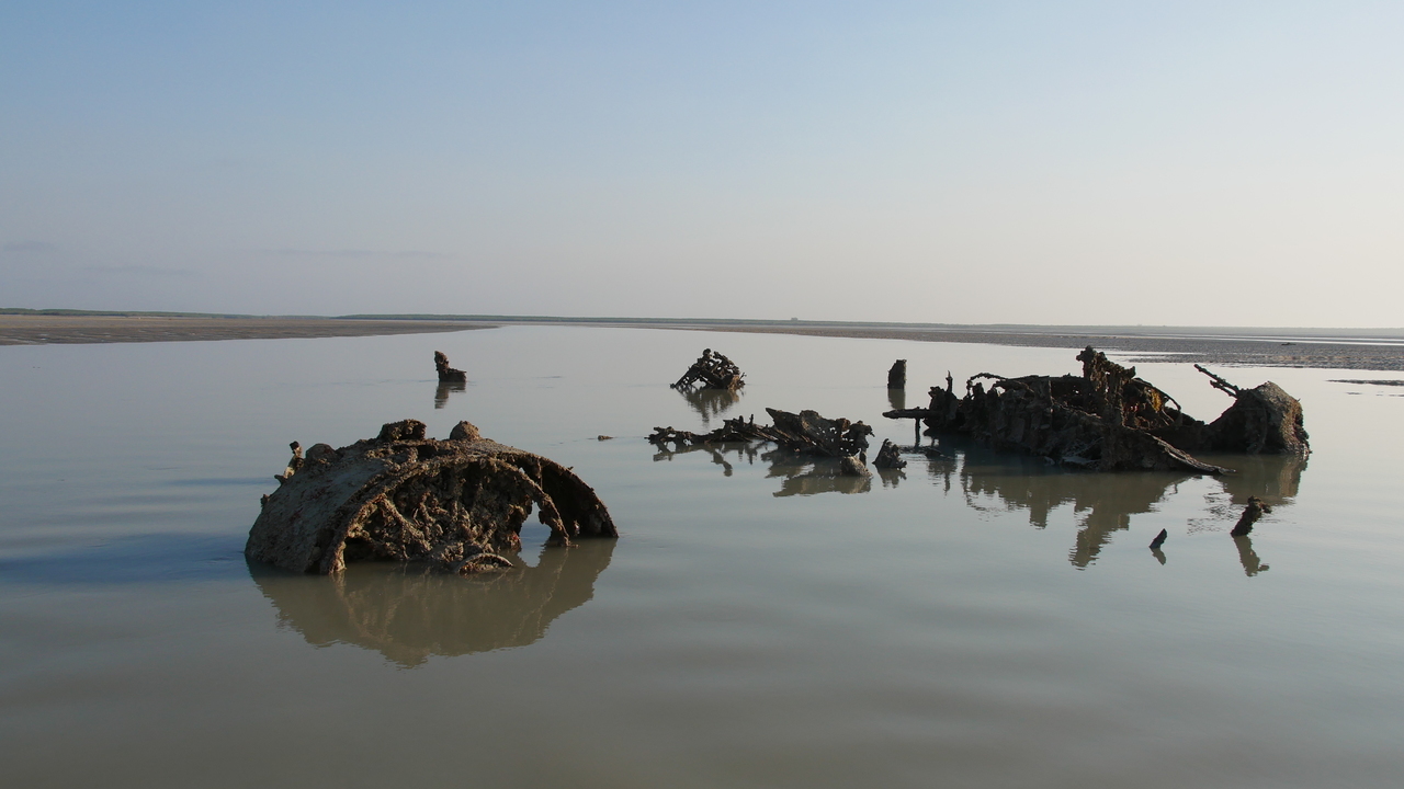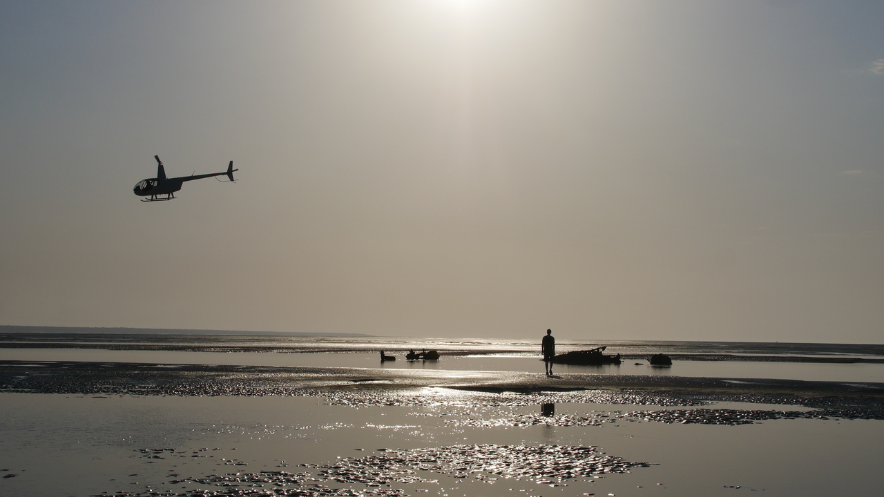 Um 05:30 Uhr wandern wir durchs Watt, als die Sonne über dem Meer aufgeht. Seesterne, Krebse, Pelikane und eine Meeresschildkröte leisten uns Gesellschaft. An einigen Stellen sinken wir knöcheltief ins Watt ein, an anderen waten wir knietief durch die Wasserströme, die ins Meer zurückfließen. Nach 1,5 Kilometern erreichen wir unser Ziel: mehrere Flugbootwracks aus dem Zweiten Weltkrieg. Obwohl sie tief im Sand versunken und von Muscheln überwuchert sind, sind die Boote und Turbinen noch als solche erkennbar. Die Flugboote tauchen nur bei extrem niedriger Ebbe aus dem Meer auf und dass dies tagsüber passiert, kommt nur alle paar Wochen vor. Wir verdanken das besondere Erlebnis unserer Wattwanderung also dem Mond.