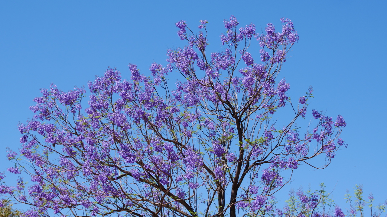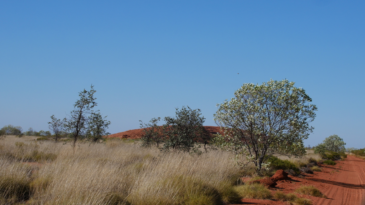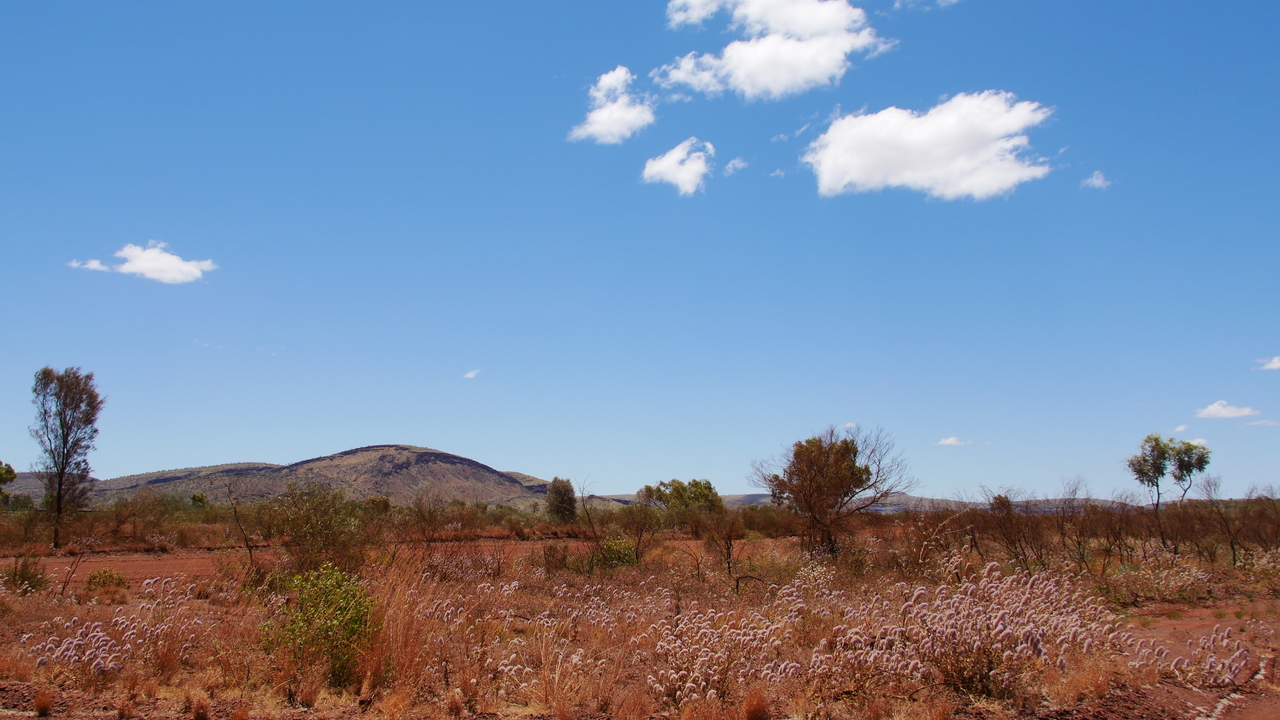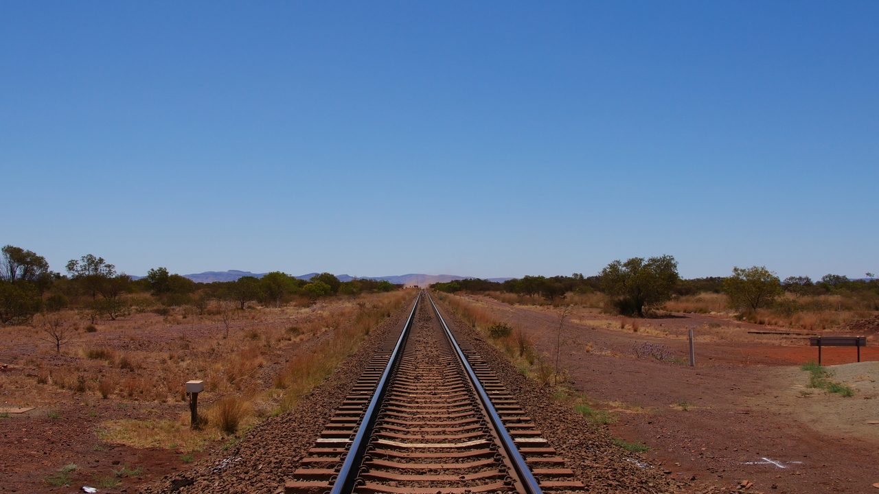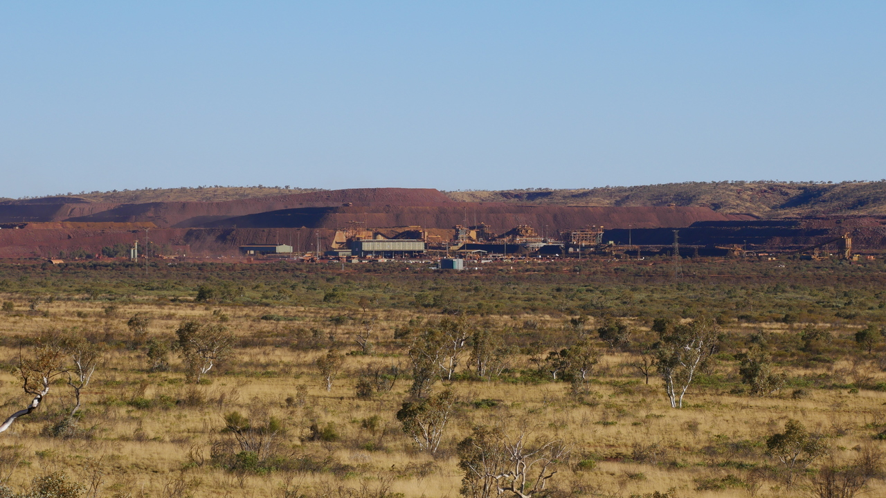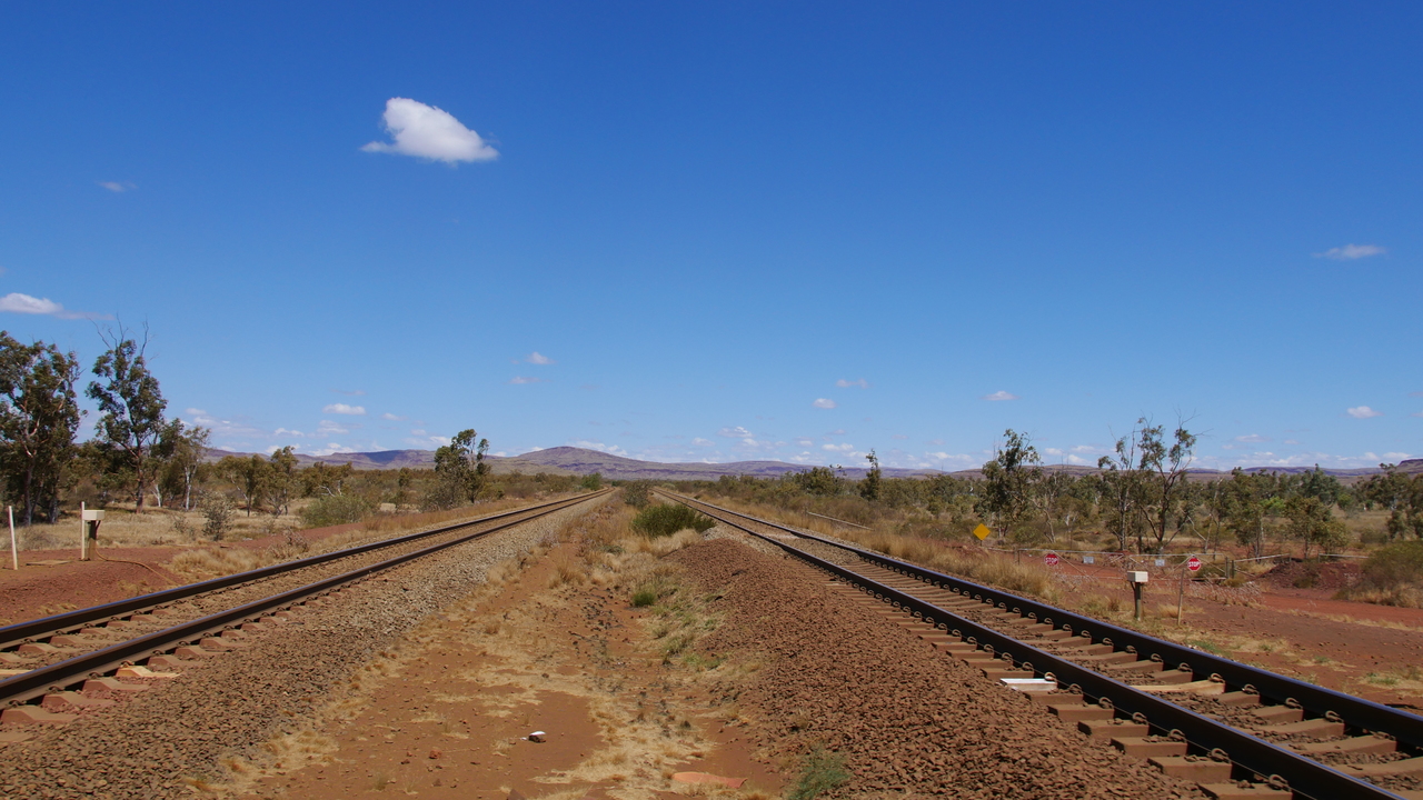 In der Bergbaustadt Tom Price begrüßen uns prächtig blühende Jacarandas und ein netter Park, dessen Spielplatz sich hervorragend zum morgendlichen Yoga eignet. Um uns 470 Kilometer Umweg über öffentliche Straßen zu ersparen, nehmen wir von hier aus die private Hamersley Iron Road, die dem Bergbauunternehmen Rio Tinto gehört. Die entsprechende Genehmigung haben wir im Visitor Center in Tom Price bekommen, indem wir uns ein 20-minütiges Video angesehen und eine Spende für die Royal Flying Doctors entrichtet haben. Das Video ist eine Art theoretisches Fahrsicherheitstraining und macht auf die Gefahren der Schotterstraße aufmerksam, die nur wenige Meter neben den Gleisen verläuft. Zum Beispiel, wie man sich bei Waldbränden verhalten soll und dass man Road Trains aufgrund der riesigen Staubwolken auf keinen Fall überholen sollte (auf die Idee wären wie vermutlich sowieso nicht gekommen). Die Straßenverhältnisse sind letztlich besser als erwartet, als wir neben den endlos langen Güterzügen an rosa Wildblumen und blauen Bergketten entlang fahren. Wir sehen auf den 180 Kilomtern nur ein Traveller-Fahrzeug und ein paar Pick-ups der Mitarbeiter von Rio Tinto.