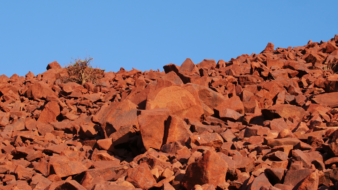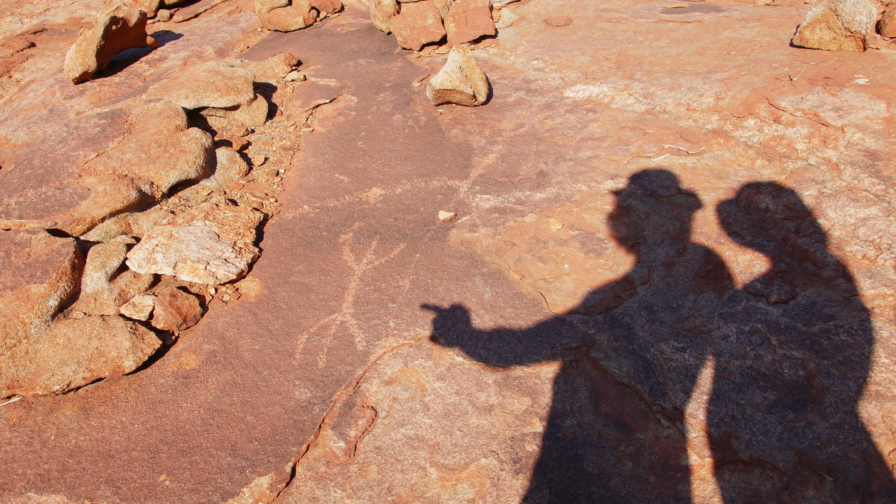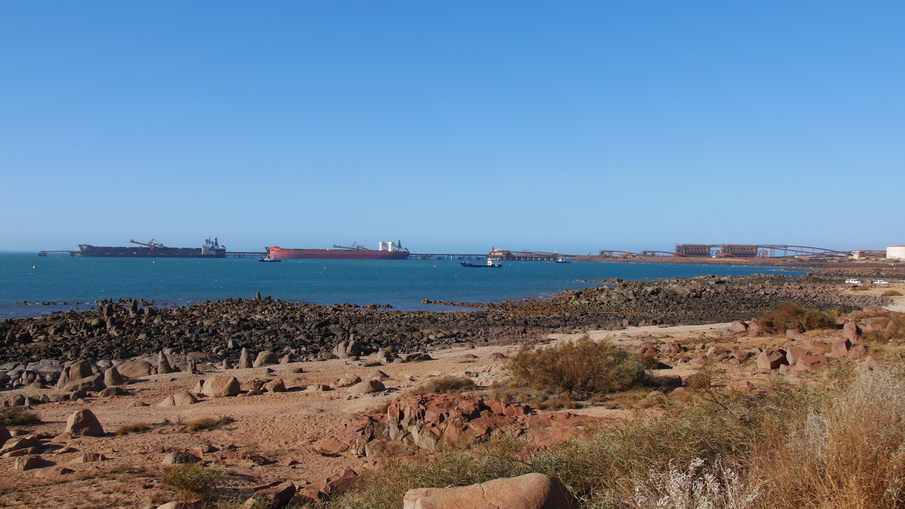 In Dampier beobachten wir, wie das Eisenerz in riesige Frachtschiffe geladen wird. Auf der Burrup-Halbinsel erkunden wir im Murujuga Nationalpark die weltweit dichteste Ansammlung von Felszeichnungen der Aborigines. Die hohen Felsenhaufen sind wie ein Suchbild, in dem wir nach und nach die Gravuren entdecken. Das Flair ist allerdings nicht mit dem Kakadu Nationalpark vergleichbar, zumal sich auf der Halbinsel jede Menge Schwerindustrie befindet und gar nicht weit entfernt die riesige Flamme eines Gaskraftwerks in den Himmel flackert.