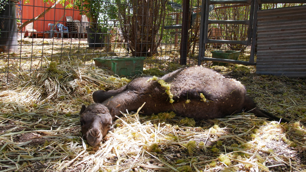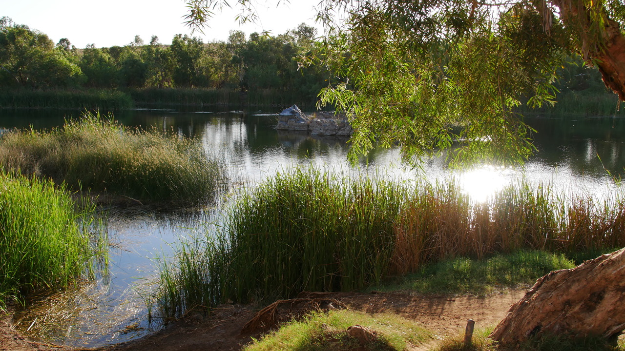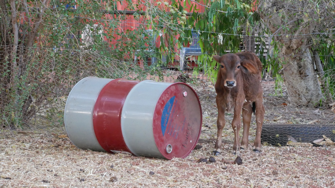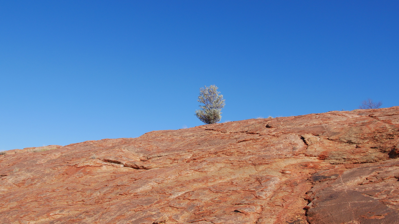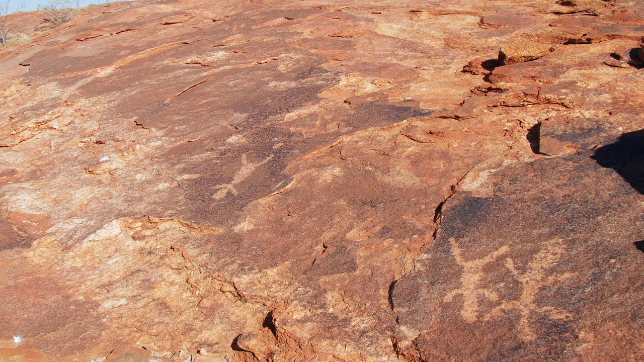 Auf der Indee Station gibt es neben einer Menge Rinder auch Pferde, rosa Papageien, Schlangen und ein Babykamel. Wir kommen gerade rechtzeitig zur Happy Hour an: um 17:30 Uhr treffen sich Eigentümer, Farmarbeiter und Campinggäste zu einer geselligen Runde Bier. Der Biologie-Student Mitch aus Victoria forscht über Zwergbeutelmarder („northern quoll“) und seine Forschungsgruppe hat ein paar Tage zuvor das erste Albino-Quoll überhaupt entdeckt. Eigentlich war mit der Presse eine Sperrfrist bis zum kommenden Dienstag vereinbart worden. Der Farmarbeiter Graham, der fast keine Zähne mehr, dafür aber ein riesiges Thunfisch-Tattoo am Unterschenkel hat, hat die Neuigkeit jedoch vorab schon mal in den sozialen Netzwerken verbreitet. Ein weiterer Graham reist mit seiner Frau seit 15 Jahren im Caravan durch Australien. Zweimal haben sie den Kontinent schon umrundet, meistens reisen sie jedoch mit den Jahreszeiten von Nord nach Süd und verbringen Weihnachten bei ihren Kindern in Perth. Dauerhaft auf Achse lebende Rentner wie sie bezeichnet man in Australien übrigens als „grey nomads“. Am nächsten Morgen inspizieren wir auf dem Farmgelände den Red Rock, der wie eine Miniaturausgabe des Uluru aussieht und auf dem wir Felszeichnungen der Aborigines finden.