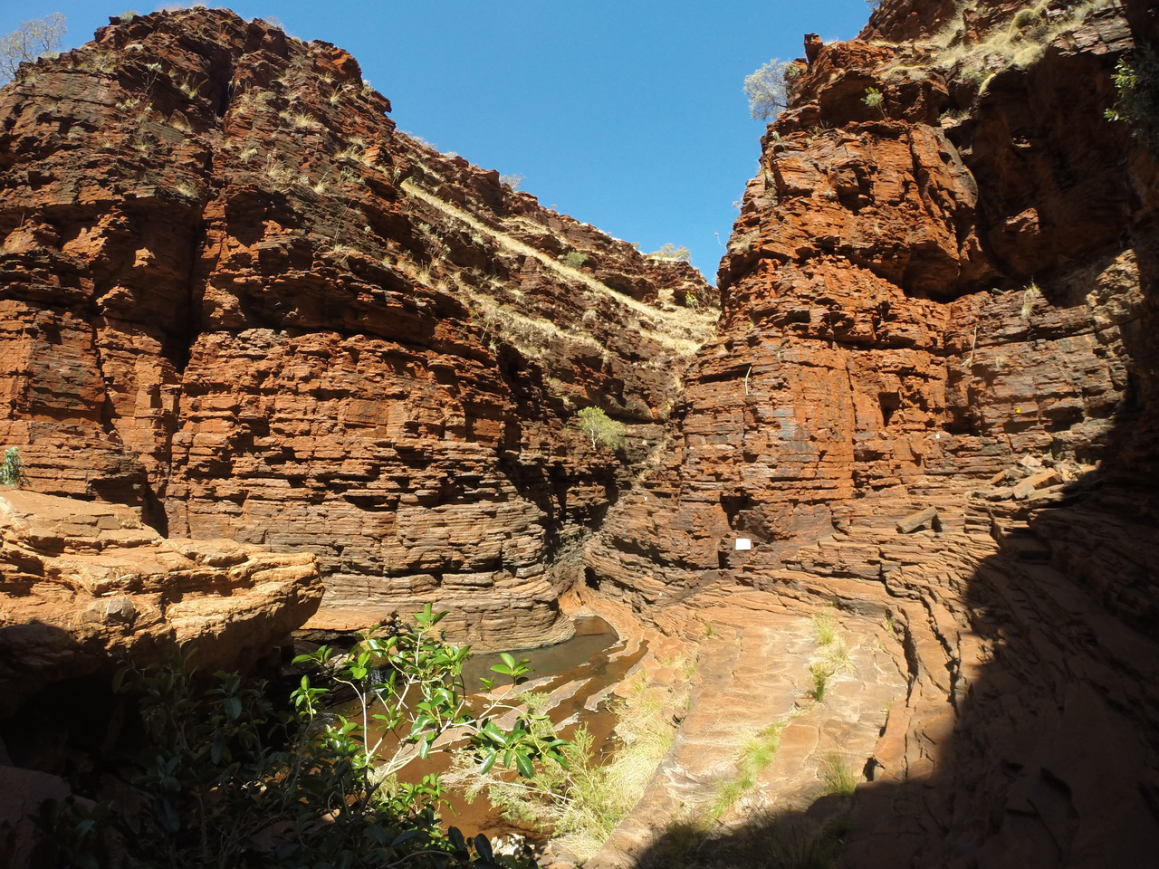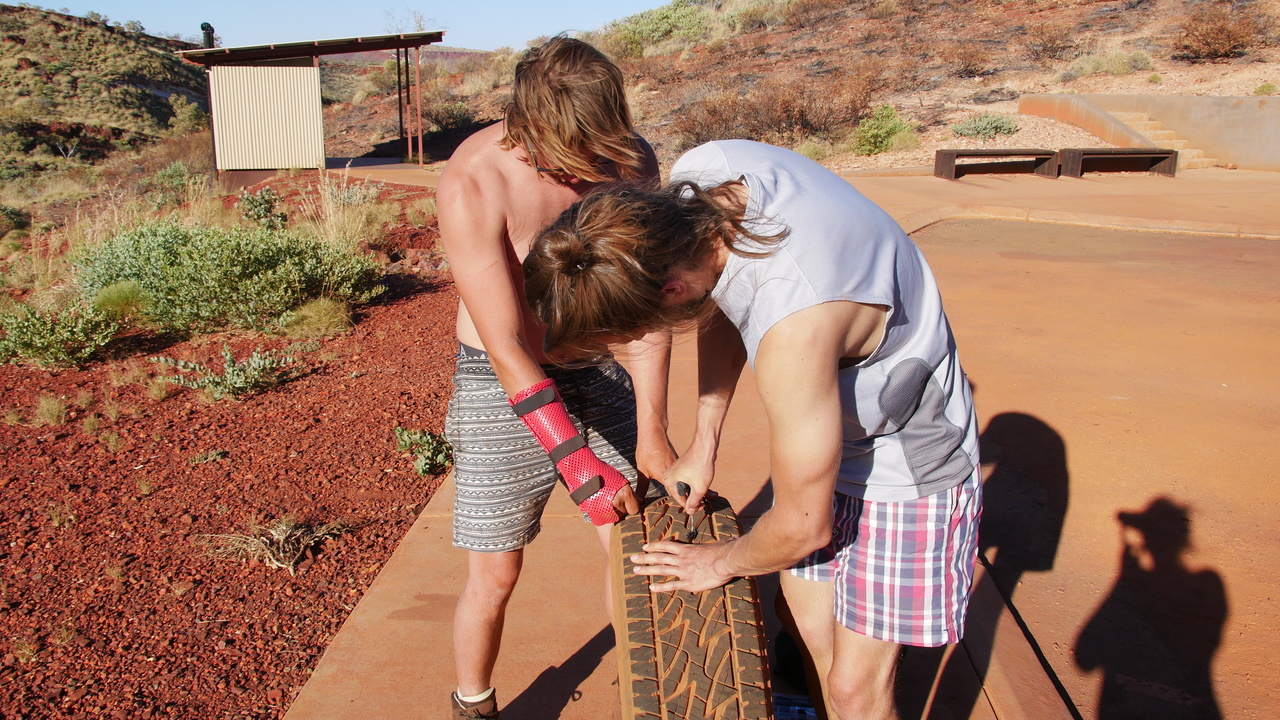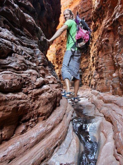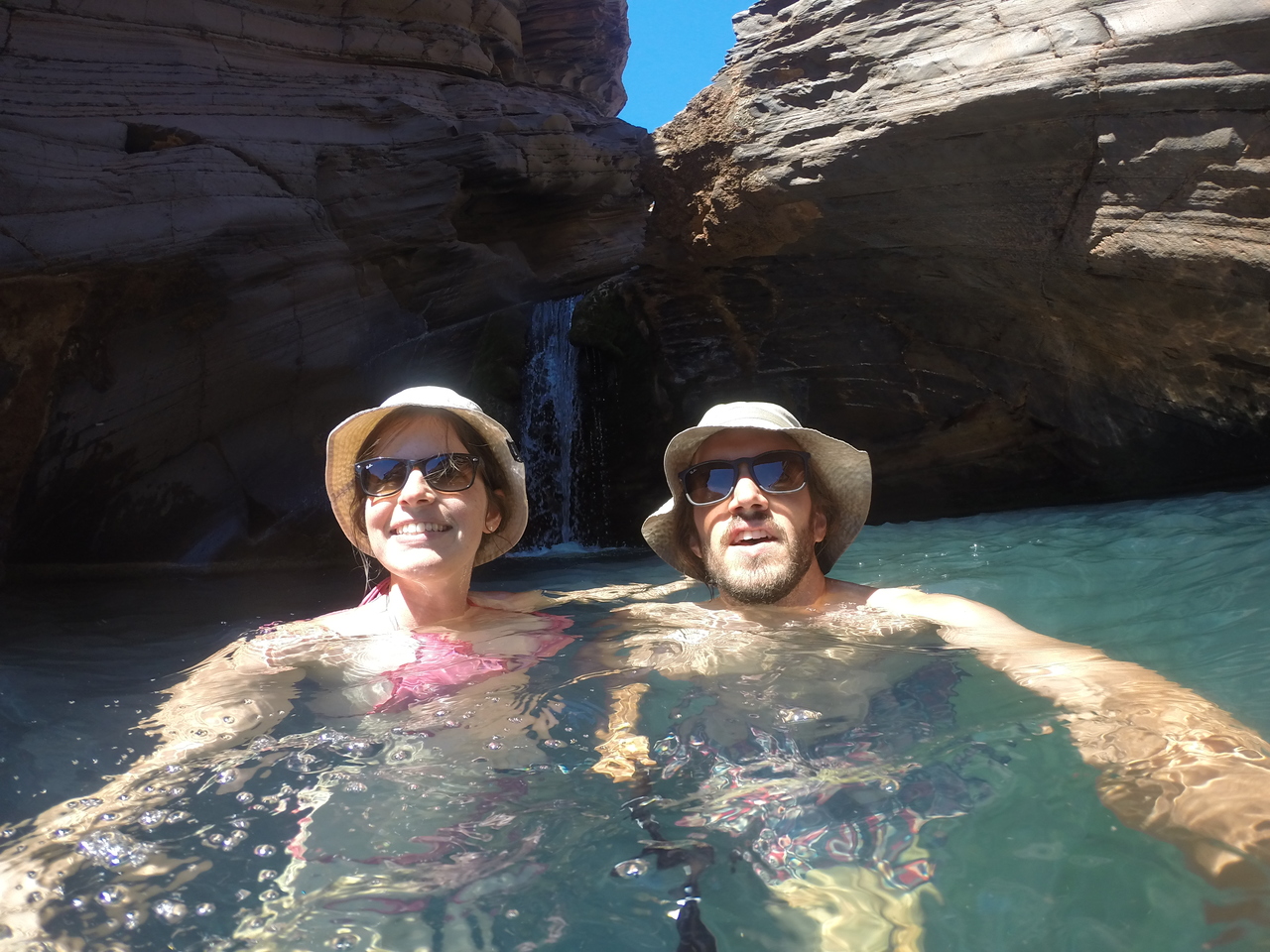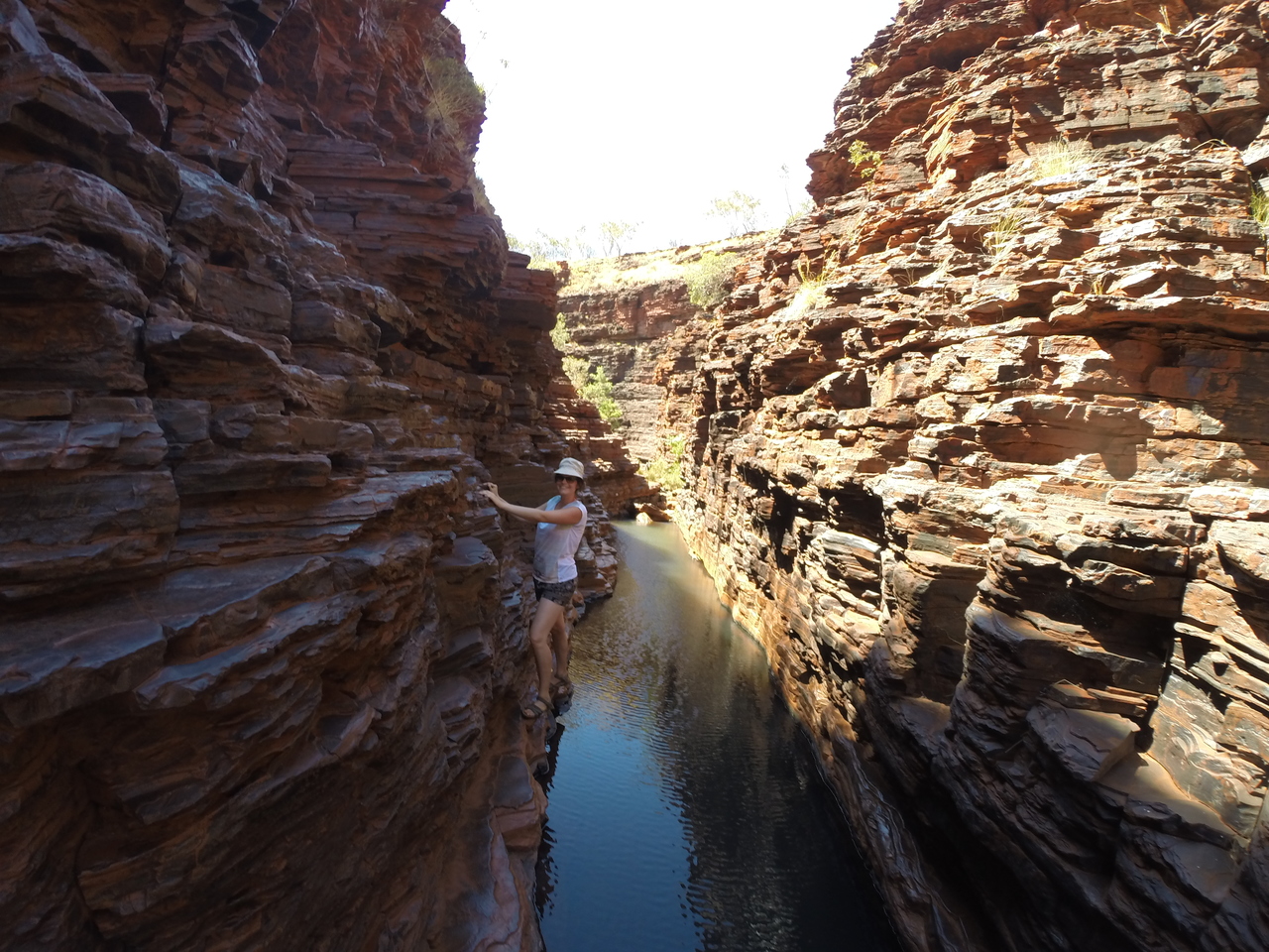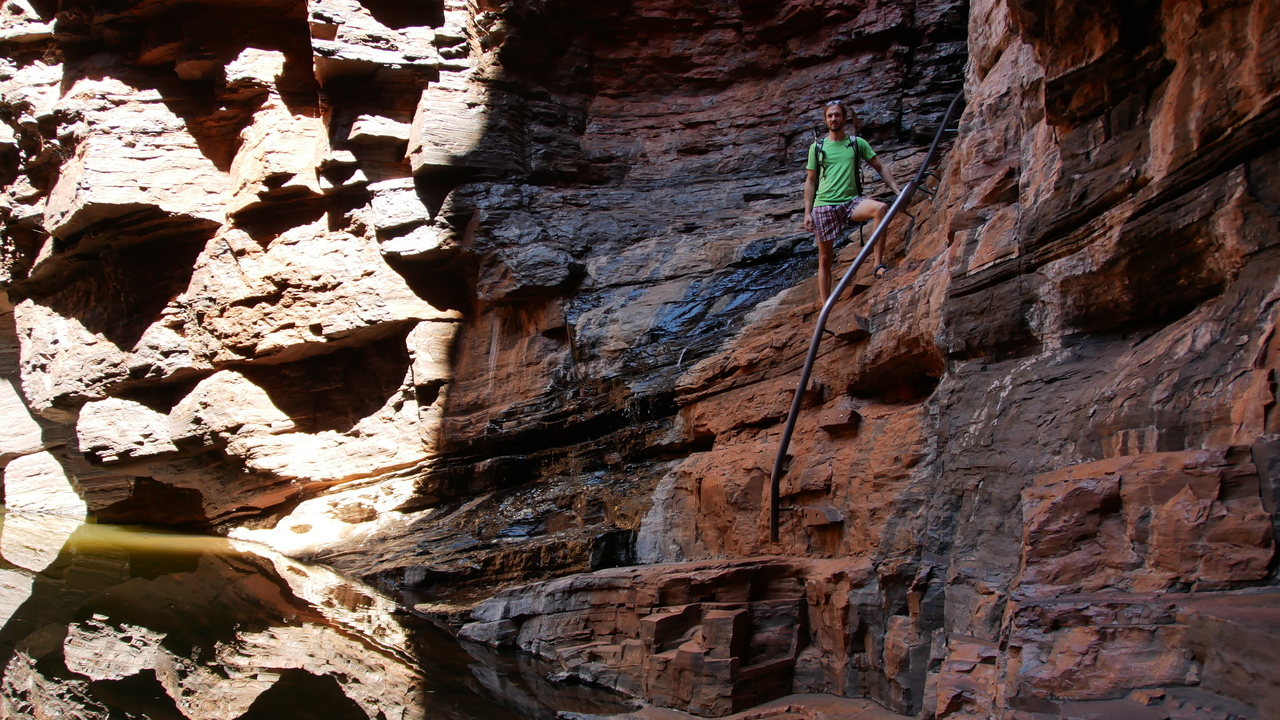 Unsere Kletterpartie entlang der Schluchtwände der Hancock Gorge wird durch den Anblick eines natürlichen Amphitheaters belohnt. Weiter geht es über den glitschigen Spider Walk. Ob er seinen Namen von den vielen Spinnweben hat oder von der Tatsache, dass man sich auf dem engen, rutschigen Pfad hier wie eine Spinne fortbewegt? Über spiegelglatte Steinplatten rutschen wir ins tiefblaue, wiederum eisige Wasser des Kermits Pools. Das Wasser des winzigen Wasserfalls, der in den Pool mündet, ist wesentlich wärmer und angenehm zum Duschen. Hier lernen wir Steven aus Deutschland und McKensie aus Kanada kennen, die einen Pajero auf der Gibb River Road geschrottet haben. Nach dem Achsenbruch haben sie ihn dort einfach an der Straße stehen lassen, da am Ende der Saison alle liegen gebliebenen Autos abgeschleppt werden. Vielleicht von unserem Retter, der uns mit den beiden Platten geholfen hat?! Die beiden vertreiben sich die Zeit mit Klippenspringen und Kiffen, während wir uns auf die von der Sonne aufgewärmten Felsen chillen.