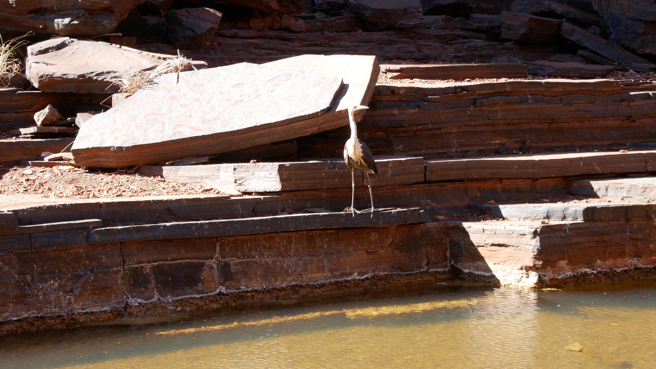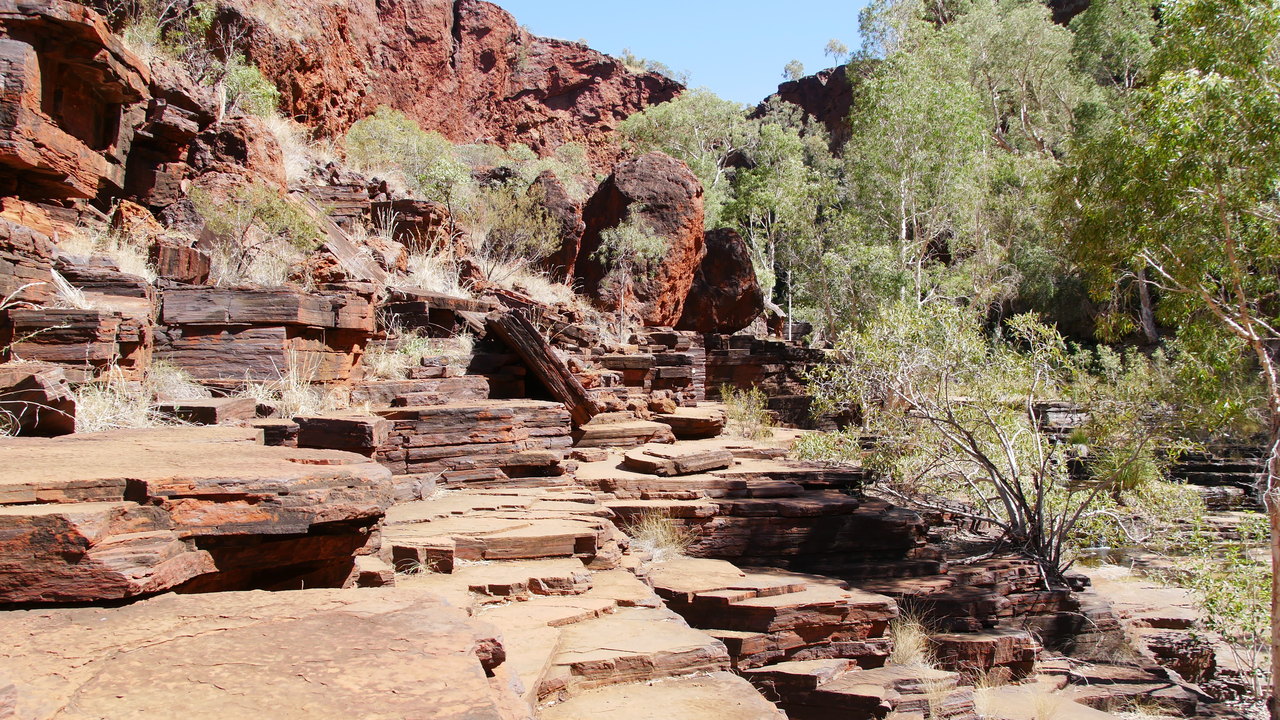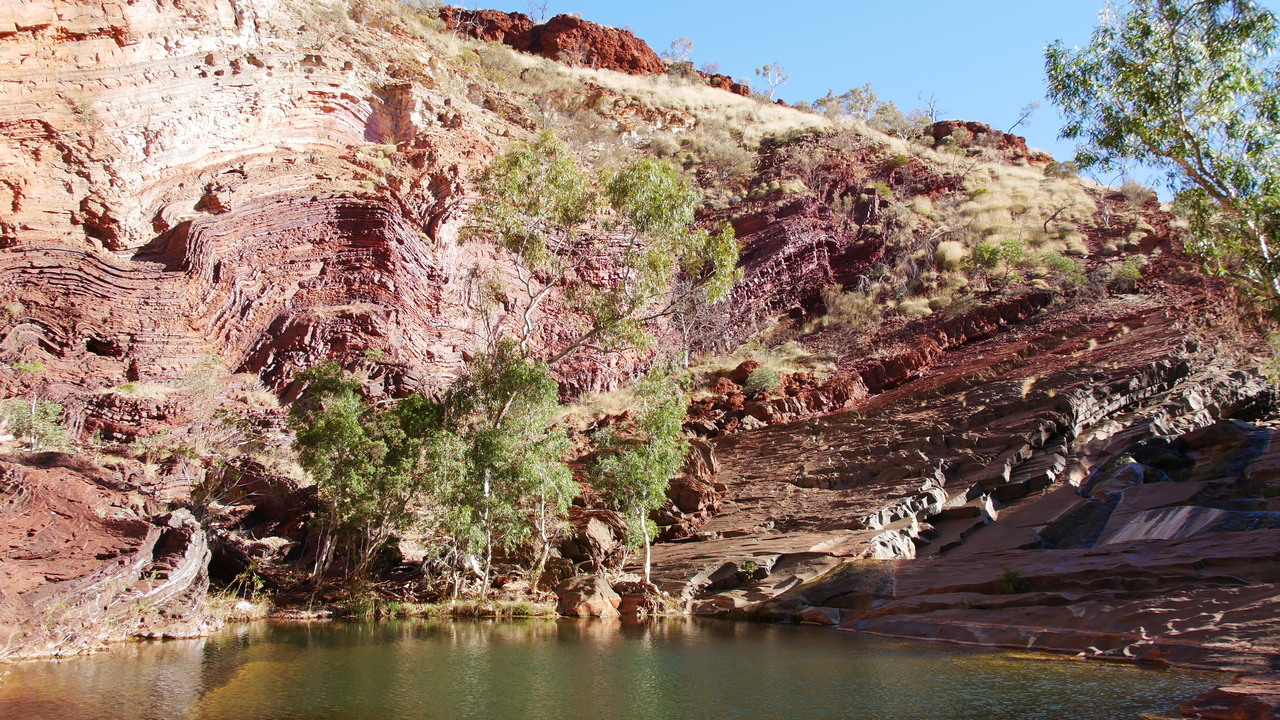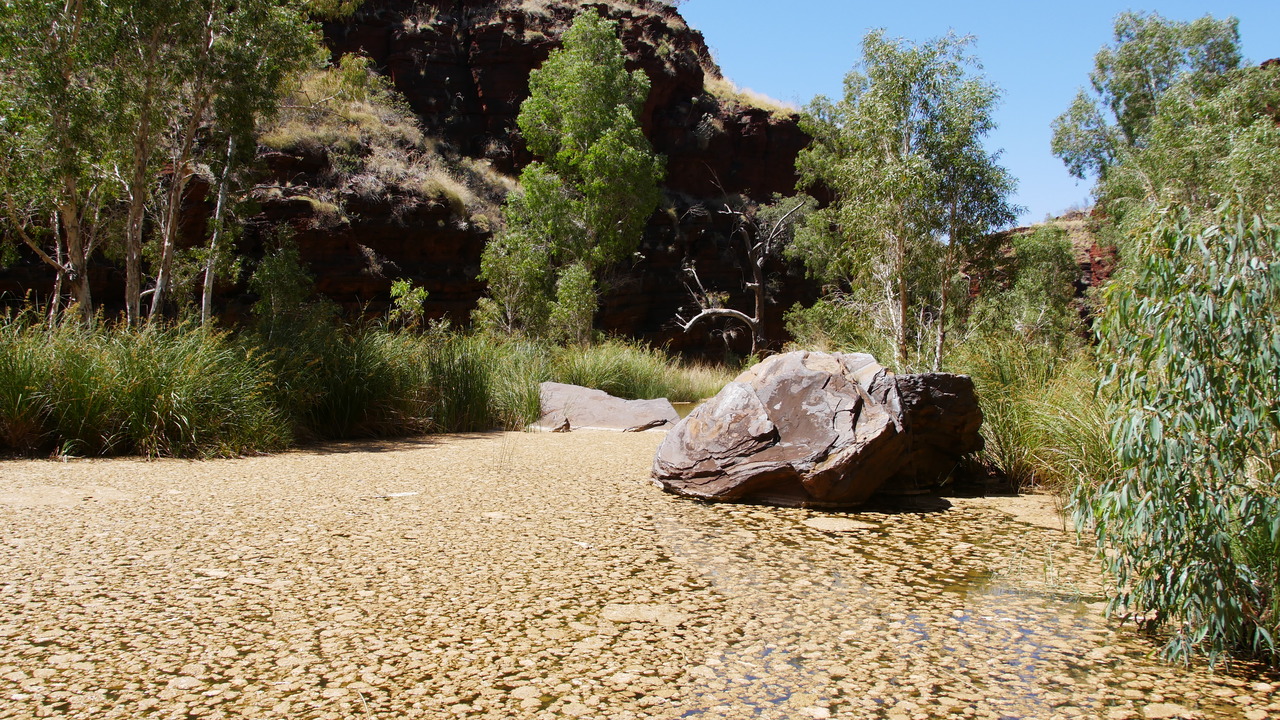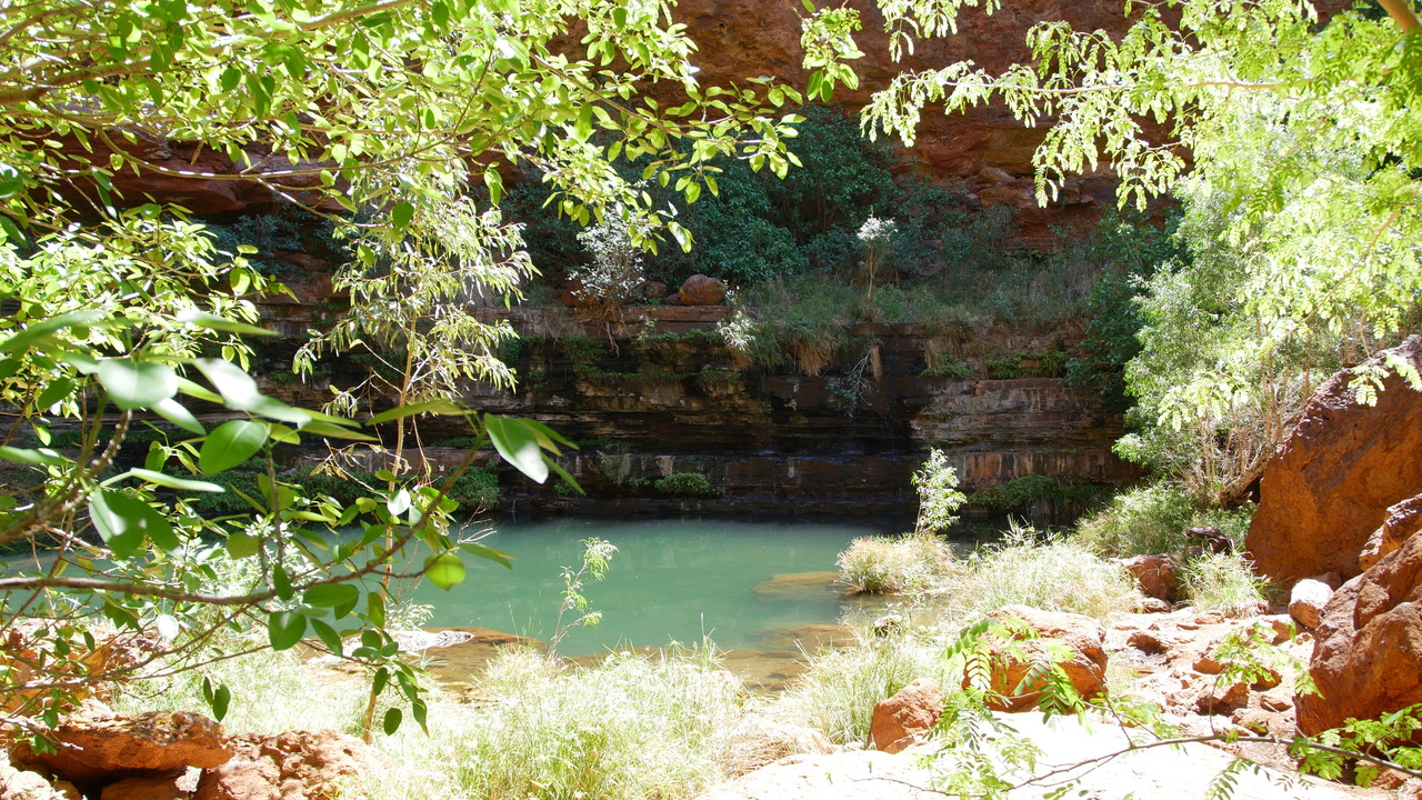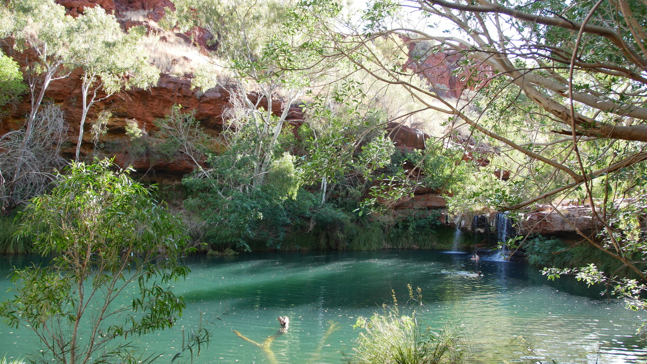 Über Naturstufen steigen wir einen steilen Abhang hinunter, voabei an Wildblumen namens Mulla Mulla in die Dales Gorge, wo wir auf verwunschenen Pfaden entlang eines kaskadenartigen Baches zum idyllischen Circular Pool wandern. Er bietet eine sehr erfrischende Abkühlung. Vorbei an den Fortescue Falls gelangen wir zum Fern Pool, wo kleine Fische und Papageien unterwegs sind.