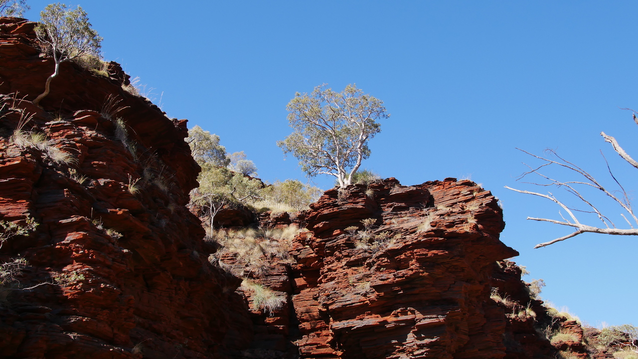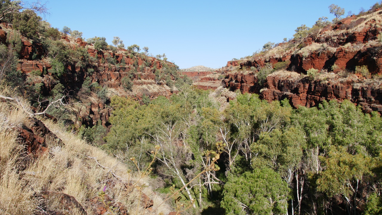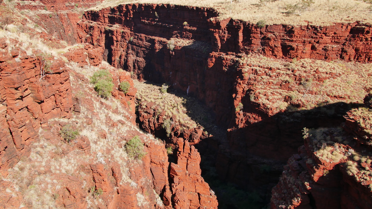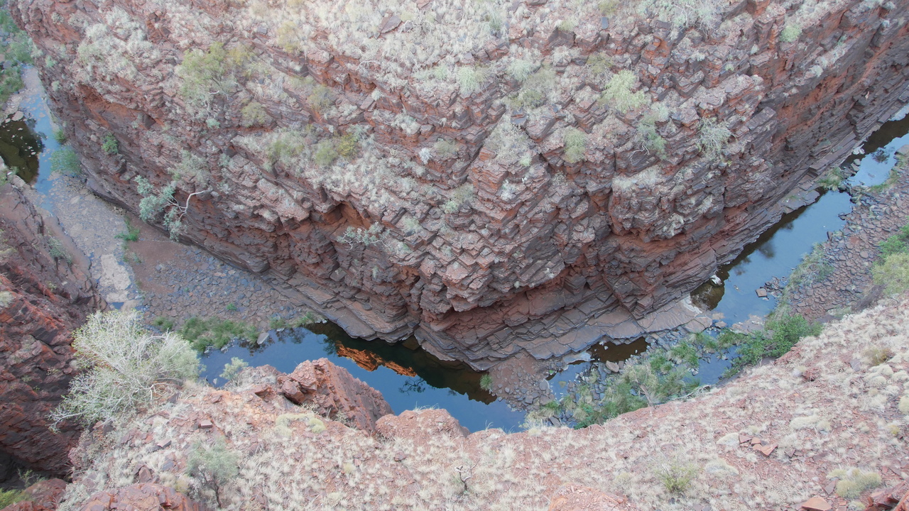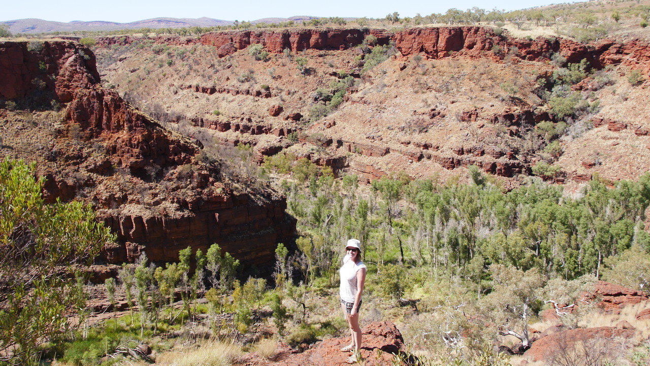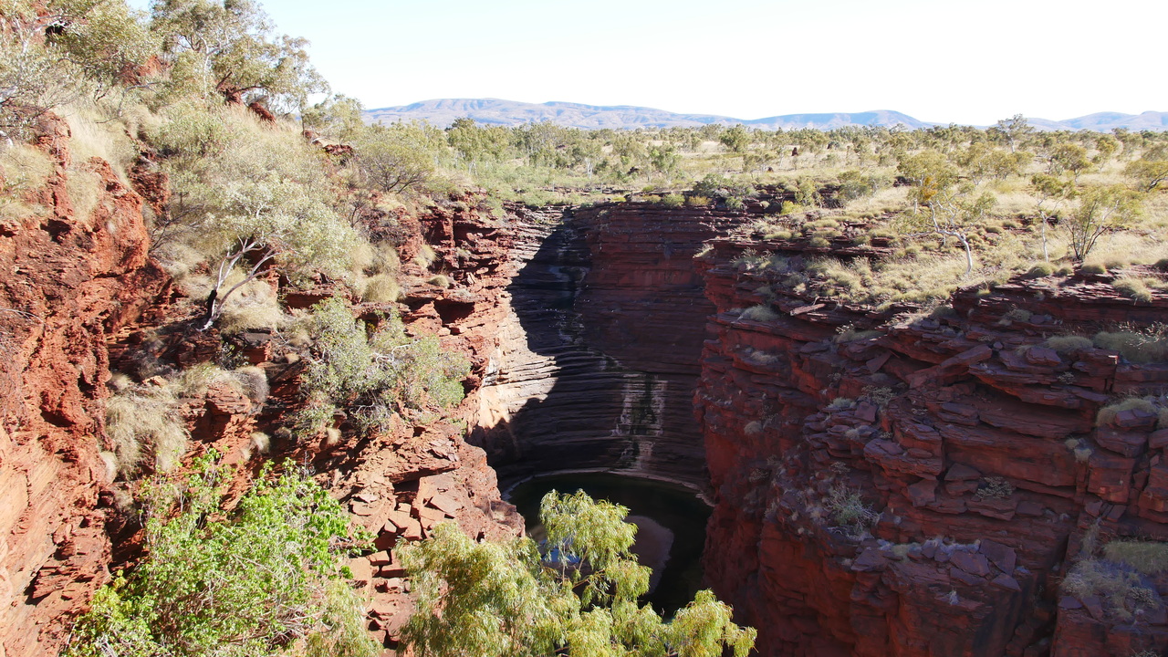 Da die Schluchten des Karijini Nationalparks in der Hamersley Range quasi Einschnitte in der Erdoberfläche sind, sehen wir sie erst, als wir uns ihnen nähern. Plötzlich stehen wir vor einer 100 Meter tiefen Schlucht mit roten Felswänden und steigen hinab ins Abenteuer…