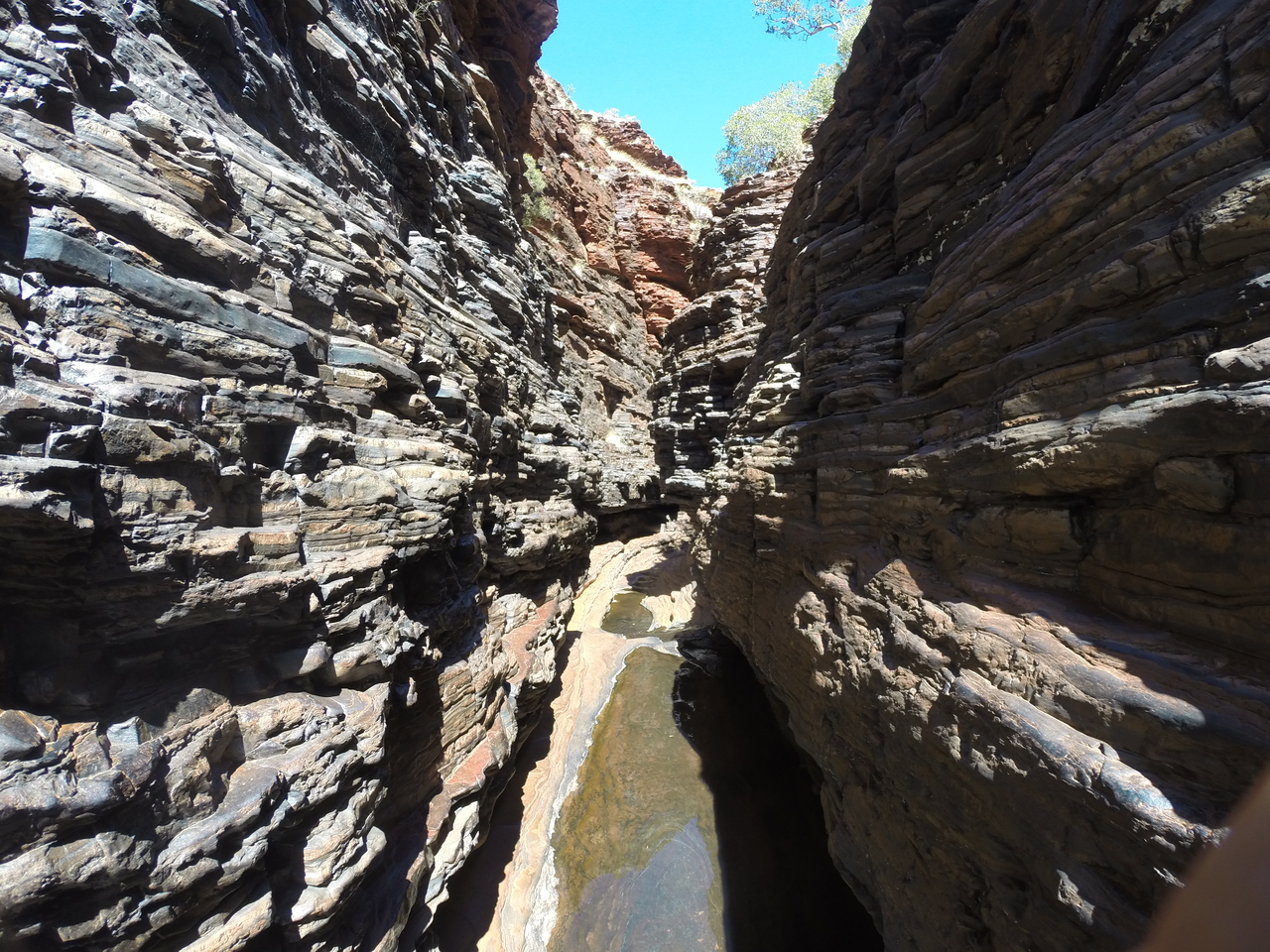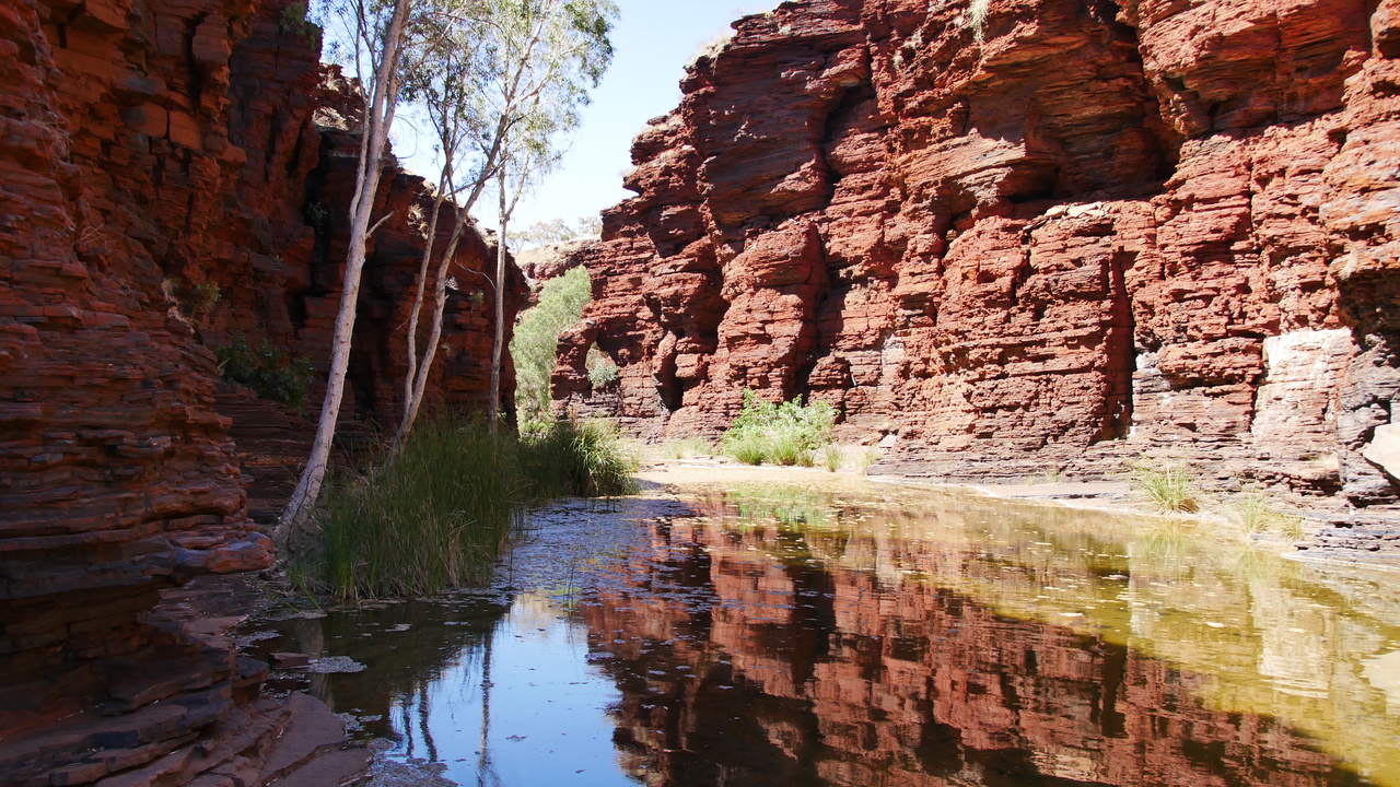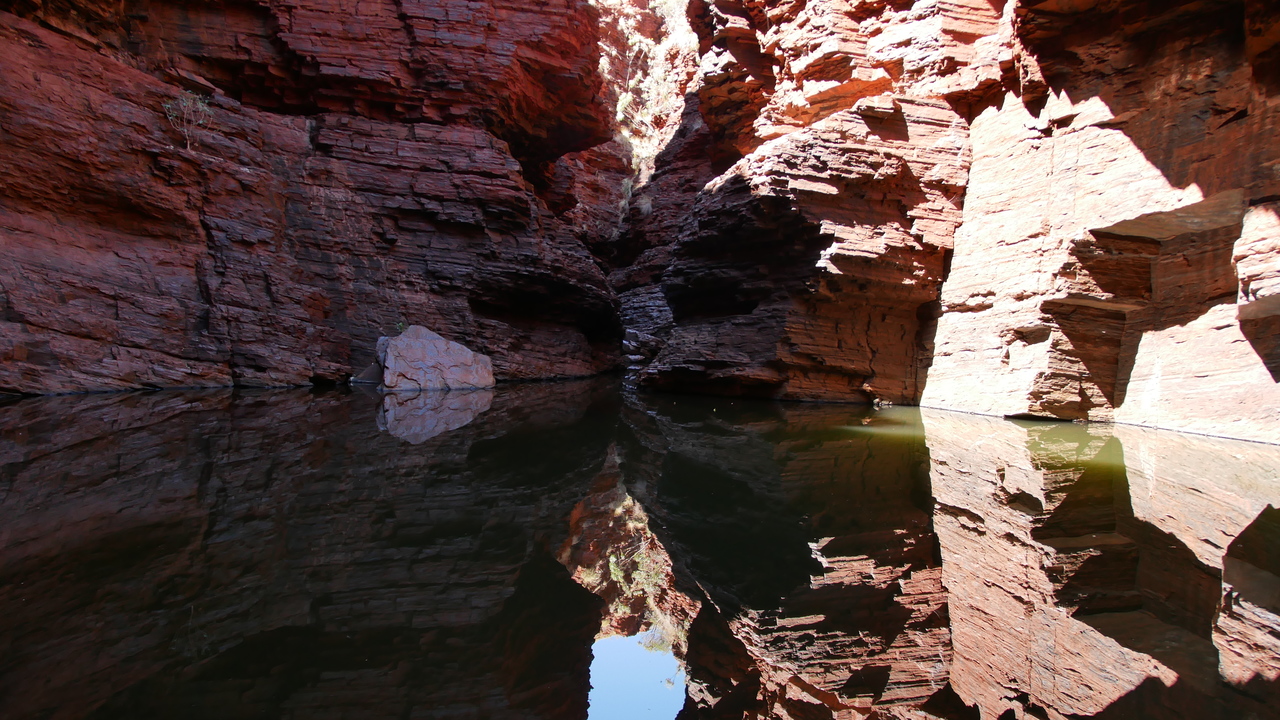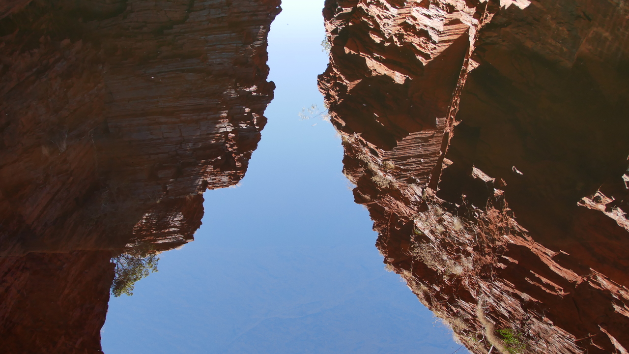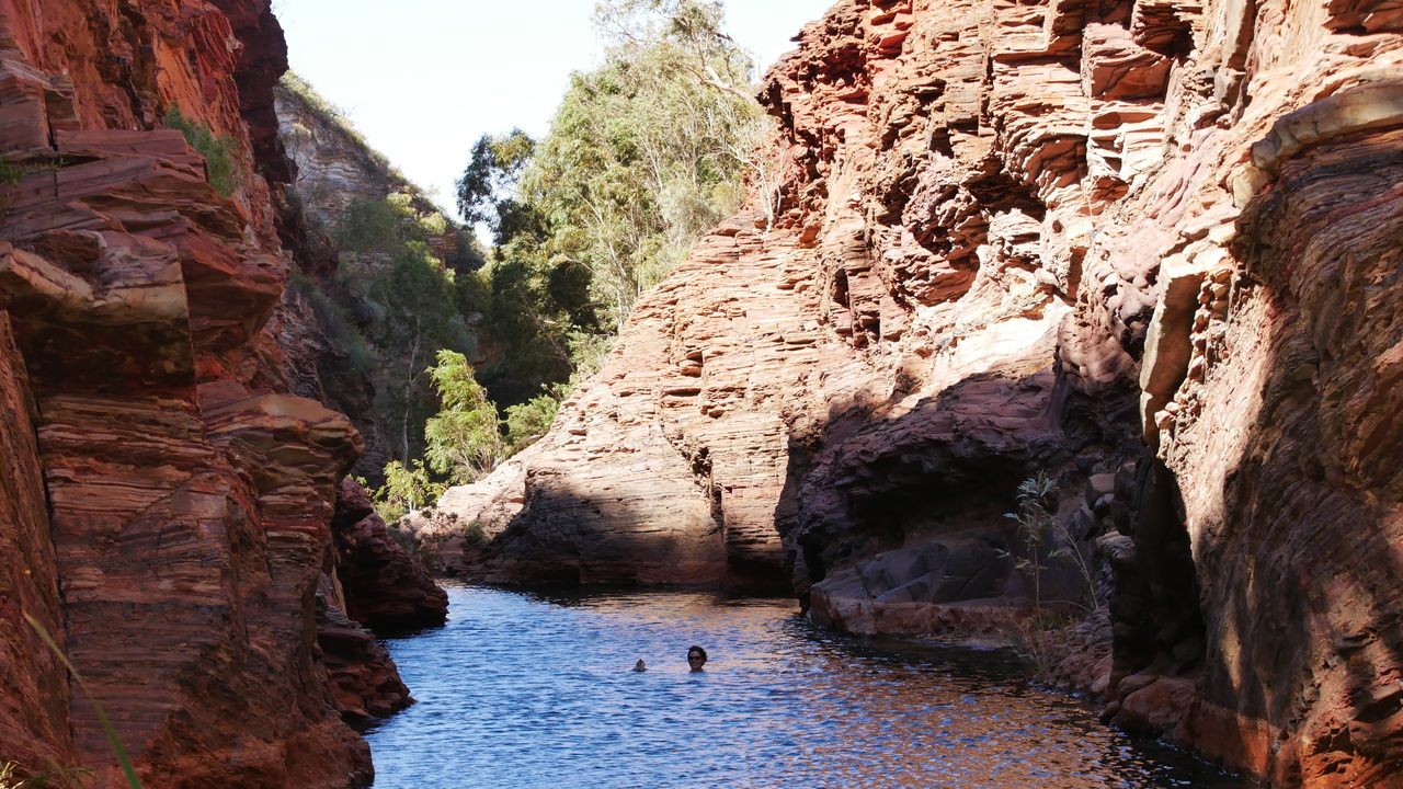 Nachdem wir mehrmals durch kaltes Wasser gewatet sind, verjüngt sich die Weano Gorge auf nur einen Meter Breite. Entlang eines kleines Bachs gelangen wir zum kreisrunden Handrail Pool, in dessen glasklarer Wasseroberfläche sich die Felswände und Bäume auf dem Rand der Schlucht spiegeln. Wir sind ganz alleine und vom Anblick überwältigt. Bis ein älteres Ehepaar und zwei junge Backpackerinnen aus der gegenüberliegenden Schluchtöffnung zurückgeschwommen kommen und uns voller Begeisterung berichten, dass es dort noch weiter gehe und wir noch nicht das Ende des für Besucher zugänglichen Abschnitts erreicht hätten. Also schwimmen wir durch den eiskalten Pool und klettern einen rutschigen Pfad entlang. Dann geht‘s wieder ins – diesmal noch eisigere – Wasser, und wir schwimmen die schmale Schlucht unter rötlichen, sonnendurchfluteten Felsformationen entlang bis zu einem Inselchen. Grandios!