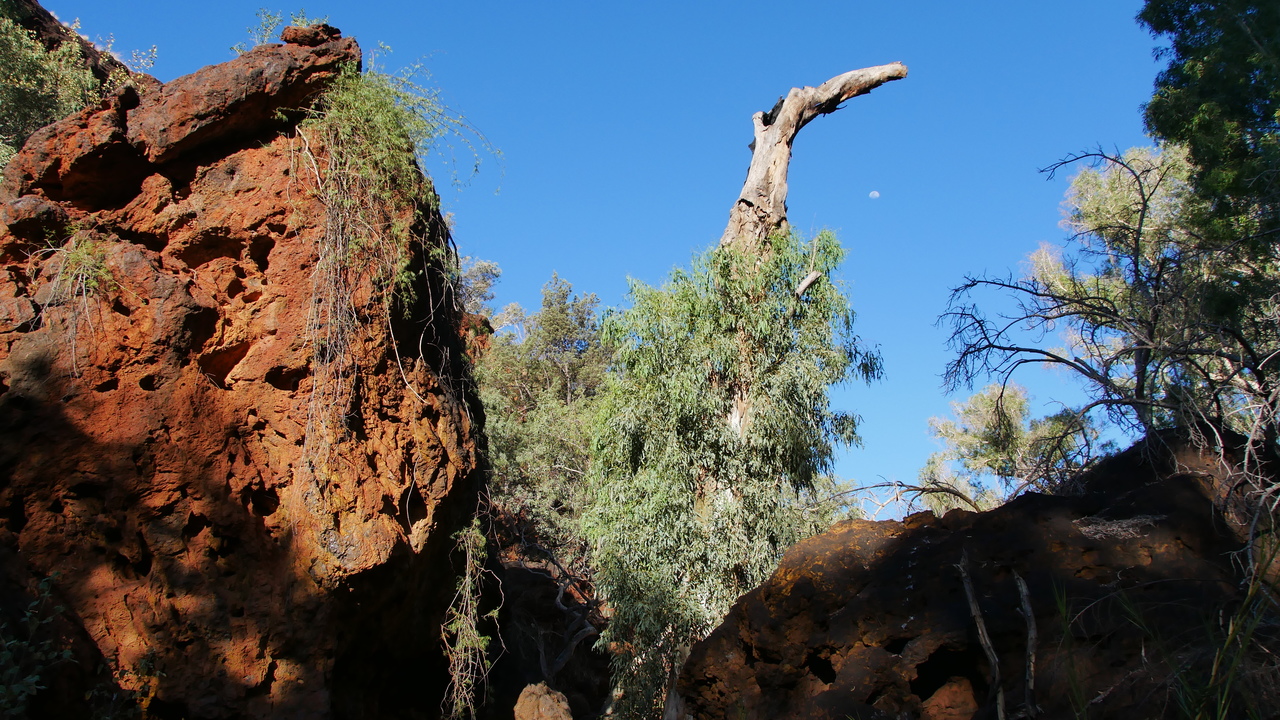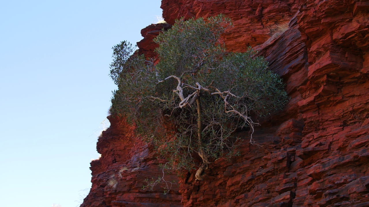 In der breiten Kalamina Gorge treffen wir auf jede Menge Algenschleier und fast keine Besucher. Die Kulisse wirkt wie eine Ausstellung von natürlichen, in Felswänden gewachsenen Bonsais.