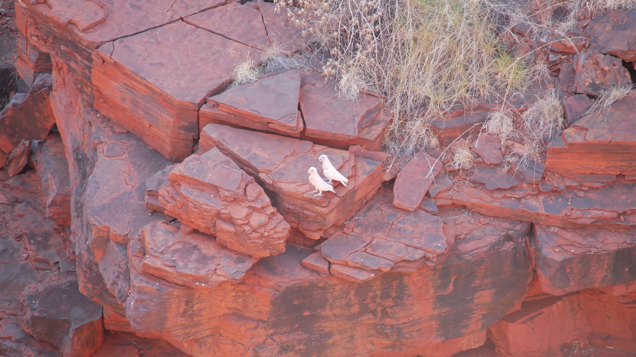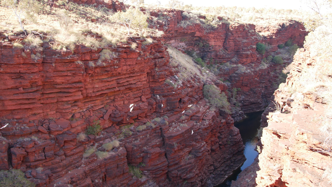 Ein gigantischer Wasserfalltrichter, in dem einzelne Tröpfchen hinabregnen - der Joffre Falls Lookout bietet einen tollen Ausblick. Schwärme von Little Corellas fliegen durch die Schlucht, die offenbar ein beliebter Dating Spot unter den weißen Papageien sind. Wir beobachten, wie tief unten einzelne Besucher die schmale Schlucht entlang schwimmen. Am Knox Lookout sehen wir die gegenüberliegenden Felswände dunkelrot leuchten. Spektakulär ist der Ausblick vom Oxer Lookout auf den Punkt, an dem sich vier der Schluchten treffen: Red Gorge, Knox Gorge, Weano Gorge und Hancock Gorge.
