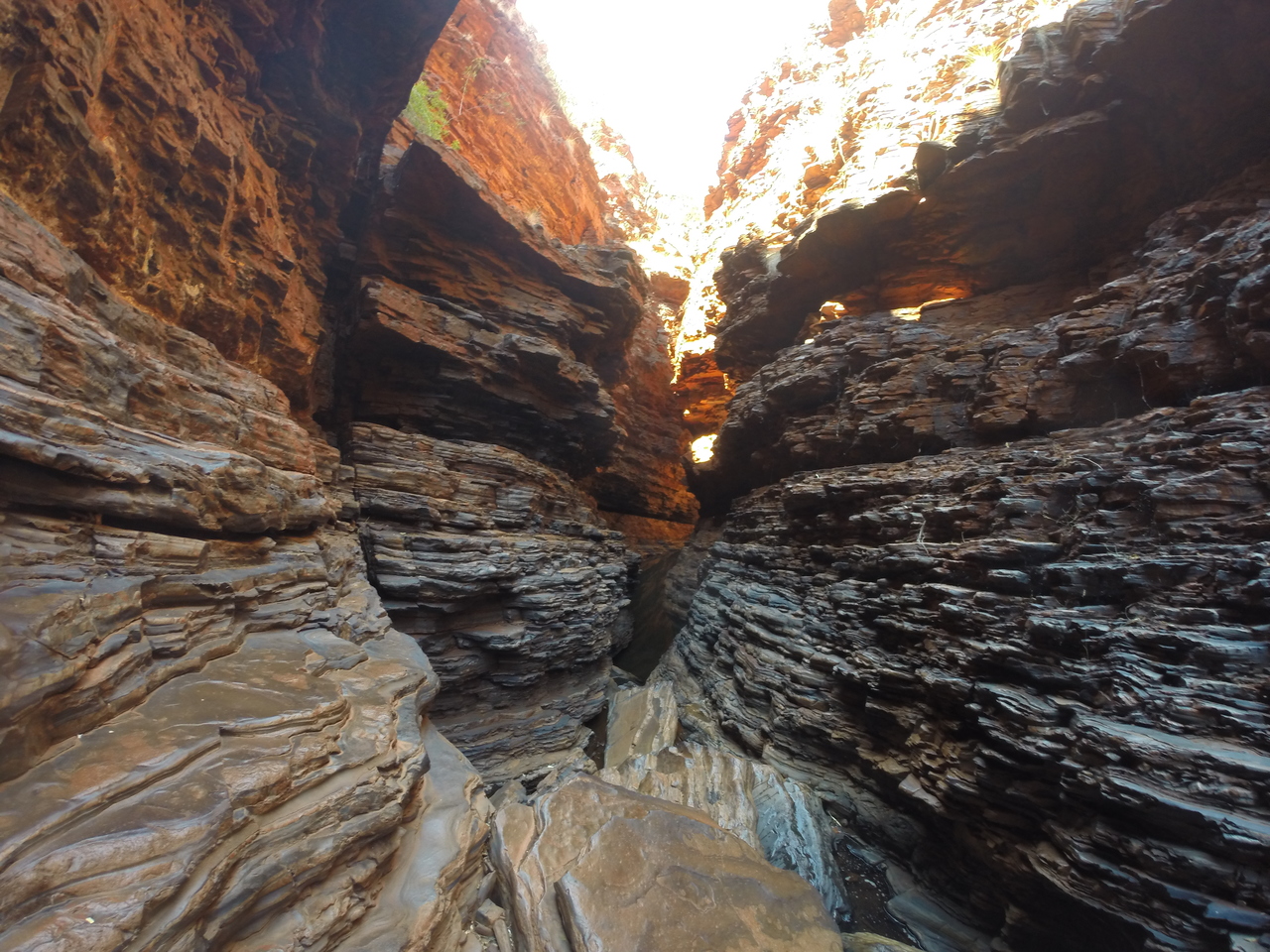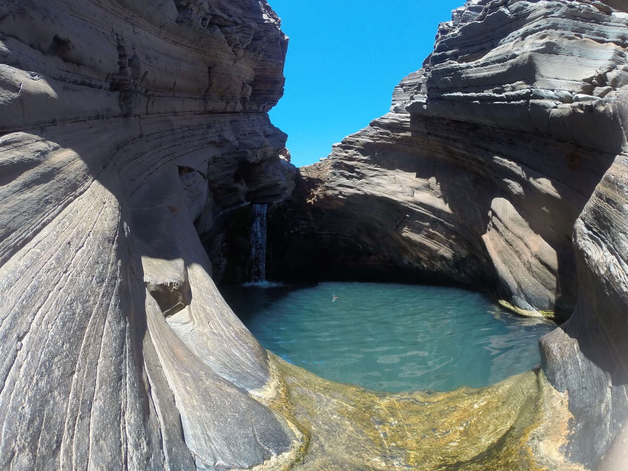 Über glitschige, algenbewachsene Felsen klettern wir in den Spa Pool der Hamersley Gorge. Ein kleiner Wasserfall plätschert in das runde Felsbecken. Offiziell soll man nicht mehr hier hoch klettern, da es zu Unfällen gekommen ist, aber wir sind bei weitem nicht die einzigen Traveller, die nicht widerstehen konnten. Die großen Wasserbecken sind von wellenförmigen, tiefrot-schwarzen Gesteinsschichten umgeben, die in der Abendsonne strahlen.