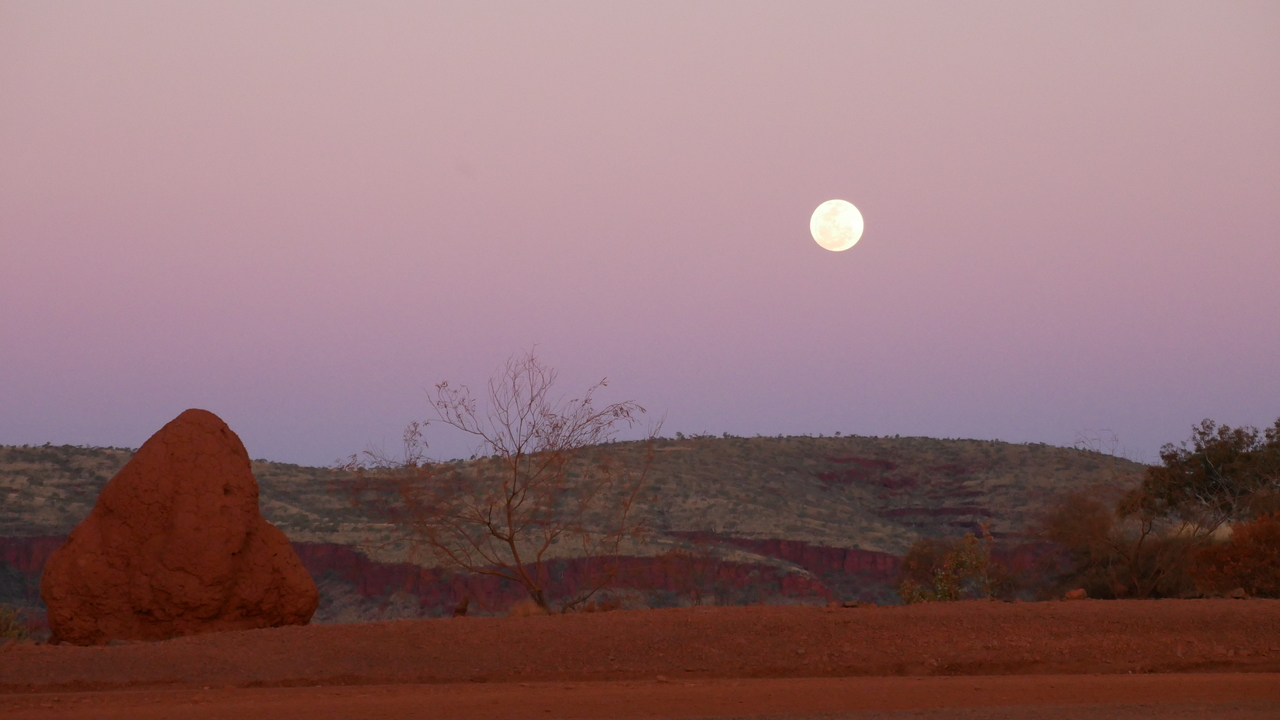 Als wir zum Paji zurückkommen, haben wir mal wieder einen Platten. Na toll! Diesmal hilft uns Teddy aus Melbourne, der seit vier Jahren mit Freundin und Hund Work & Travel quer durch Australien macht. Die Pechsträhne hält an: kurz darauf verschluckt Max eine Fliege, unsere Kofferraumtür geht auf, als wir den Hang vom Parkplatz hoch fahren und beim Kochen fackelt einer unserer Campingkocher ab. Warum auch immer. Entschädigt werden wir durch ein einzigartiges Naturschauspiel, als der Vollmond über der Hamersley Gorge aufgeht - ein gebührender Abschied vom majestätischen Karijini Nationalpark, der in unseren Augen der beeindruckendste Nationalpark in Western Australia ist.