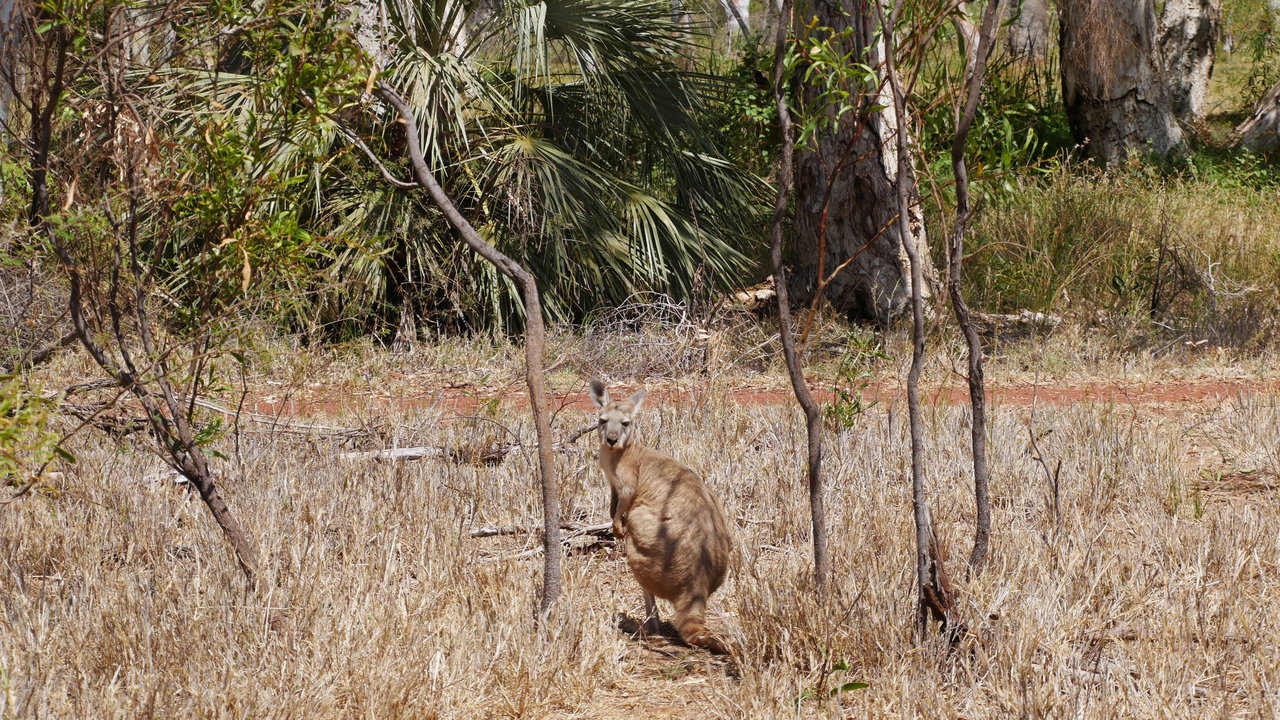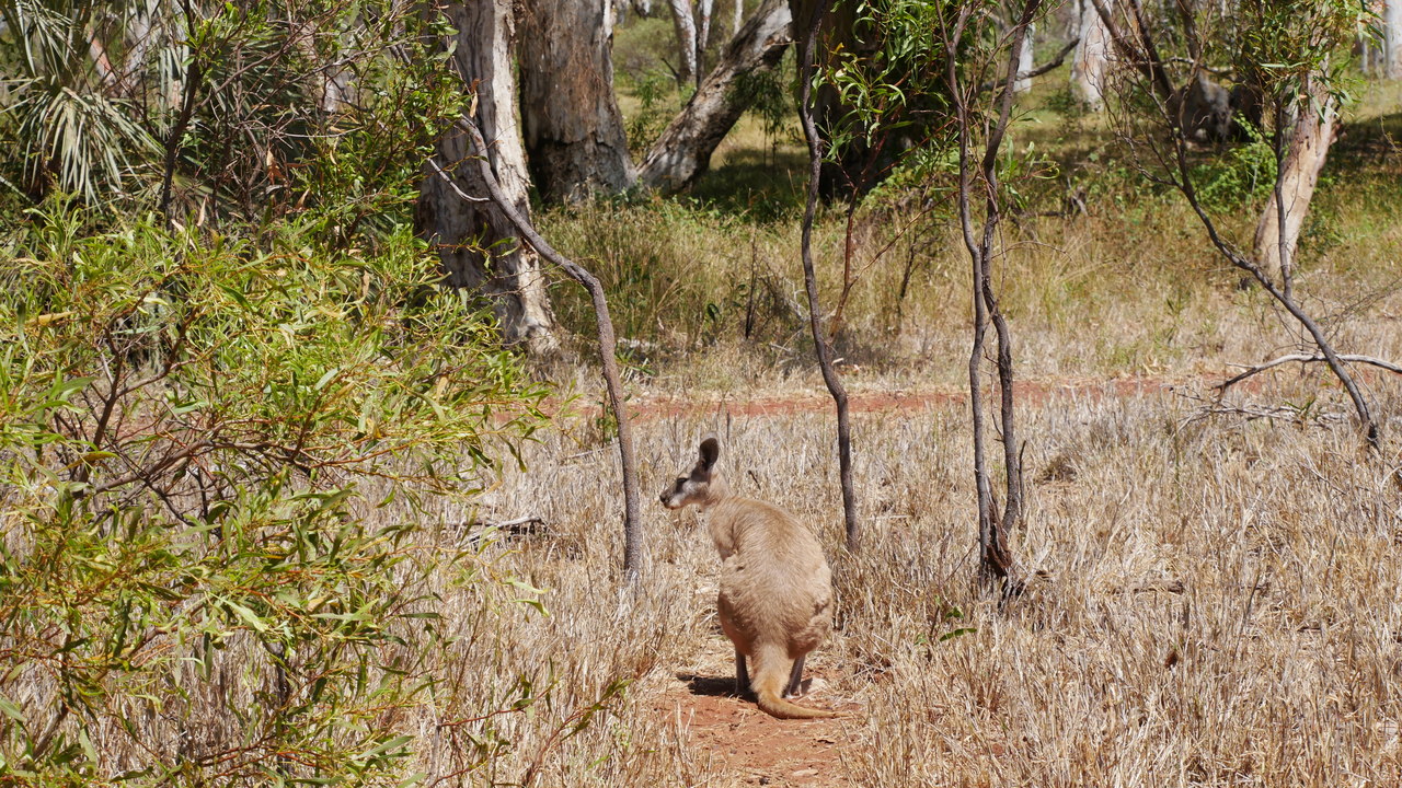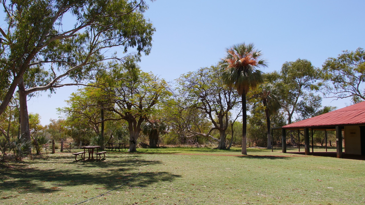 Wir sind in dieser Nacht die einzigen Gäste auf dem Campingplatz. In den frühen Morgenstunden hüpfen Kängurus um unser Fahrzeug herum. Morgens wandern wir über den Wetland Walk zu einem Seerosenteich, der für die Aborigines der Region von großer kultureller Bedeutung ist. Wir fühlen uns wie in einer Oase inmitten der Wüste: sprudelnde Bäche, saftige Gräser, Palmen und Myrtenheiden („paperbark tree“) umgeben uns und viele bunte Libellen surren durch die Luft. Ein Picknicktisch inmitten von weichem Klee lädt uns zum Frühstücken ein - bis wir vor einer Invasion aggressiver, beißender Ameisen heimgesucht werden und auf die Veranda des Homestead flüchten.