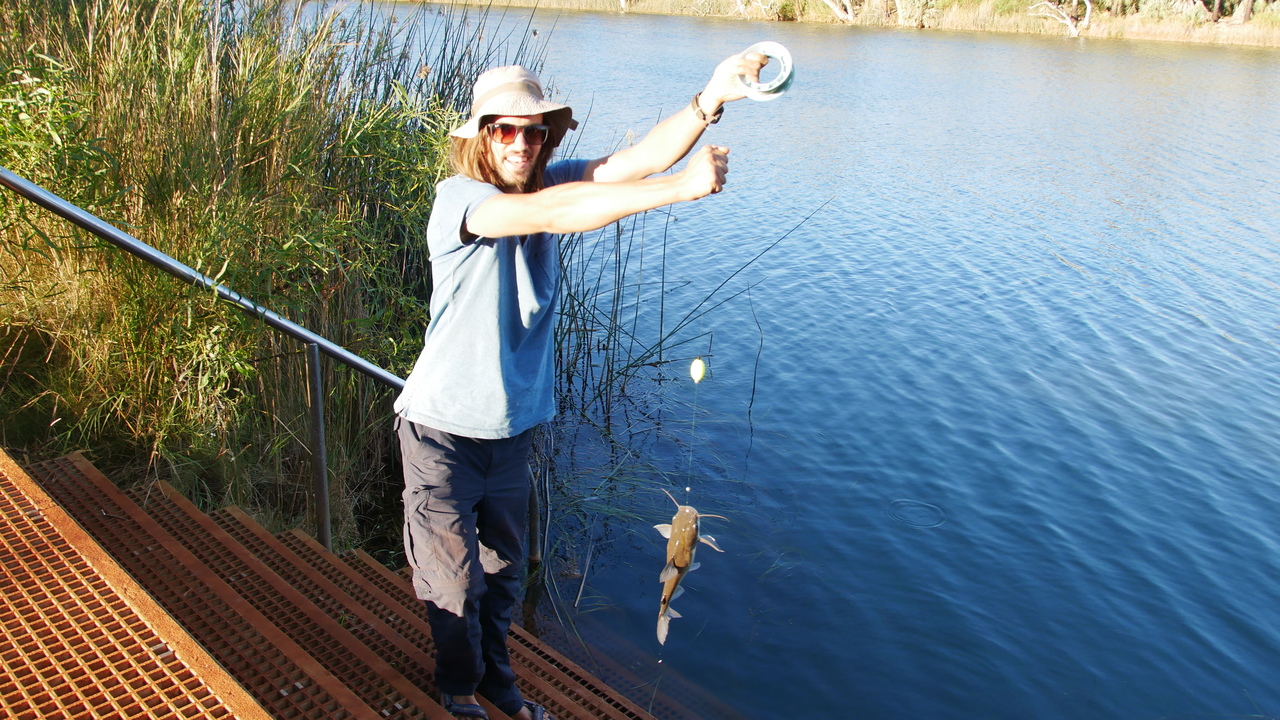 Ein Widerstand. Ein Ziehen an der Angelschnur. Ist das ein Fisch? Unglaublich - Max hat auf gut Glück die Angelschnur ausgeworfen und schon beim dritten Versuch hat ein Fisch angebissen! Schnell holt er die Angelschnur ein. Und wir sind erst einmal überfordert, wo wir doch überhaupt nicht damit gerechnet haben, tatsächlich einen Fisch zu fangen. Immerhin hat sich Max per YouTube schlau gemacht, wie man Fische tötet und ausnimmt. Trotzdem kostet es viel Überwindung. Auf dem Miliyanha Campingplatz braten wir den Fisch in der gut ausgestatteten Küche an. Dazu gibt es Couscoussalat vom Vortag und Rotwein. An dem Wels („catfish“) ist nicht allzu viel Essbares dran und er schmeckt recht süßlich und insgesamt so lálá. Aber die Erfahrung, einen selbst geangelten Fisch zu verspeisen, ist toll.