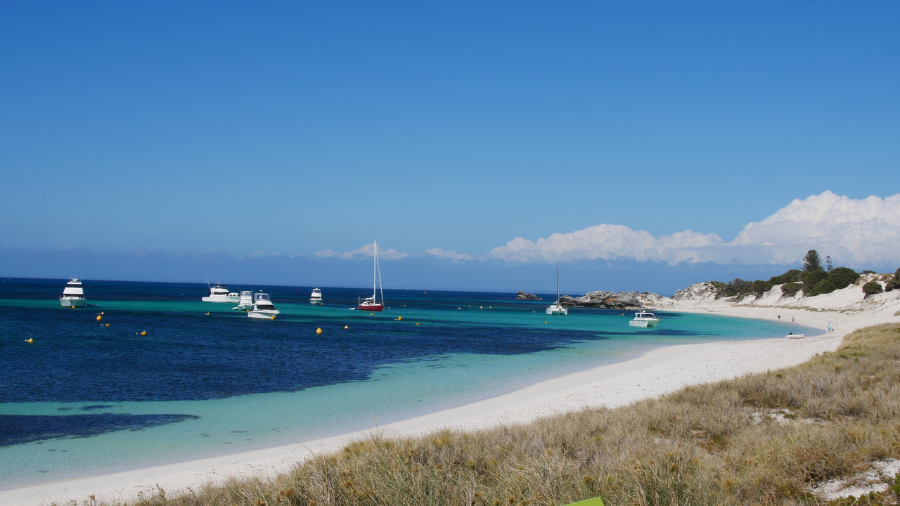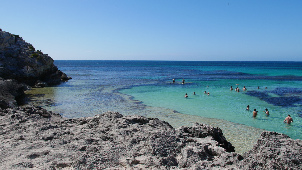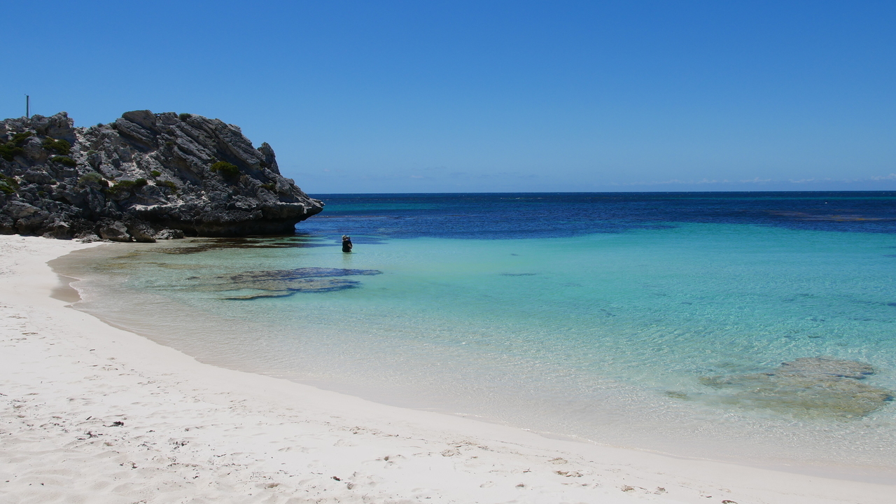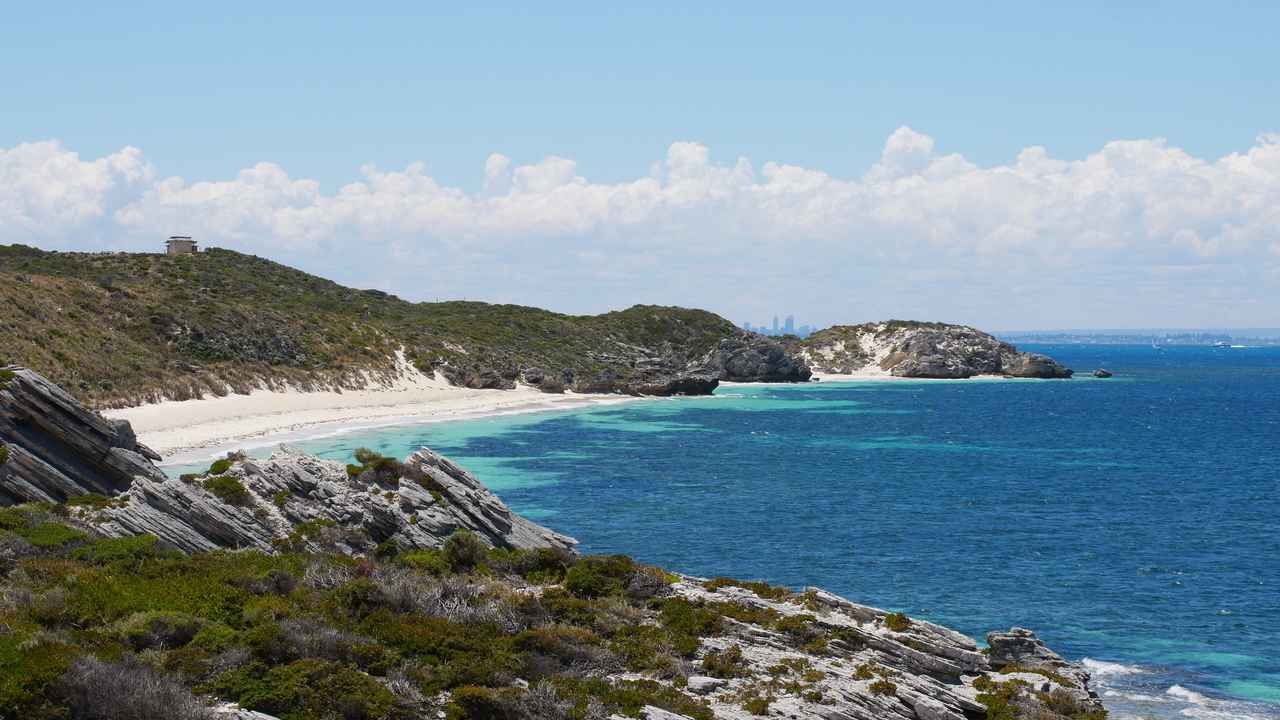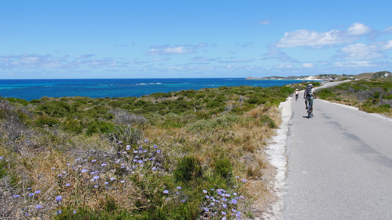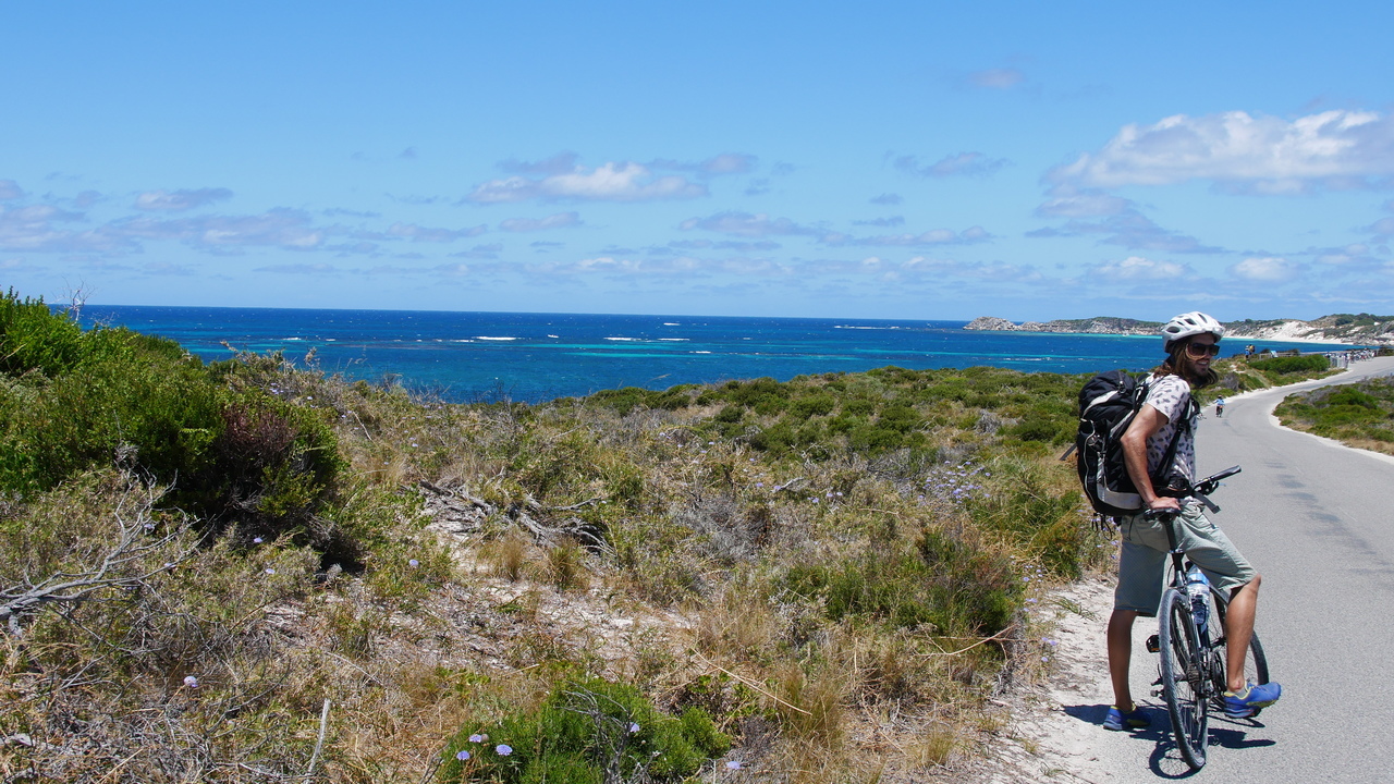Auf Rottnest Island sind keine Kraftfahrzeuge erlaubt und so stört kein Lärm die Idylle, als wir durch hügelige Dünenlandschaft an traumhaften Buchen mit türkisfarbenem Wasser und blendend weißen Stränden entlang radeln. An der Südküste pfeift uns ein starker Wind entgegen. Aus dem Wasser ragt das Schiffswrack der Shark empor und am Horizont zeichnet sich die Skyline von Perth ab. Im Landesinneren kommen wir an Wäldern voller Quokkas und mehreren Salzseen vorbei, so zum Beispiel am Pink Lake, der viermal salziger ist als das Meer.