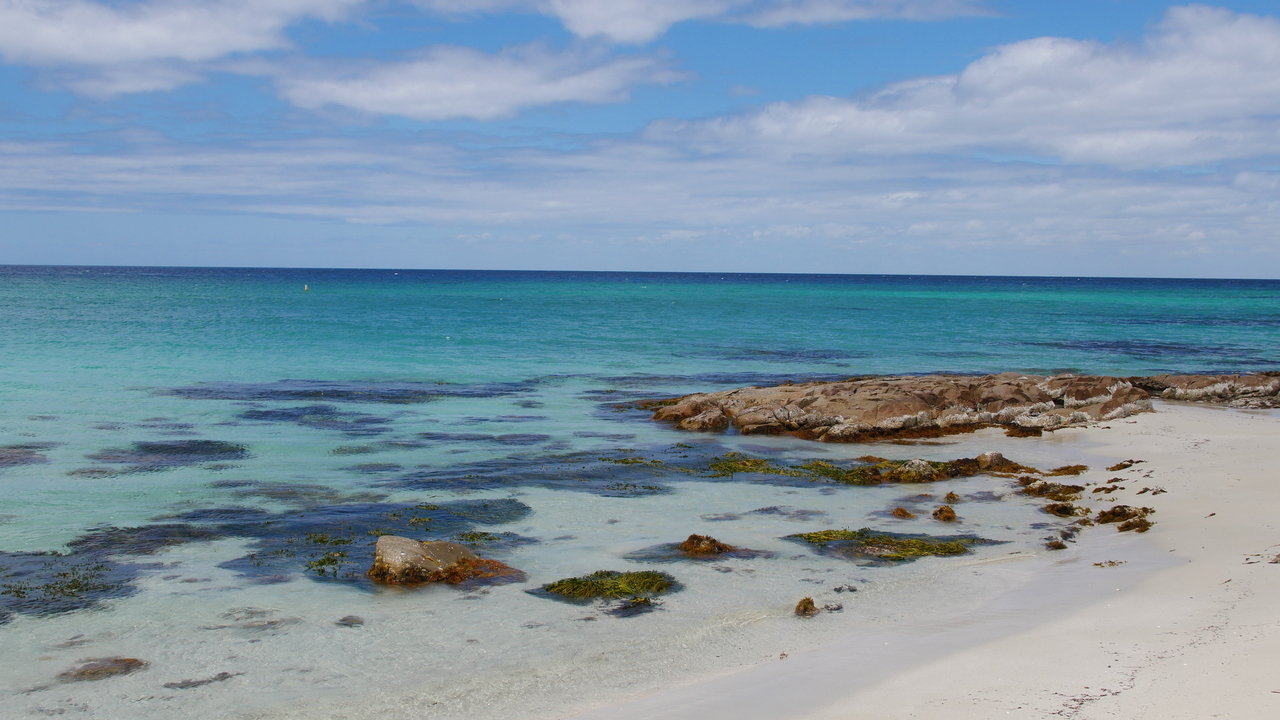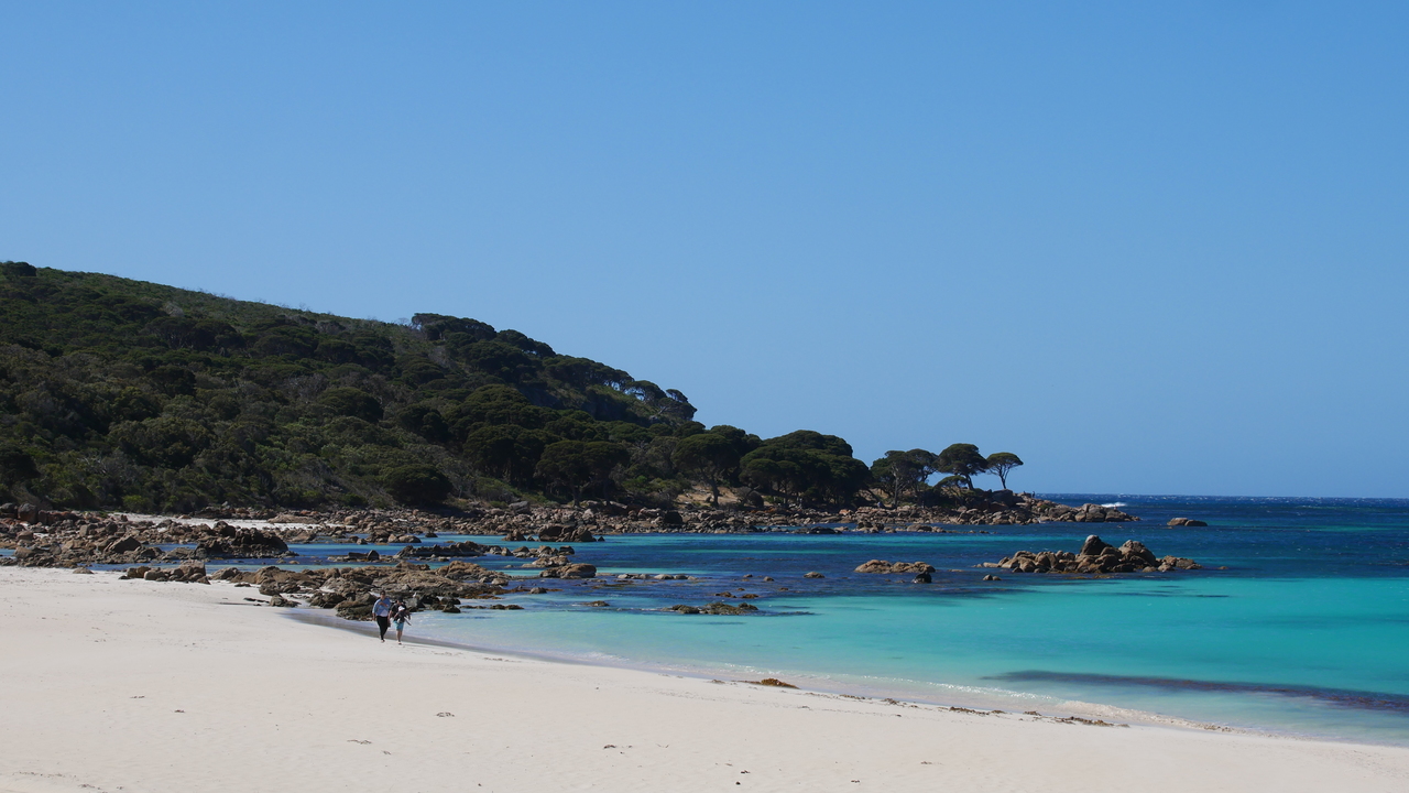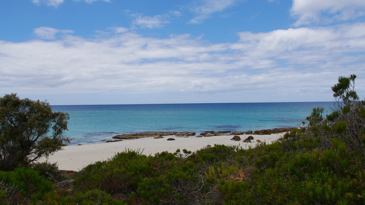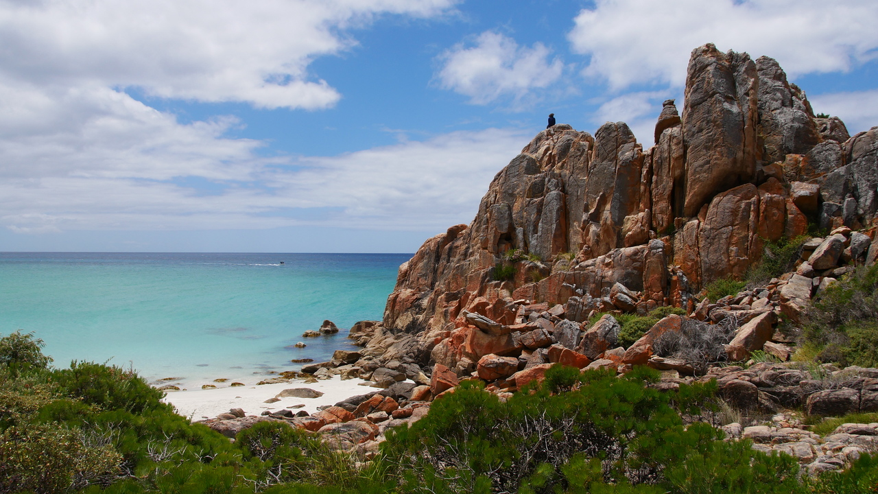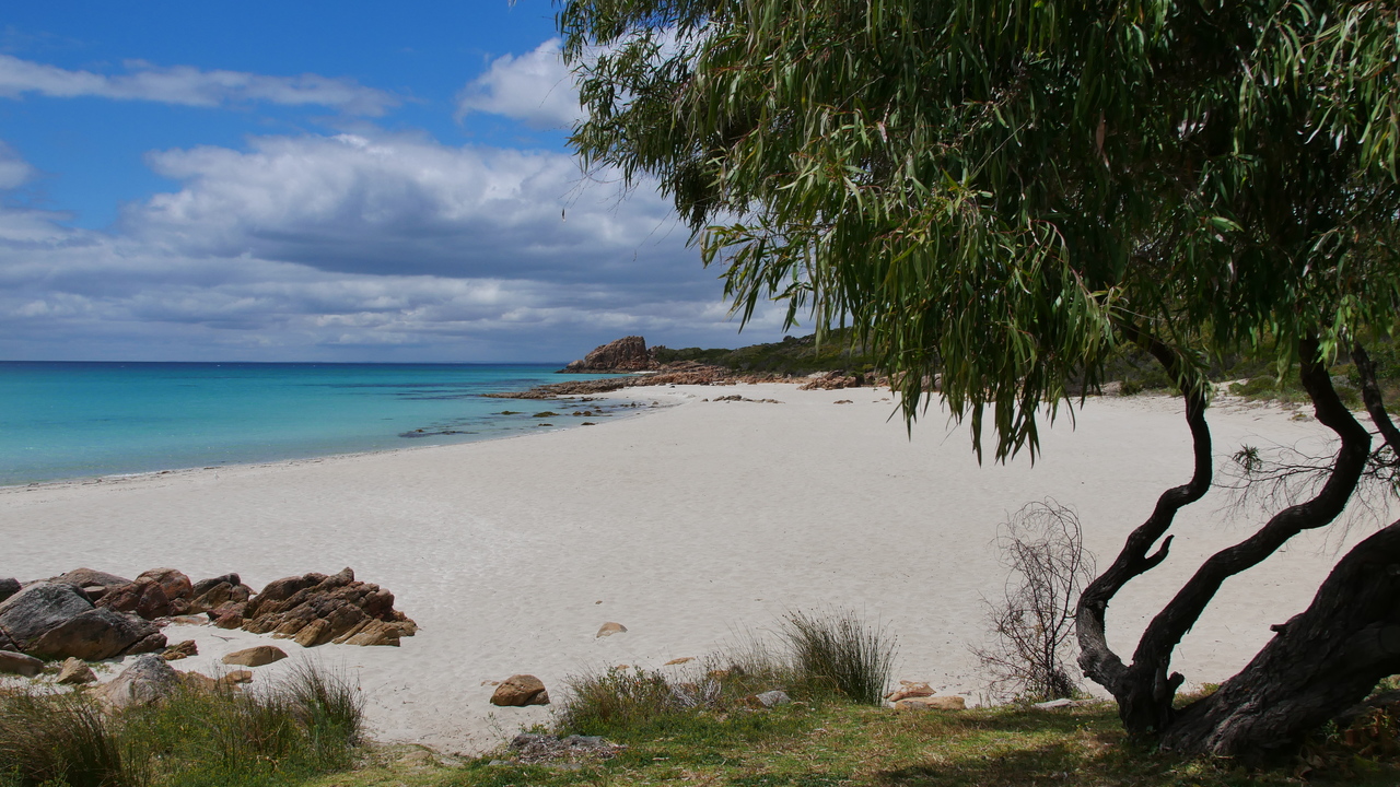 Feiner Sand, leuchtend blaues Wasser, blühende Küstenheide – die Strände vor Cape Naturaliste überbieten sich in ihrer Schönheit. Auf dem Weg zum Castle Rock laufen wir durch Heidelandschaft, die einem Irrgarten gleicht. Am Meelup Beach spielt eine Schulklasse Softball, am Eagle Bay liegt ein einsamer Katamaran und in der Bunker Bay gönnen wir uns einen Mocca mit Blick aufs Meer. Cape Leeuwin markiert den südwestlichsten Punkt des australischen Festlands, wo sich der Indische Ozean und das Südpolarmeer treffen. Heftige Böen wehen uns ins Gesicht, als wir das Gelände rund um den weißen Leuchtturm erkunden.
