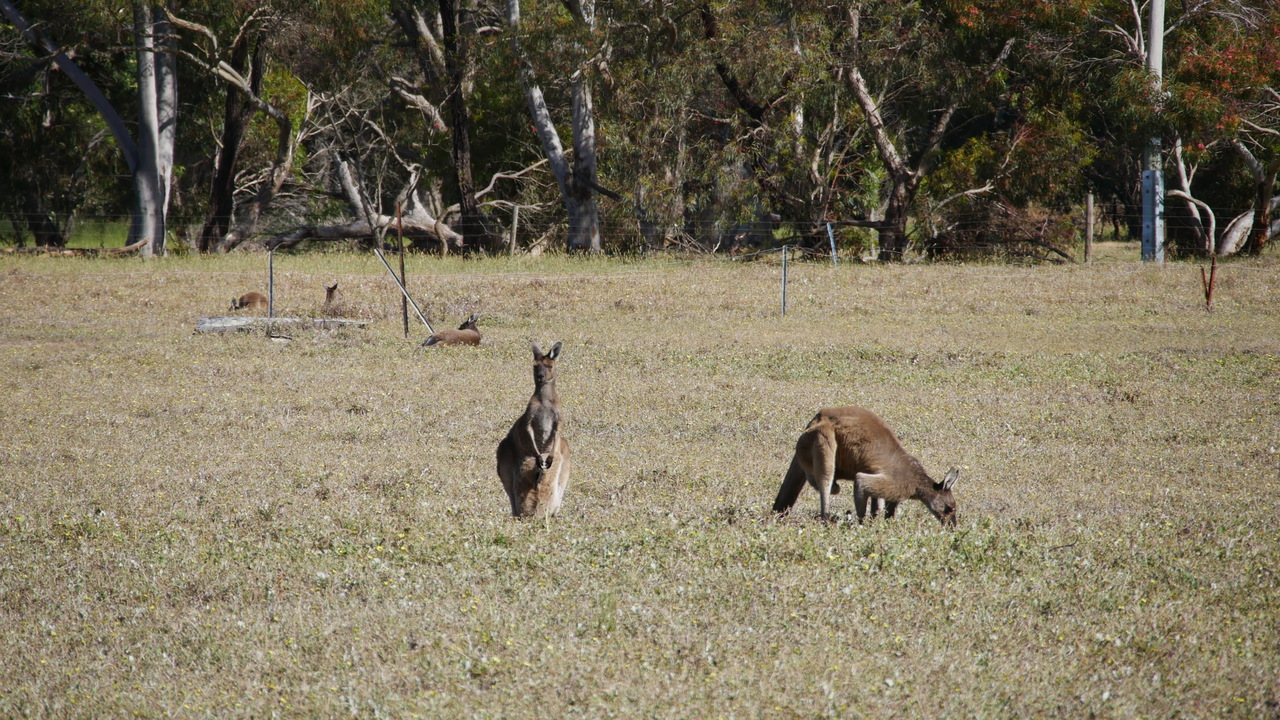 Auf der Glenbrook Estate Campside erwarten uns hohe Eukalyptusbäume und eine Wiese, auf der unzählige Kängurus grasen und ihre kleinen Joeys wild herum hopsen, um dann schnell wieder im Beutel zu verschwinden. Der sympathische Inhaber Jason empfiehlt uns eine Reihe von Weingütern in der Umgebung und gibt uns einen Tipp in Sachen Promillegrenze: Sprudel trinken, da die Kohlensäure die Testgeräte durcheinander bringe. Sein Fazit: „Way easier than having to shoot the copper“. In der Campingküche verbringen wir einen geselligen Abend mit Nobby aus Japan und einem Traveller-Pärchen aus Italien, das auch mit einem Pajero samt Dachzelt unterwegs ist. Alle drei sind bereits im zweiten Jahr im Working Holiday in Australien und verbringen die meiste Zeit mit Gelegenheitsjobs. Nobby bringt uns die „All you can eat“ und „All you can drink“-Kultur japanischer Pubs („Izakaya“) näher und die beiden Italiener empfehlen uns die Backpacker-Wärmflasche (einfach eine Plastikflasche mit heißem Wasser füllen), die uns schon ein paar Stunden später in der 8 Grad kalten Nacht gute Dienste erweist. Während wir mit Nobby beim Frühstück sitzen, erlegt Jason eine hochgiftige Schwarze Tigerotter, die er anders nicht aus seiner Wohnung heraus bugsieren konnte. Er töte nur äußerst ungern Schlangen, erklärt er uns kurz darauf, zumal sie Ratten jagen.
