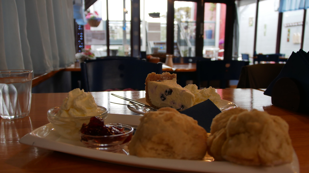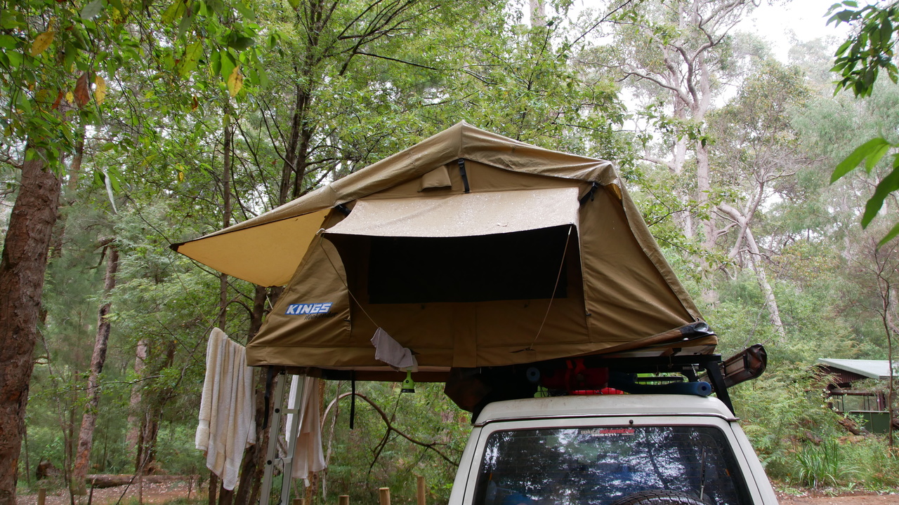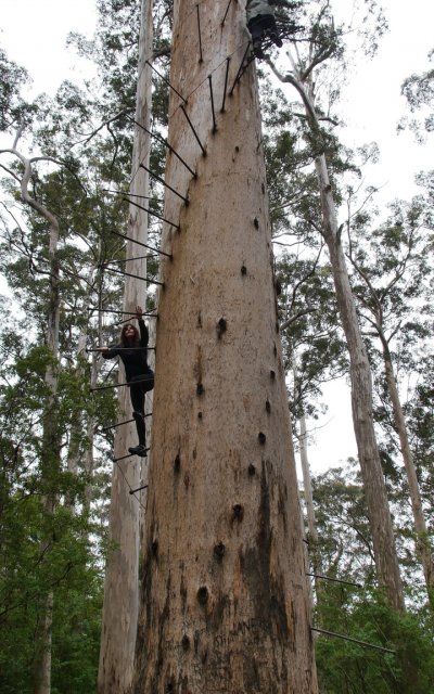 Über Nacht hat es geregnet und nach mehreren Monaten ist das Dachzelt erstmals nass geworden. Der Karri Forest Explorer führt uns zu zwei Kletterbäumen: der 68 Meter hohe Gloucester Tree diente lange als Aussichtspunkte, um ein Waldbrände frühzeitig zu erkennen, und wurde dazu in den 1930er Jahren mit Stahlstreben gespickt. Heute kann hier jeder hinaufsteigen, der sich dies ohne Sicherung zutraut. David zufolge kam dabei noch nie jemand zu Schaden, wenn man von zwei Herzinfarkten absieht, die glimpflich ausgingen. Da die Stahlstreben noch regennass und rutschig sind, begnügen wir uns mit ca. 15 Metern Höhe auf dem 75 Meter hohen Dave Evans Bicentannial Tree. Schade, die Aussicht hätten wir gerne genossen. Nieselregen und kühler Wind treiben uns ins Top Deck Café in Walpole, wo es leckere Scones und Blueberry Cheesecake gibt. Nach knapp vier Monaten Sonne können wir den ersten verregneten Tag auf unserem Road Trip verschmerzen.
