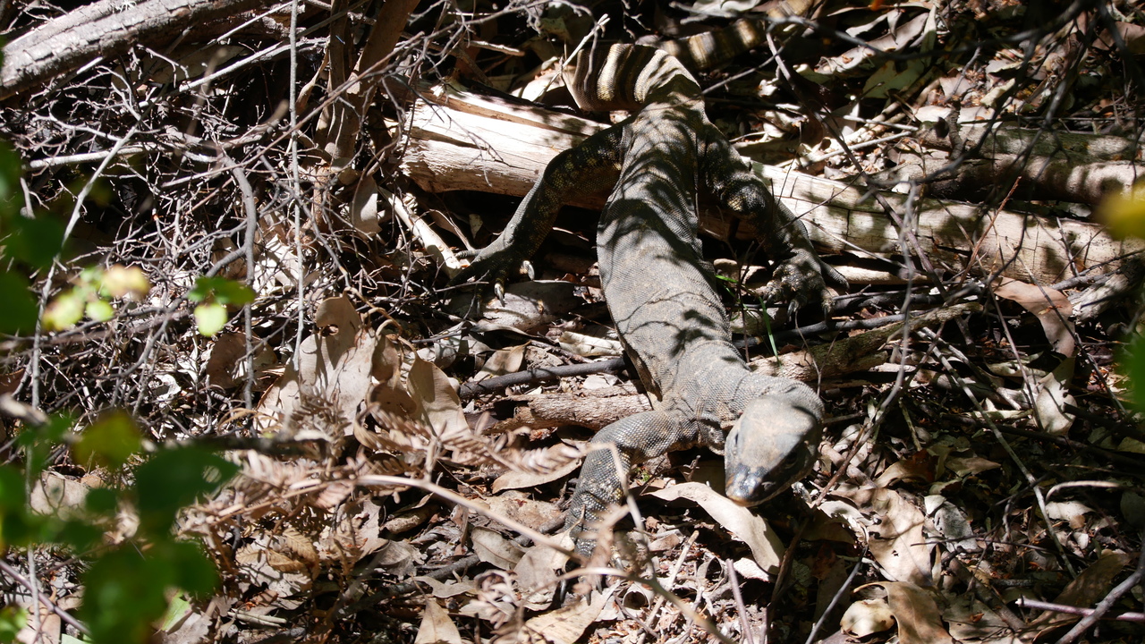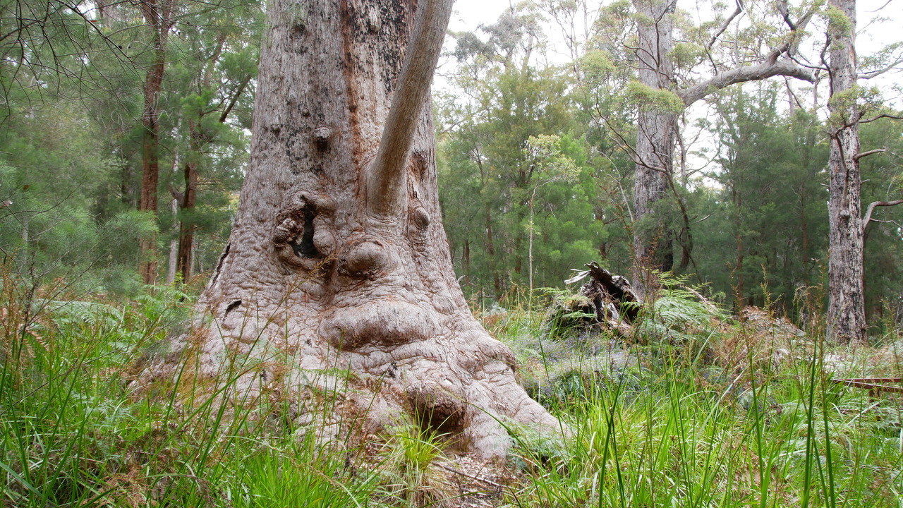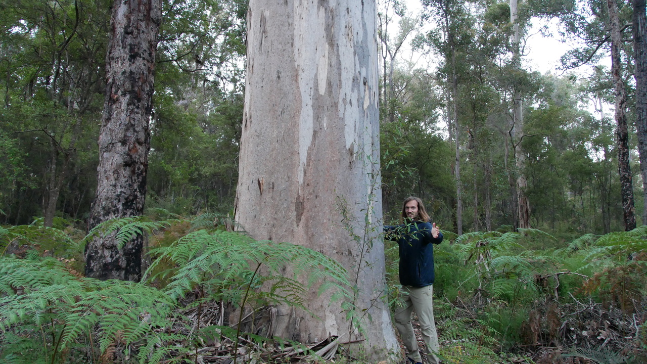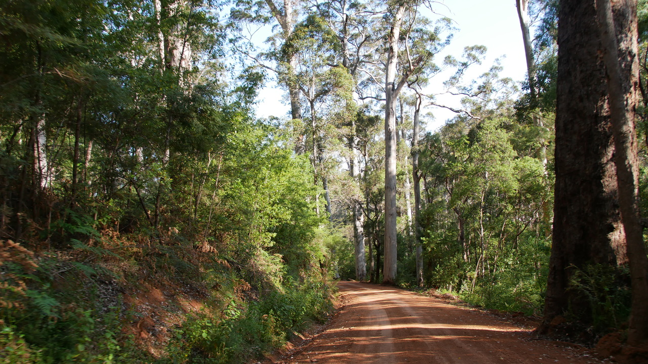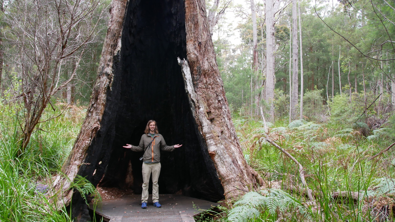 Unter riesigen Eukalyptusbäumen, zwischen denen bunte Papageien und scheinbar winzige Vögel umherfliegen, errichten wir auf dem Karri Gully Campingplatz unser Lager. Wir sind ganz allein, nur die noch warme Asche im Lagerfeuer zeugt davon, dass hier vor kurzem noch jemand gecampt hat. Als es dunkel wird, sitzen wir am Lagerfeuer, genießen die Natur und Anna spielt Gitarre. Am nächsten Morgen wandern wir ein Stück auf dem Bibbulmun Track, der direkt am Camp vorbeiführt und in 1000 Kilometern von Perth bis nach Albany an der Südküste führt. Der Eukalyptuswald ändert sein Erscheinungsbild alle zehn Minuten und lässt viel Licht für Farne, Sträucher und Wildblumen. Wir sehen erstmals ein Goanna am Wegesrand, das überraschenderweise gar nicht scheu ist.