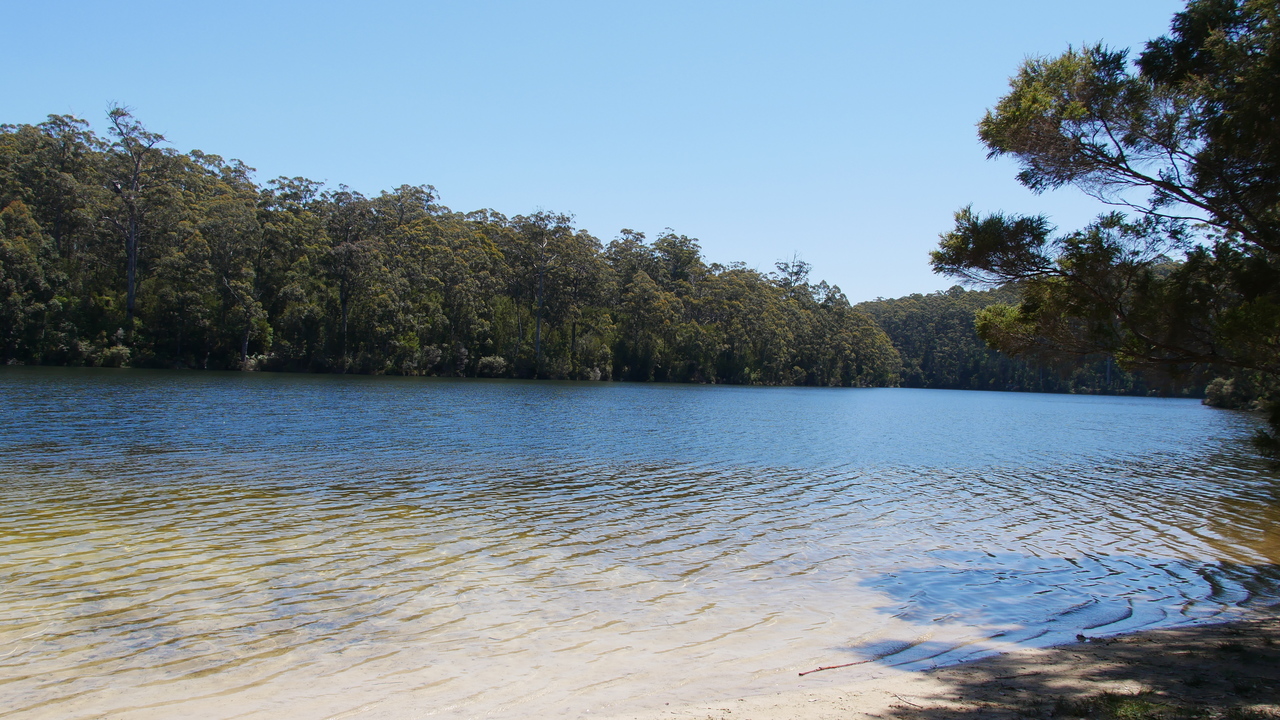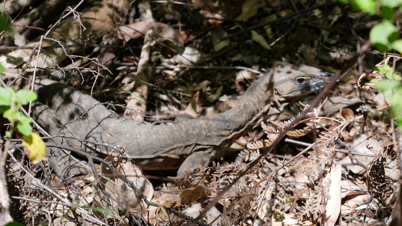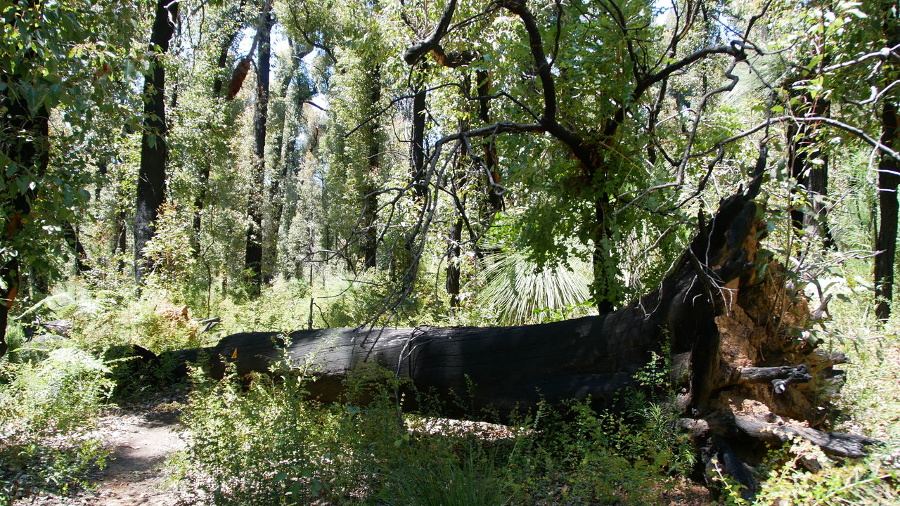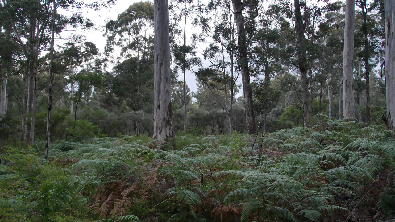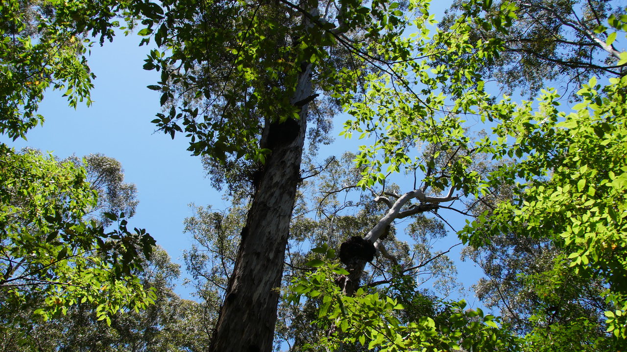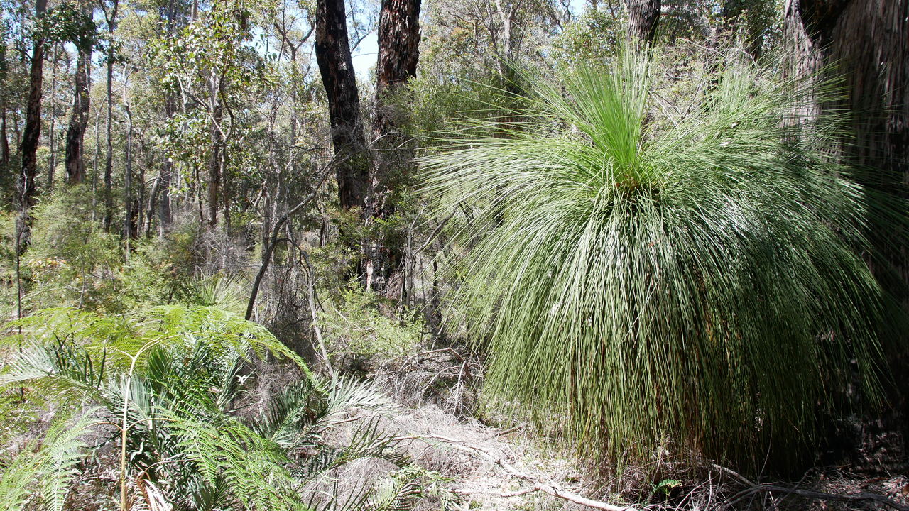 Unter riesigen Eukalyptusbäumen, zwischen denen bunte Papageien und scheinbar winzige Vögel umherfliegen, errichten wir auf dem Karri Gully Campingplatz unser Lager. Wir sind ganz allein, nur die noch warme Asche im Lagerfeuer zeugt davon, dass hier vor kurzem noch jemand gecampt hat. Als es dunkel wird, sitzen wir am Lagerfeuer, genießen die Natur und Anna spielt Gitarre. Am nächsten Morgen wandern wir ein Stück auf dem Bibbulmun Track, der direkt am Camp vorbeiführt und in 1000 Kilometern von Perth bis nach Albany an der Südküste führt. Der Eukalyptuswald ändert sein Erscheinungsbild alle zehn Minuten und lässt viel Licht für Farne, Sträucher und Wildblumen. Wir sehen erstmals ein Goanna am Wegesrand, das überraschenderweise gar nicht scheu ist.