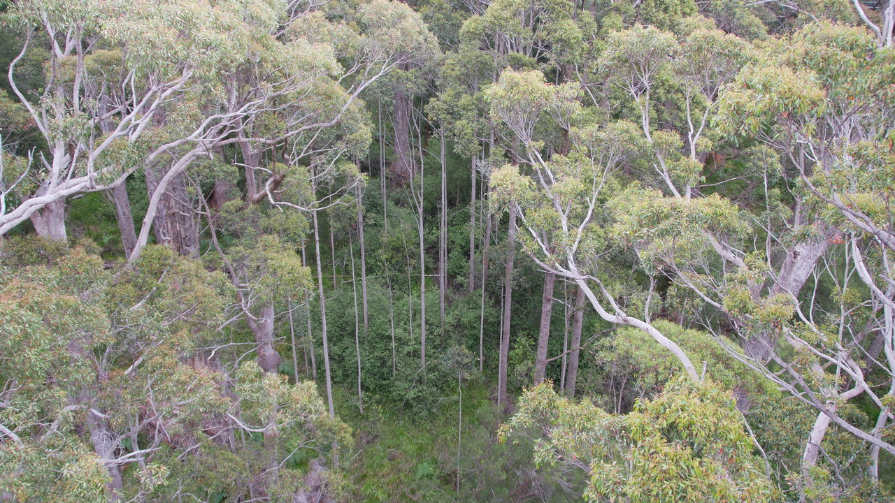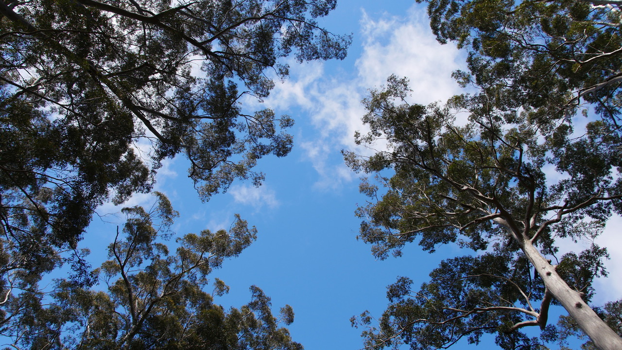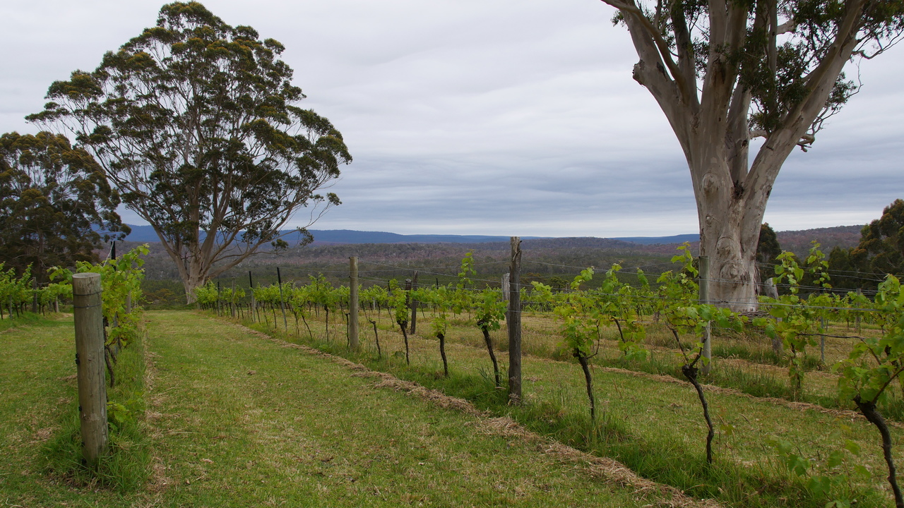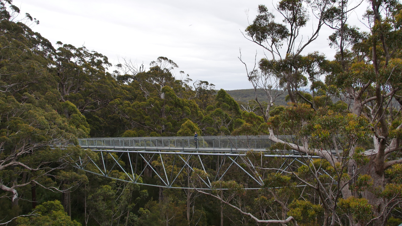 Der Blick über das Valley of the Giants mit Wäldern, Weinbergen und Olivenhainen erinnert uns an die Toskana. Zwischen verschiedenen Arten von Eukalyptusbäumen, Miniorchideen und messerscharfem Silberhaargras schlängelt sich der Ancient Empire Walk hindurch. Der Stamm vieler der Red Tingle Trees ist durch Waldbrände unten hohl und dient einer Gruppe von Asiaten in Harry-Potter-Outfits als Kulisse für ihr Fotoshooting. Schließlich führt uns der Tree Top Walk 40 Meter hinauf in die Wipfel der Eukalyptusriesen, wo sich uns eine ganz neue Perspektive auf den Wald eröffnet. Die Eisenkonstruktionen schwanken spürbar und wir beobachten winzige grüne Vögel in den Baumkronen, die wie Karriblätter aussehen, als es wieder zu nieseln beginnt.