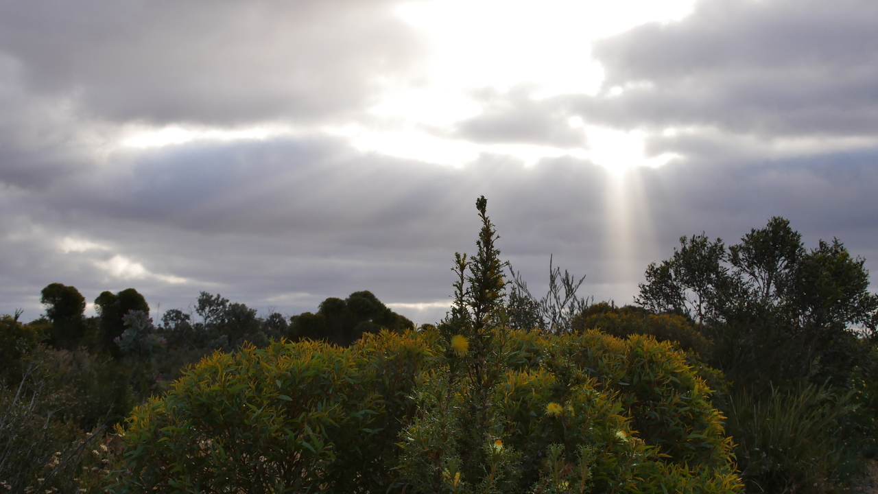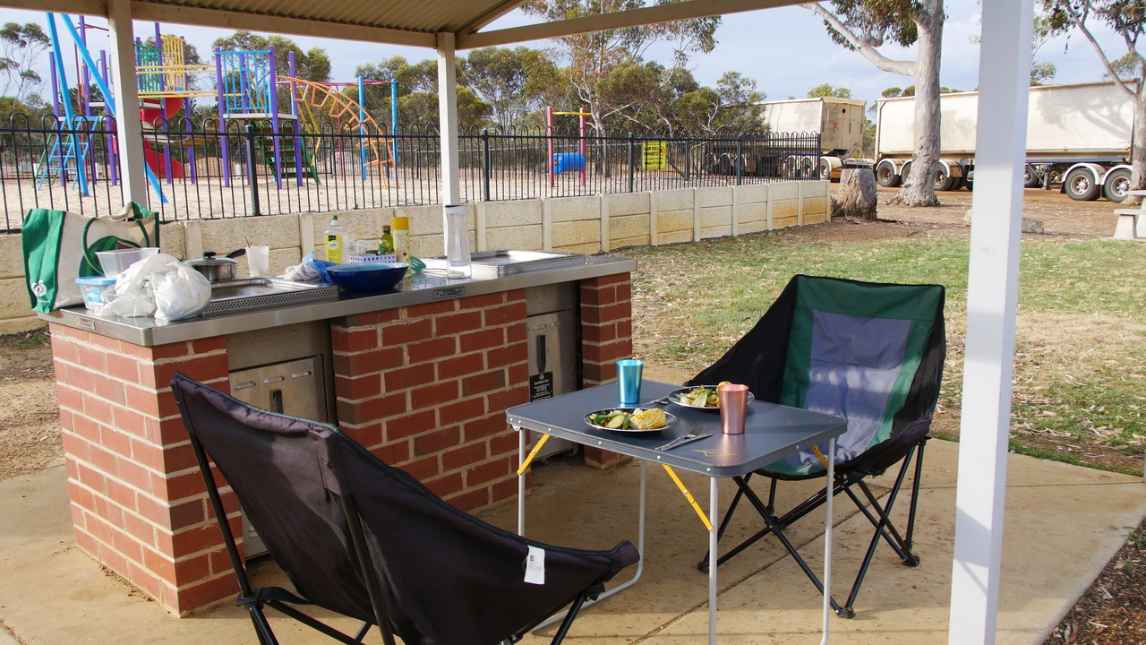 Der Himmel wird immer schwärzer. Gerade als wir am Munglinup Truck Stop eintreffen, beginnt es zu regnen. Glücklicherweise gibt es hier einen überdachten Gasgrill, wo wir uns ein frühes Abendessen zubereiten. Als wir unser Dachzelt aufbauen und einen kleinen Spaziergang machen, scheint schon wieder die Sonne. Hier lernen wir Janine und David aus der Schweiz kennen, die uns prompt in ihren geräumigen VW-Sprinter-Campervan einladen. Dort verbringen wir einen geselligen Abend mit Weißwein, Popcorn und Schweizer Schokolade.