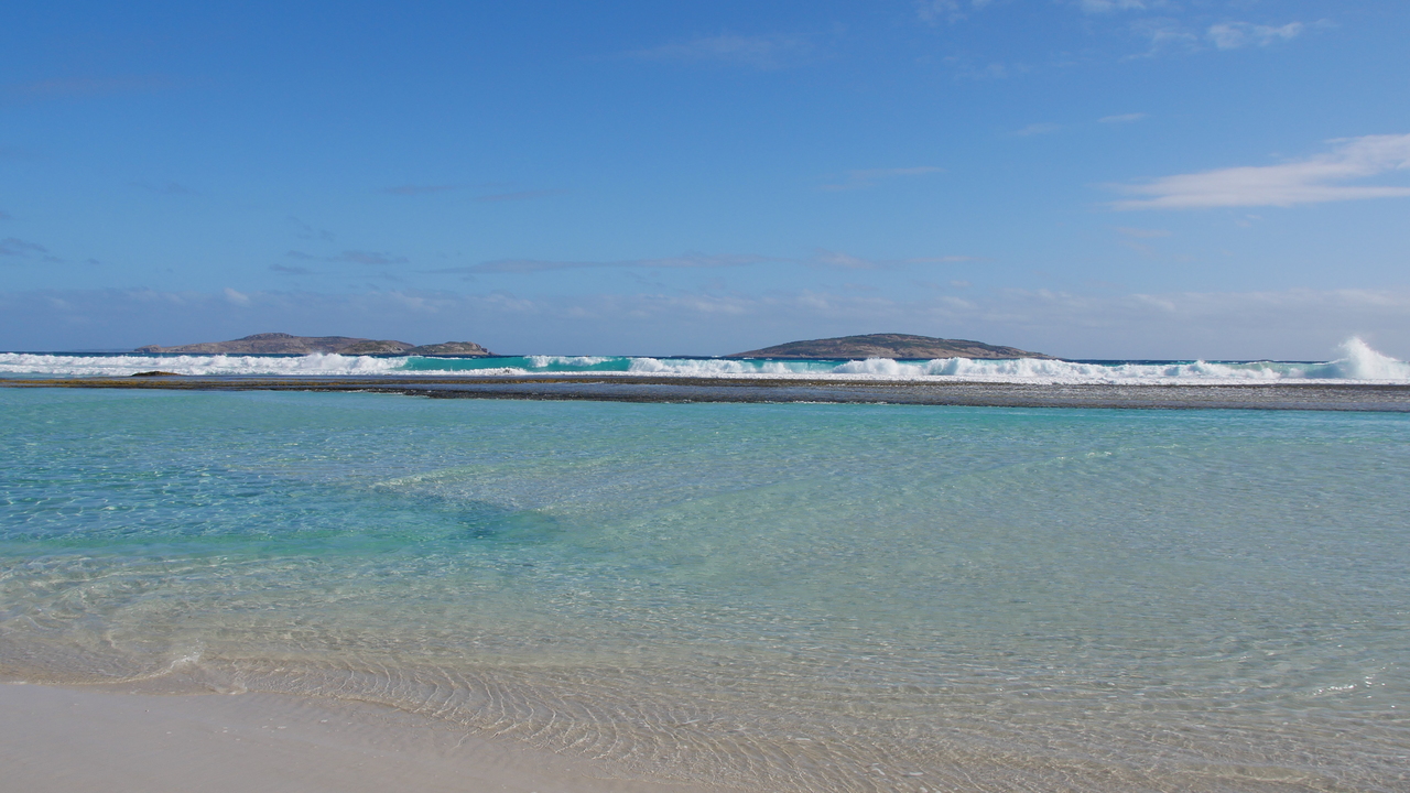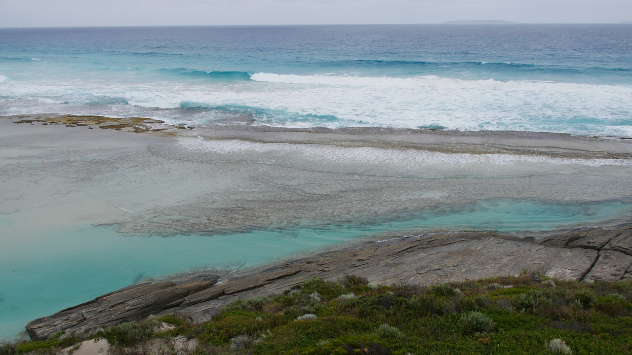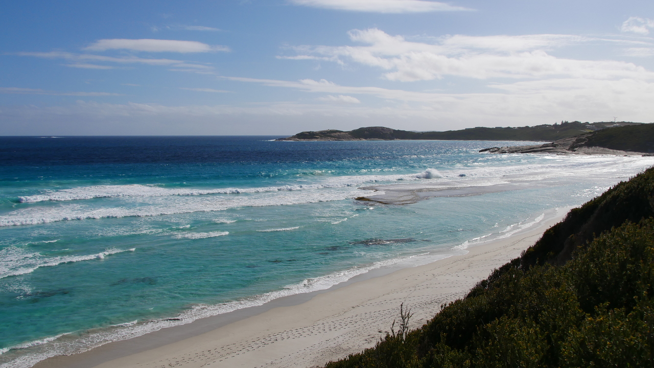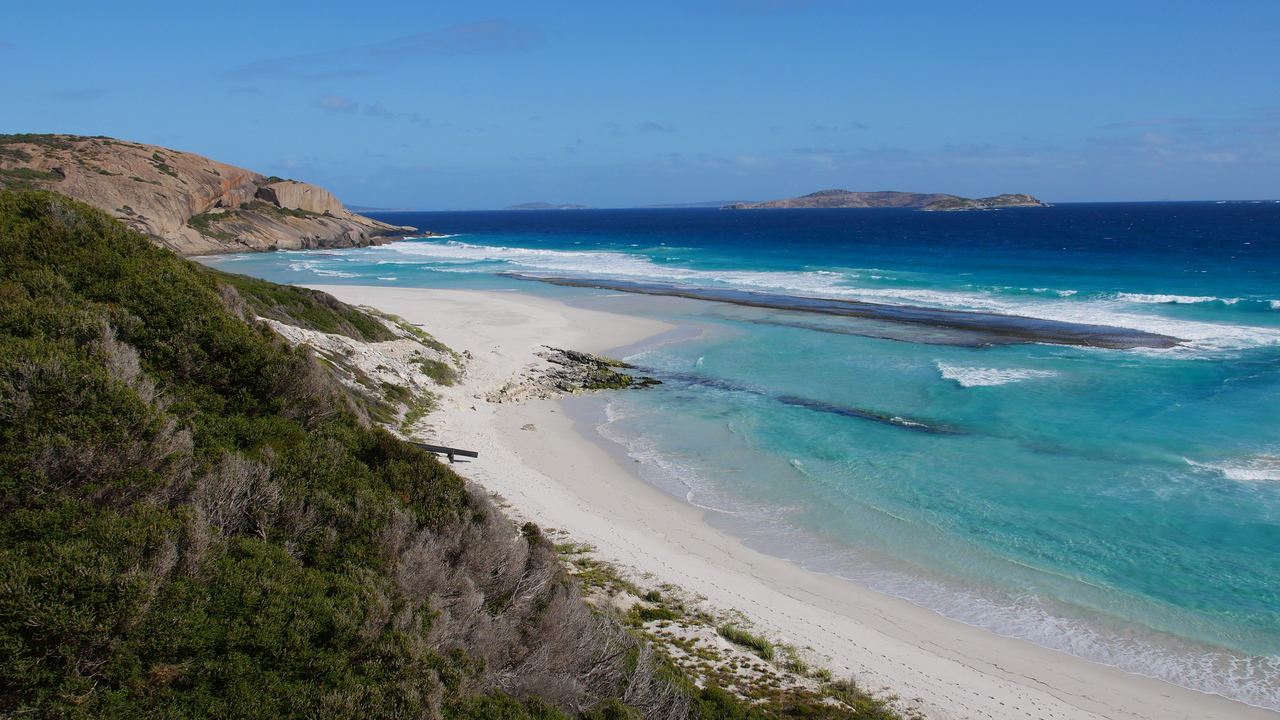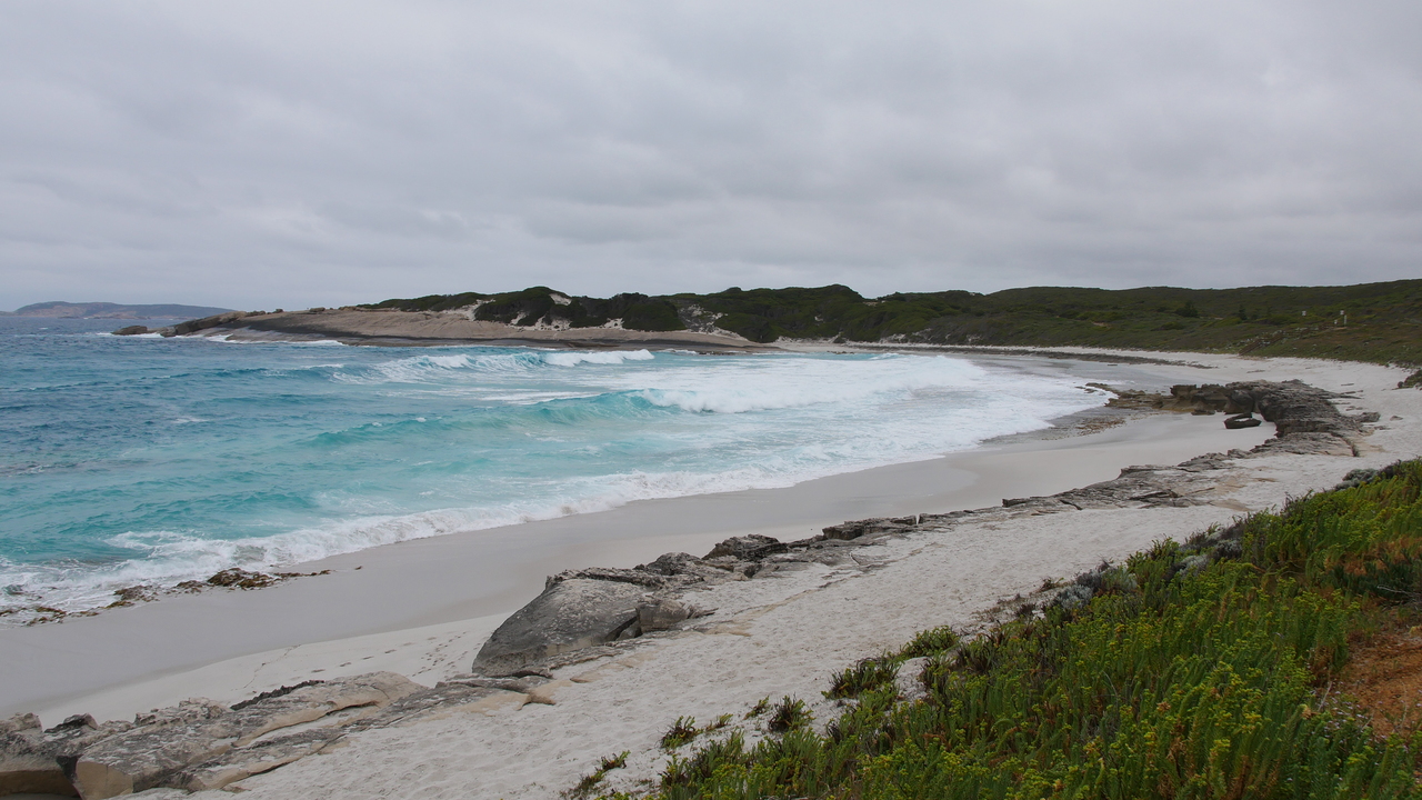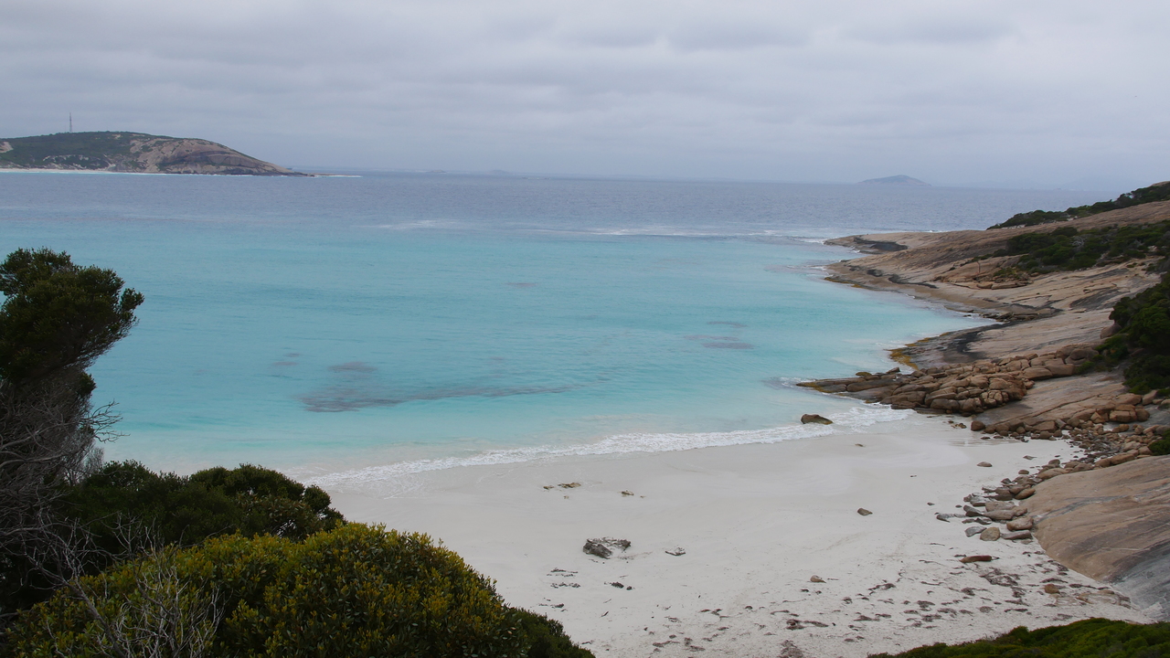Der Great Ocean Drive führt uns vorbei an weißen Dünenstränden, blauen Lagunen und einem Pink Lake, der wegen des niedrigen Salzgehalts quasi umgekippt und jetzt blau ist. Besonders gut gefallen uns der Eleven Mile Beach, der Twilight Beach und der Blue Haven Beach. Wechswelhaftes und ungewohnt kühles Wetter treibt uns in Esperance ins Dôme Café, wo wir uns bei Mocca und Scones aufwärmen. Die Wärme genießen wir auch in Spa und Sauna des Leisure Centers Bay of Isles. Interessanterweise kann man hier im Hallenbad mit Straßenkleidung und -schuhen direkt zum Schwimmbecken spazieren, was auch viele Eltern tun, die ihre Kinder beim Planschen beaufsichtigen. Neben uns ziehen die Teilnehmer mehrerer Schwimmkurse ihre Bahnen: die einen sind sehr fortgeschritten, die anderen sehr übergewichtig.