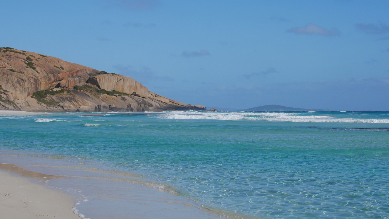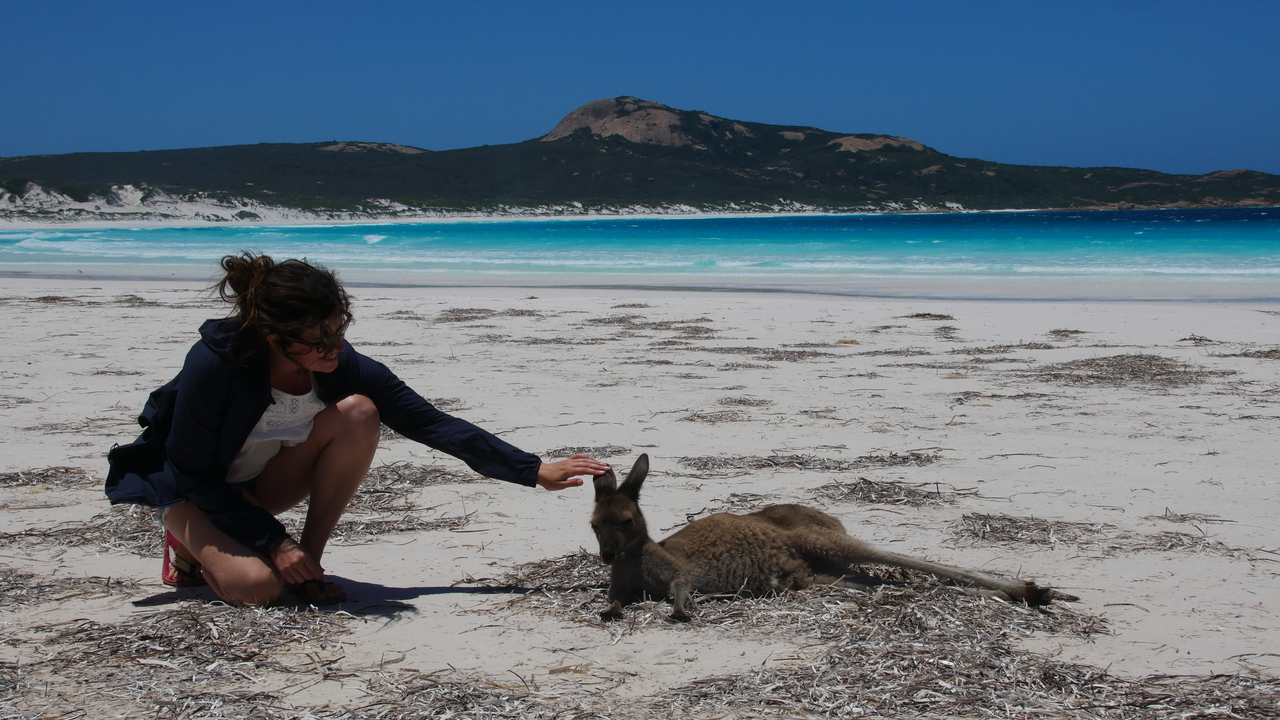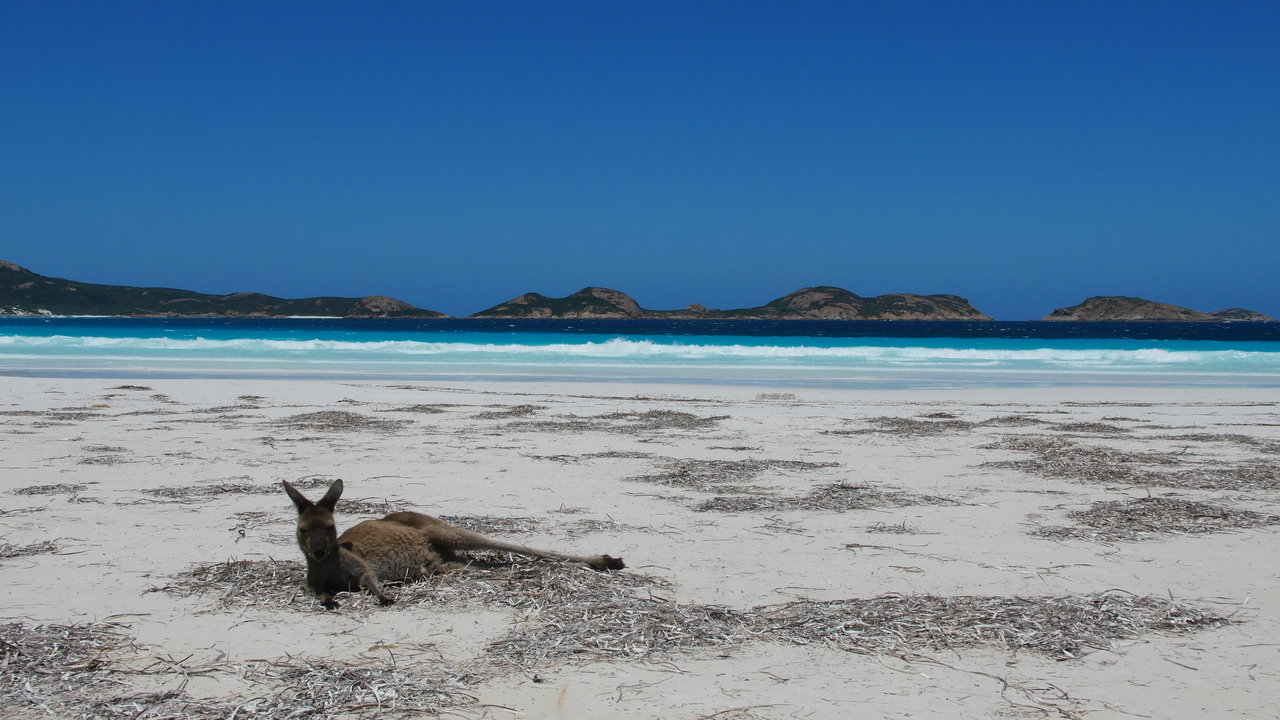 Wie eine Felshöhle in Muschelform droht der Frenchman Peak auf seinem kahlen Berg über dem Cape-Le-Grand Nationalpark. Die Lucky Bay könnte traumhafter nicht sein: in der halbmondförmigen Bucht trifft weißer, quietschender Quarzsand auf leuchtend türkises Wasser, während sich im Hintergrund faszinierende Felsformationen abzeichnen. Das Highlight der Lucky Bay sind die Kängurus, die man hier am Strand antreffen kann. Wir sind „lucky“: ein süßes Känguru liegt im Sand und lässt sich die Sonne aufs Fell scheinen. Es ist überraschend zutraulich und lässt sich von Anna sogar am Köpfchen streicheln. Nach so viel Glück fahren wir auf direktem Wege zur größten Goldmine Australiens ...