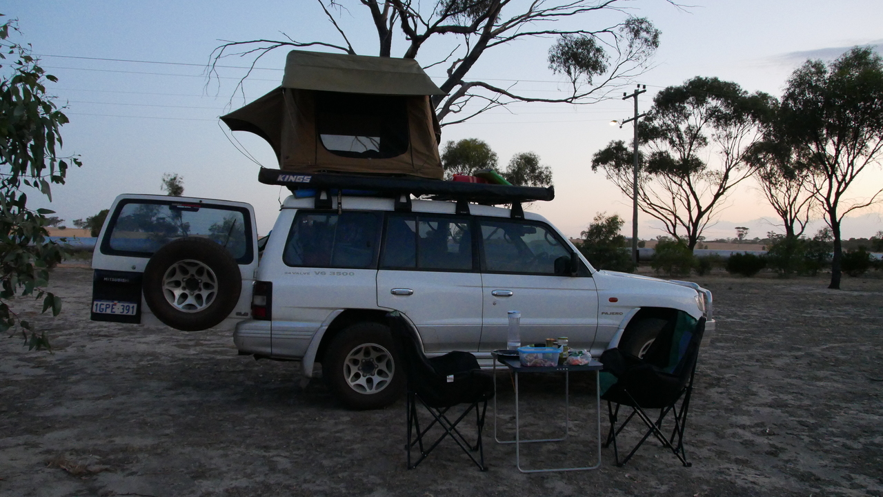 Auf dem Rastplatz im Ort mit dem schönen Namen Meckering war es tagsüber 38 Grad und bei Sonnenuntergang ist es immer noch 27 Grad warm - ein krasser Kontrast zum kühlen Wetter an der Südküste. Nachts erleben wir einen Showdown mit allen möglichen Camping-Widrigkeiten - Hitze, Sturm, Laternenlicht, tosenden Road Trains, Regen und Kälte – und schlafen trotzdem überraschend gut. Was wir zu dem Zeitpunkt noch nicht wussten: es sollte unsere letzte Nacht im Dachzelt auf dem Paji sein.