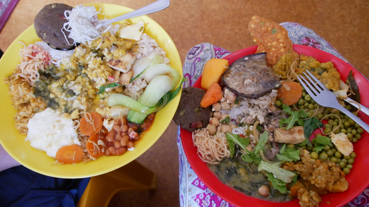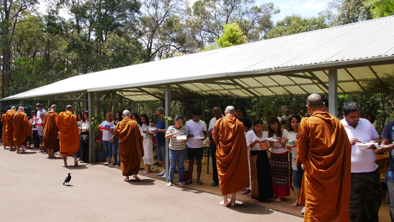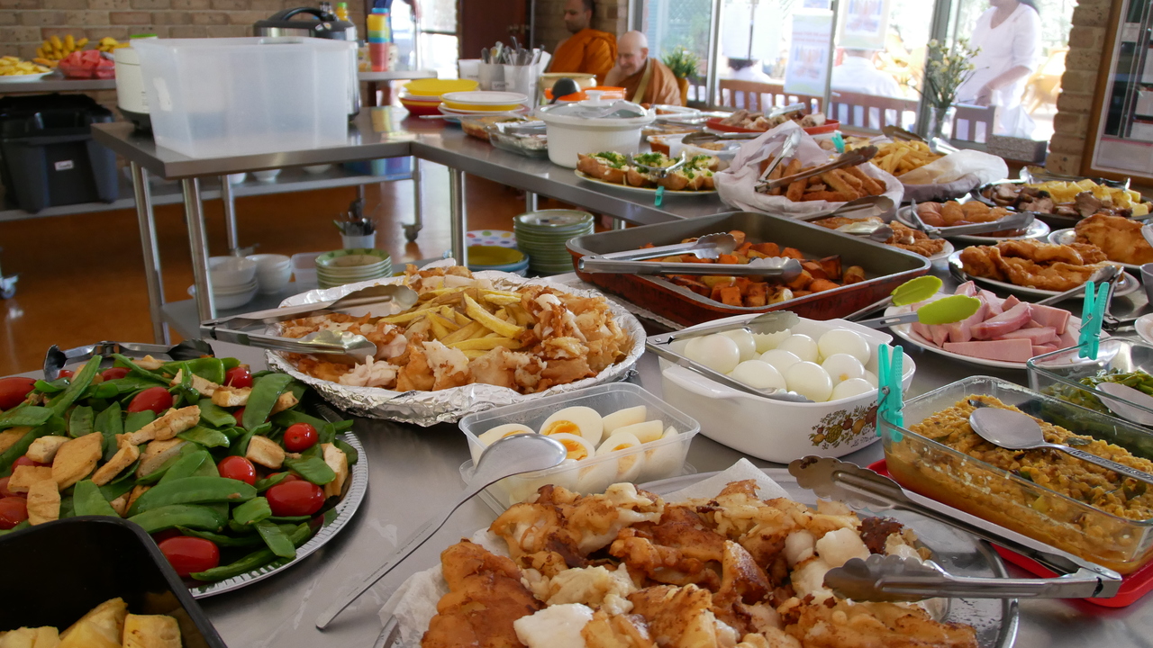 Um 10:40 Uhr gehen die Mönche die Reihe der Besucher entlang, die jedem von ihnen einen Löffel Reis in ihre Schüssel geben. Nach der Spendenzeremonie bedienen sich zunächst die Mönche am Buffet, das die buddhistische Gemeinde gespendet haben. Es ist für sie letzte Mahlzeit des Tages, da sie gemäß der Theravada-Tradition zwischen dem Sonnenhöchststand und dem nächsten Morgengrauen fasten. Im Speisesaal der Mönche unterhält sich Abt Ajahn Brahm angeregt und locker mit den Besuchern. Es folgt ein buddhistisches Gebet und Gesang in Pali. Dann ist das Buffet für alle eröffnet, das einen vielseitigen Streifzug durch die asiatische Küche darstellt: indische Curries, thailändische Nudelgerichte und vietnamesische Reispapierrollen reihen sich neben allerlei bunten Suppen und Salaten aneinander. Die Krönung ist das Dessertbuffet – Klebreis mit Mango, Kuchen aller Art und üppige Platten mit Südfrüchten.