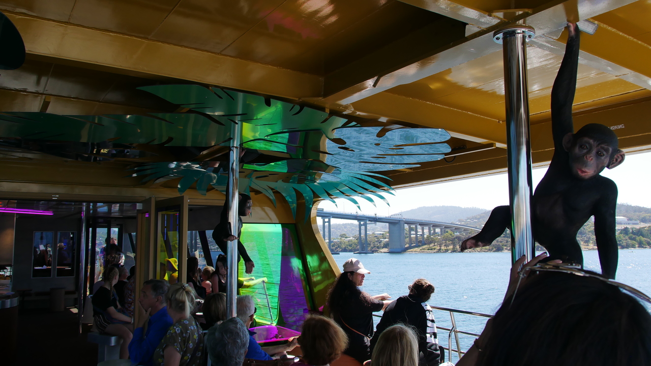 Gerade noch rechtzeitig erwischen wir die Mona-Roma-Fähre und suchen uns draußen ein Plätzchen zwischen den anderen Passagieren, die auf Schafen und Tigern Platz genommen haben. So erreichen wir über den Derwent River das Musem of modern and old art - kurz Mona. Schon das Gebäude ist ein Kunstwerk: in den Berg gebaut gibt es den Blick aufs offen liegende Gestein frei. Mehrere Stockwerke unter der Erde erinnert die Cocktailbar mit ihren bunt zusammengewürfelten Sesseln und Thrönen an einen exquisiten Club und selbst die Toiletten sind individuell designed. Per iPod touch bekommen wir multimediale Infos zu der ausgestellten subversiven Kunst – von Nachkriegswerken mit lichtkinetischen Effekten der Düsseldorfer Künstlergruppe ZEO über einen Space-Gang, Simulationen von Demenz, Teilchenbeschleunigern und Verdauungsapparaten bis hin zu einem Lebenswerk durch ein Labyrinth mit einem Schock-Erlebnis. Das Mona spricht alle Sinne an, gibt Impulse zum Nachdenken und hat mehr von einem Erlebnispark für Erwachsene als von einem Museum. Ein weiteres Highlight ist eine grandiose Vorführung von Les Misérables im Playhouse Theater.