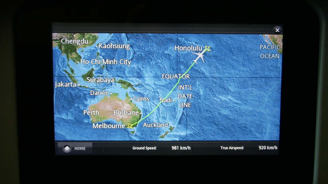 Datumsgrenze. Der 13. Februar beginnt für uns zum zweiten Mal. Dass wir für den zehnstündigen Flug nach Hawaii nur 250 Euro pro Kopf bezahlt haben, merkt man daran, dass es weder Essen noch Getränke gibt. Nur Wasserflaschen werden auf Nachfrage aufgefüllt. Auch Filme kosten bei der Billig-Airline Jetstar extra, was es den meisten Passagieren wert zu sein scheint. Wir schlafen die meiste Zeit und haben gemütlicherweise drei Sitze für uns.