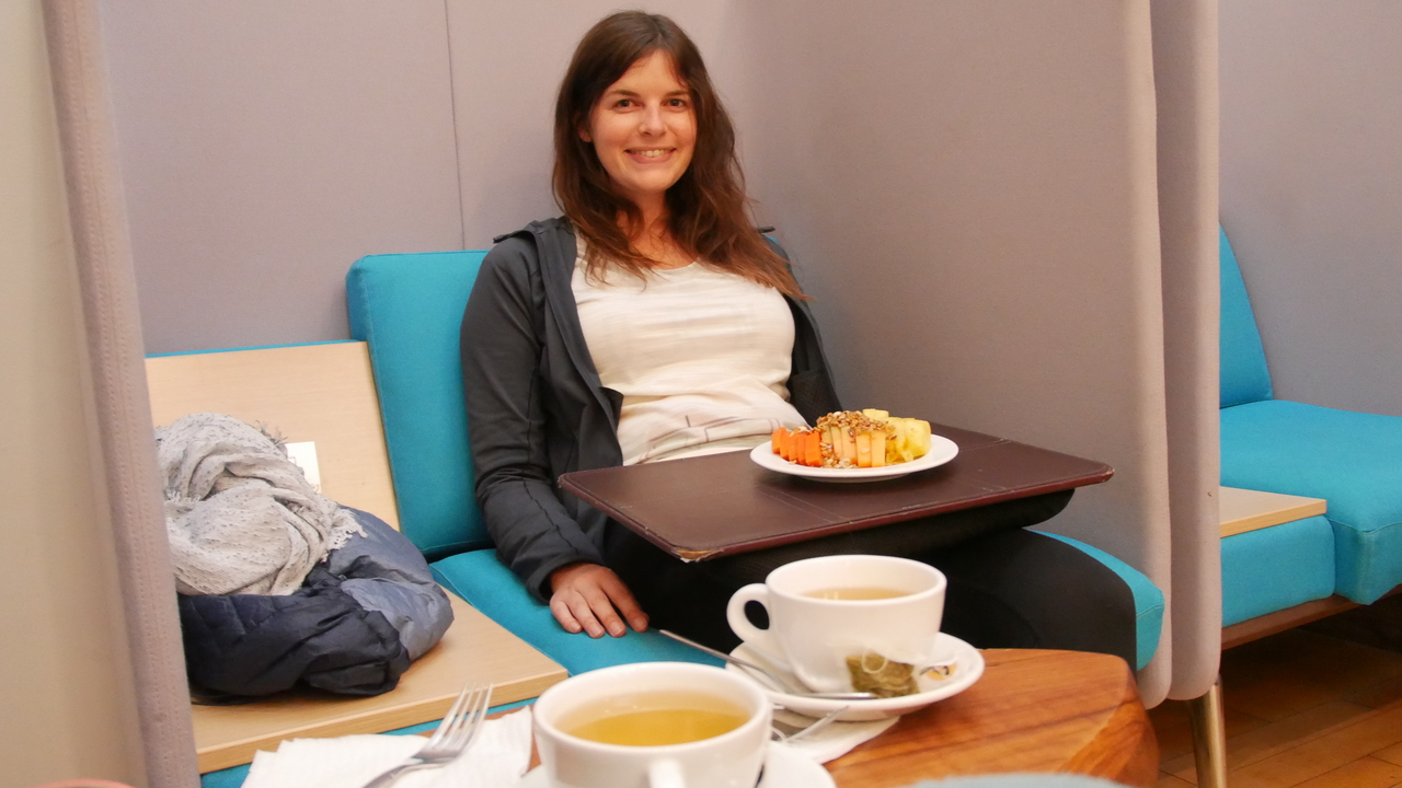 Mexico City. Auf unser mexikanisches Frühstück warten wir ein ganzes Weilchen, Tacos mit Bohnenpaste und Blaubeerpfannkuchen. Anschließend chillen wir in einer Lounge, wo wir uns nach Hobbit-Art noch ein zweites und drittes Frühstück mit leckerem Obst gönnen und die bequemen Sessel genießen. Zwischendurch werden uns Zeitslots für eine Dusche und sogar eine Massage versprochen, aber beides scheitert letztlich doch irgendwie an der lateinamerikanischen Unverbindlichkeit und schon sind die zwei Stunden Lounge-Aufenthalt vorbei. Egal.
