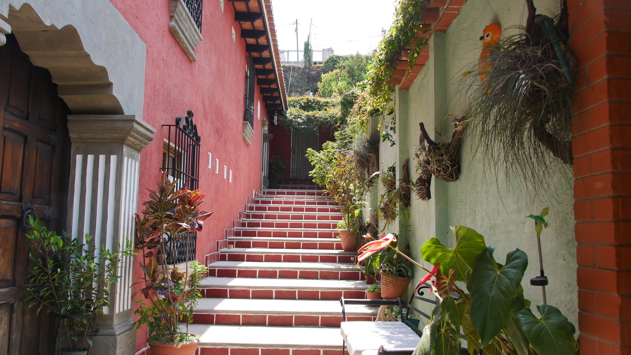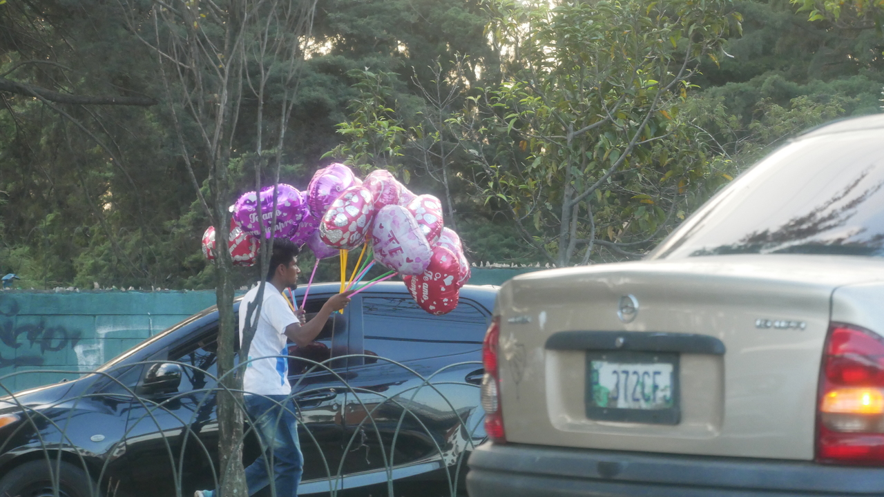 Guatemala City. Noch bevor wir unser Gepäck entgegen nehmen, erstehen wir für alle Fälle zwei billige Smartphones mit guatemaltekischen SIM-Karten. Die junge Dame lässt sich alle Zeit der Welt, bis eine Flughafenmitarbeiterin kommt und uns darauf hinweist, dass sie nicht länger auf unsere Gepäckstücke aufpassen möchte. Also geht Anna durch die Passkontrolle, wo drei Mitarbeiter zwei Gepäckstücke bewachen. Eins ist unseres, das andere nicht. Entspannt schultert der junge Mann den Rucksack und die drei gehen von dannen, nachdem sie betont haben, dass es harte Arbeit sei, das Gepäck zu bewachen. Vermutlich haben sie dafür ein Trinkgeld erwartet. Selbst wenn wir willens gewesen wären, ihre harte Arbeit zu honorieren, wäre der Geldautomat am Flughafen dennoch außer Funktion gewesen. Per Sammeltaxi fahren wir durch die endlosen Weiten der grauen Guatemala-Stadt, wo Straßenverkäufer zum Valentinstag rosa Herzluftballons verkaufen. Schließlich rumpeln wir im hübschen Kolonialstädtchen Antigua über das Kopfsteinpflaster.